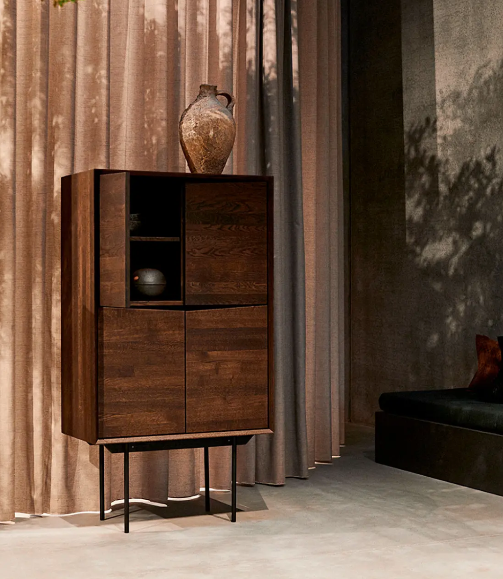 The Wing tall cabinet is made from solid oak wood - a durable material that will last for many years, with a perfect combination of this robust material and the light and minimalist design. This piece of furniture is divided into four sections, each of which has shelves that can be adjusted and placed at the desired height.