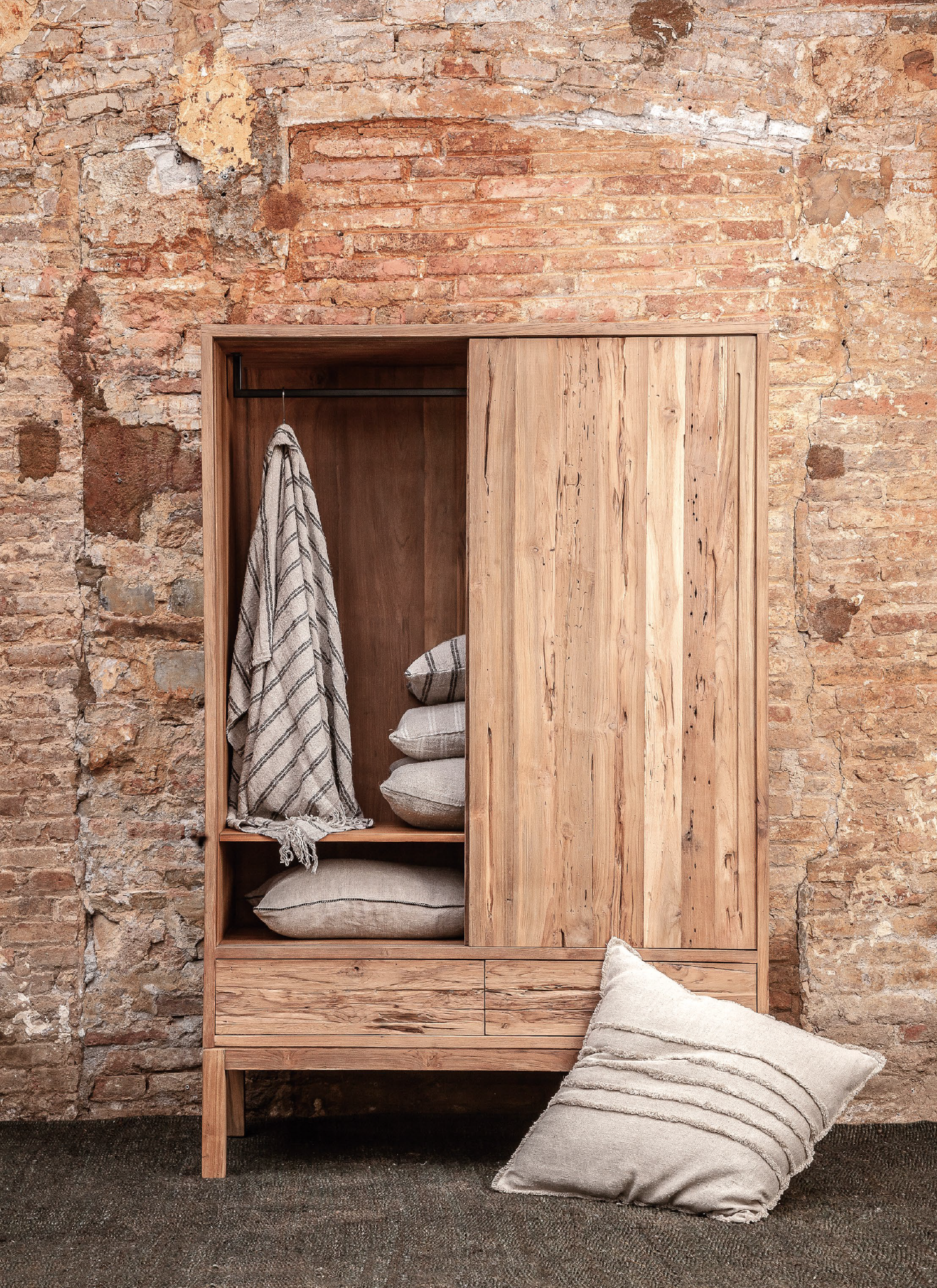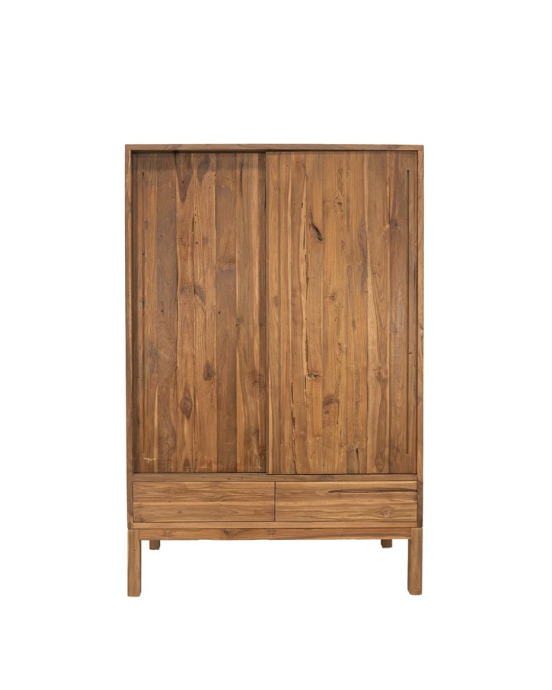 The Erosi cabinet is a solid natural recycled teak wood cabinet, with a rustic style and strong presence. With two large sliding doors, a clothes rail, an interior shelf, and two very functional drawers. A piece that is characterized by the use of noble and sustainable materials embellished by the unmistakable marks of the erosion of time.