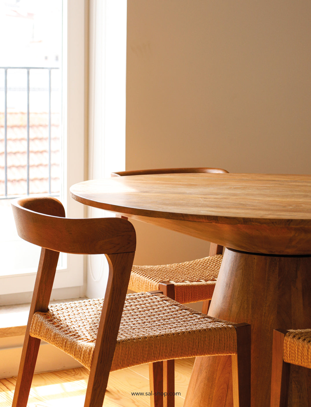 Tetra is a very comfortable wooden chair with an ergonomic backrest and seat upholstered in textured grey fabric. Its construction is simple with a wide seat supported by rustic legs that highlight the beautiful tones of the wood. Available in two shades of wood and two shades of grey upholstery.