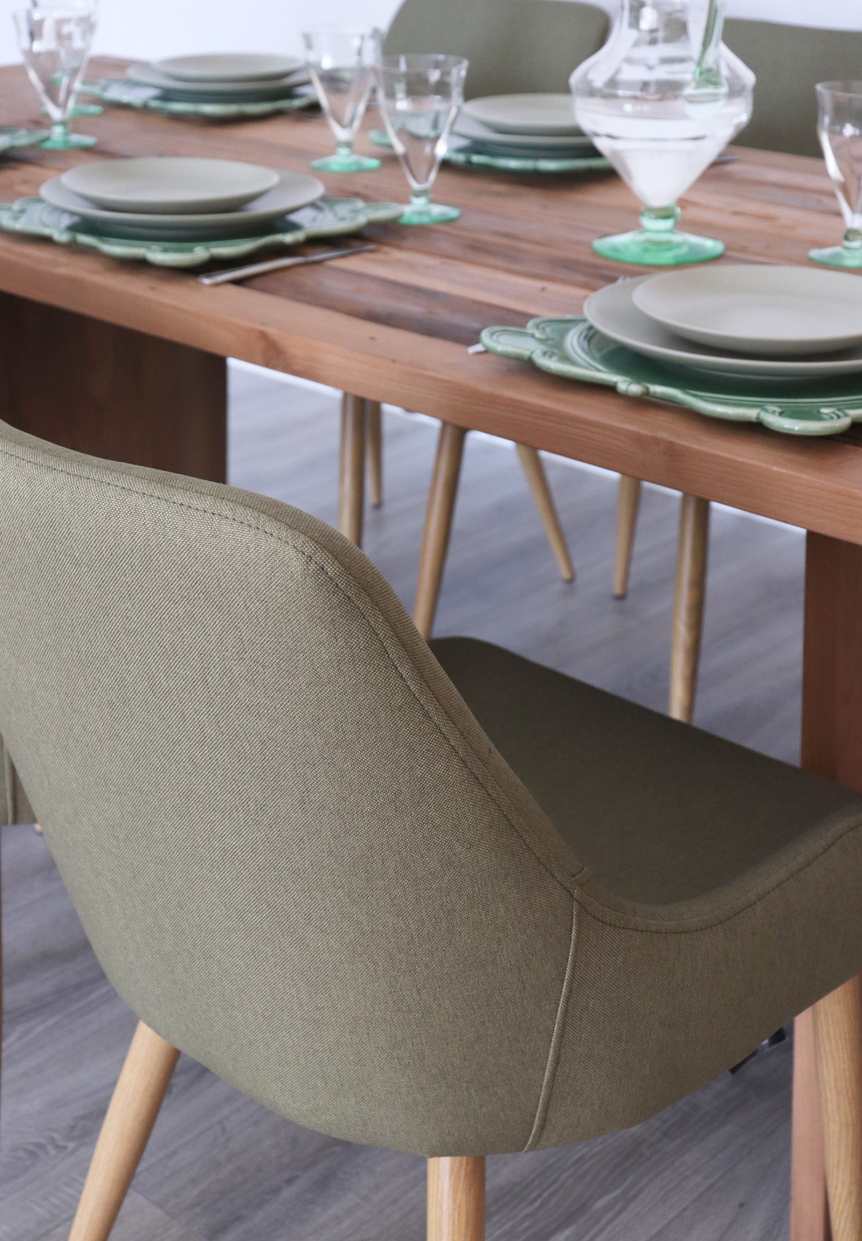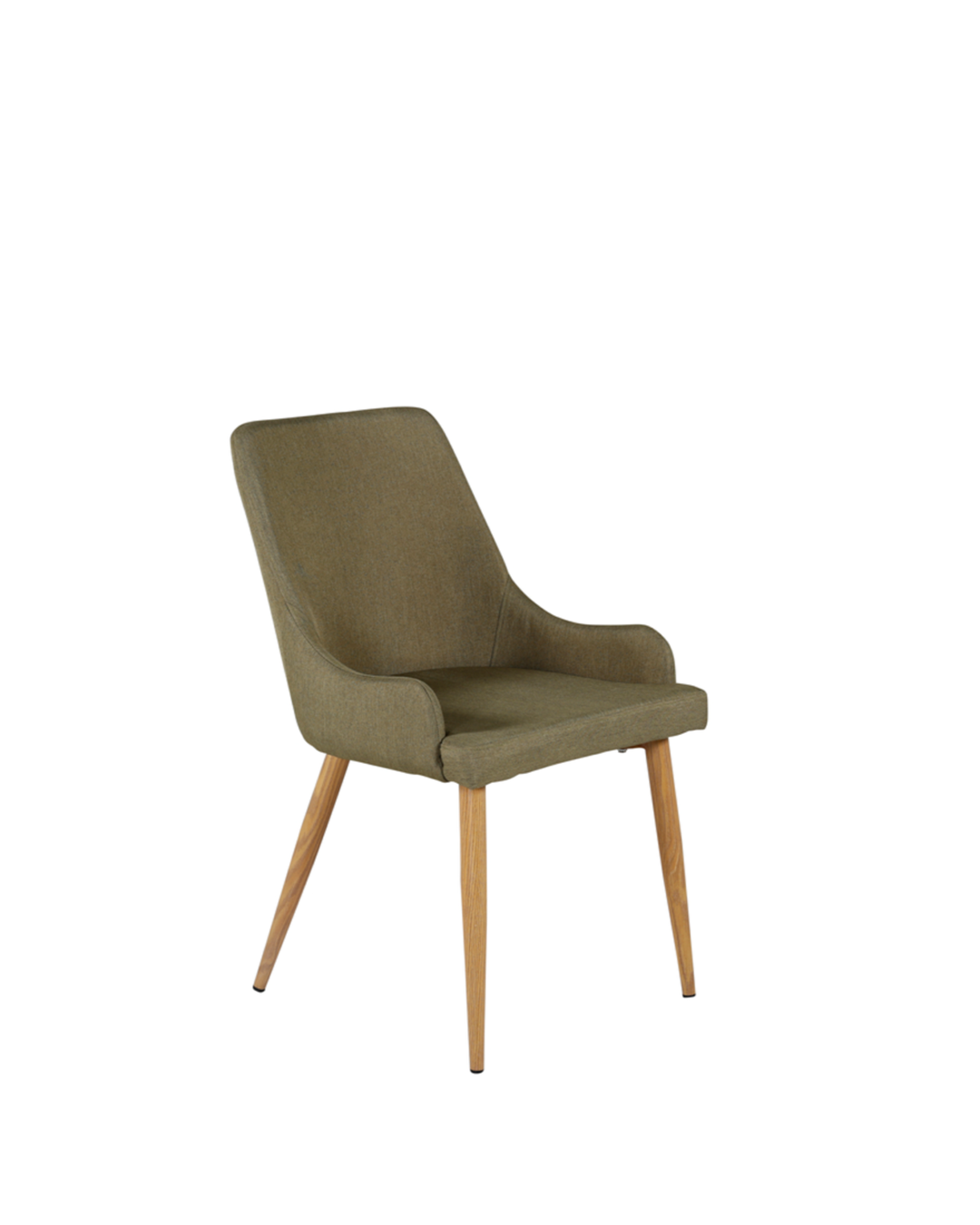 As beautiful as it is comfortable and well-proportioned, the Plaza chair with natural oak veneered legs and moss green fabric upholstery will complete your dining area. Available in other colors upon request.
