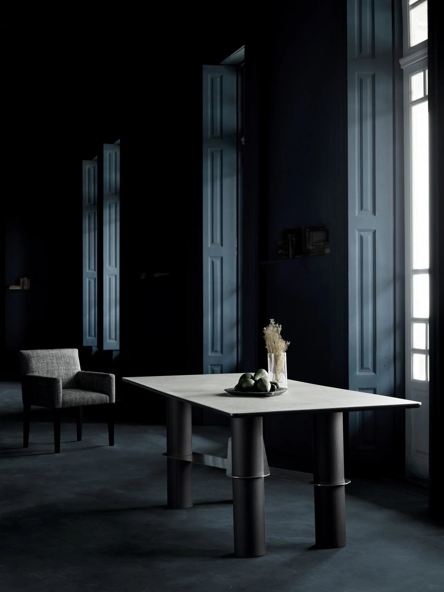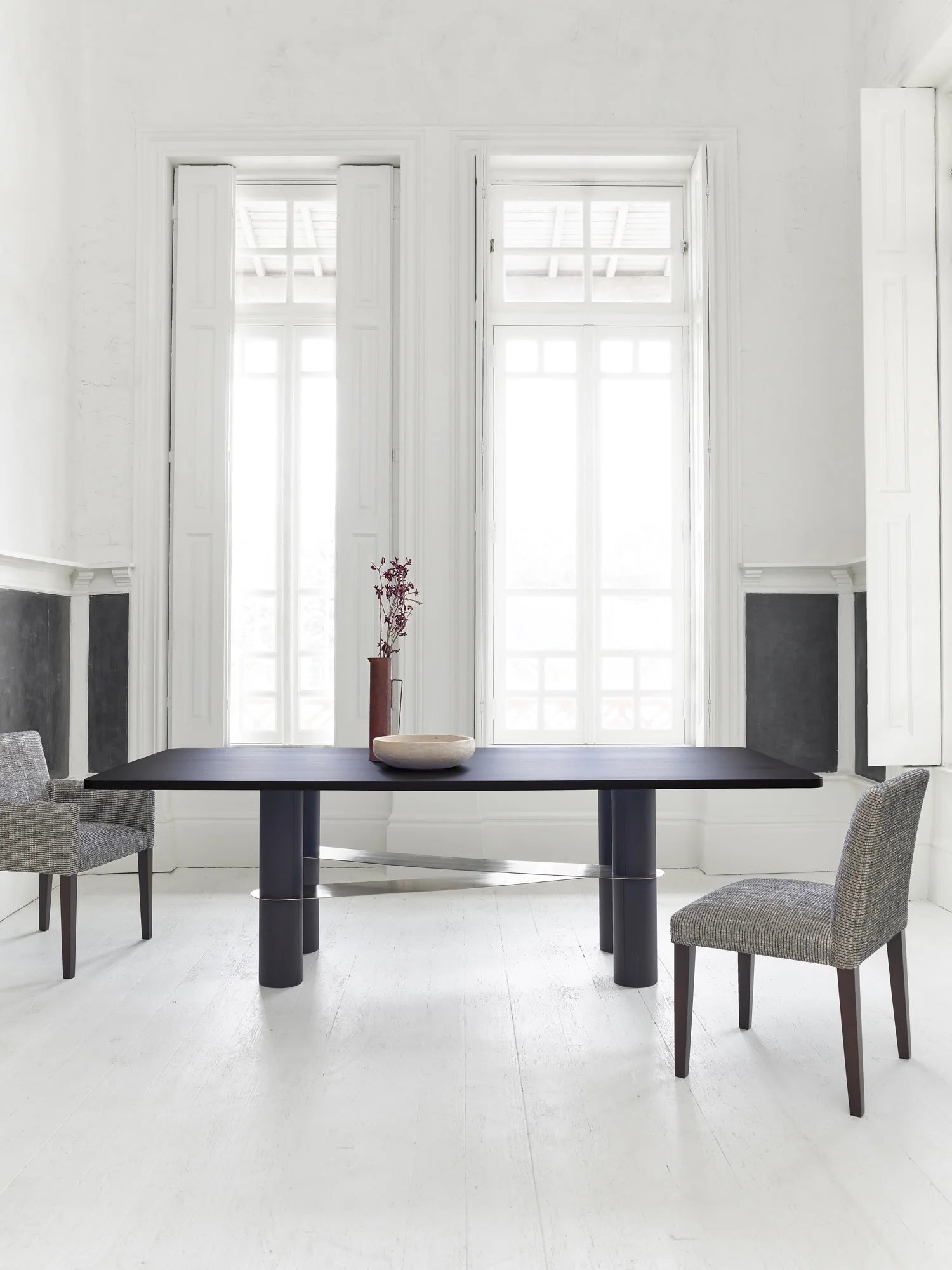 The Padda table is the kind of piece that will hardly go unnoticed. Its solid structure with four cylindrical legs joined by brushed stainless steel parts will make this table the center of attention in any dining area. It can be produced with a microcement top (warm grey) and wooden legs or entirely in oak wood with a black finish. Distinctive, without a doubt!
