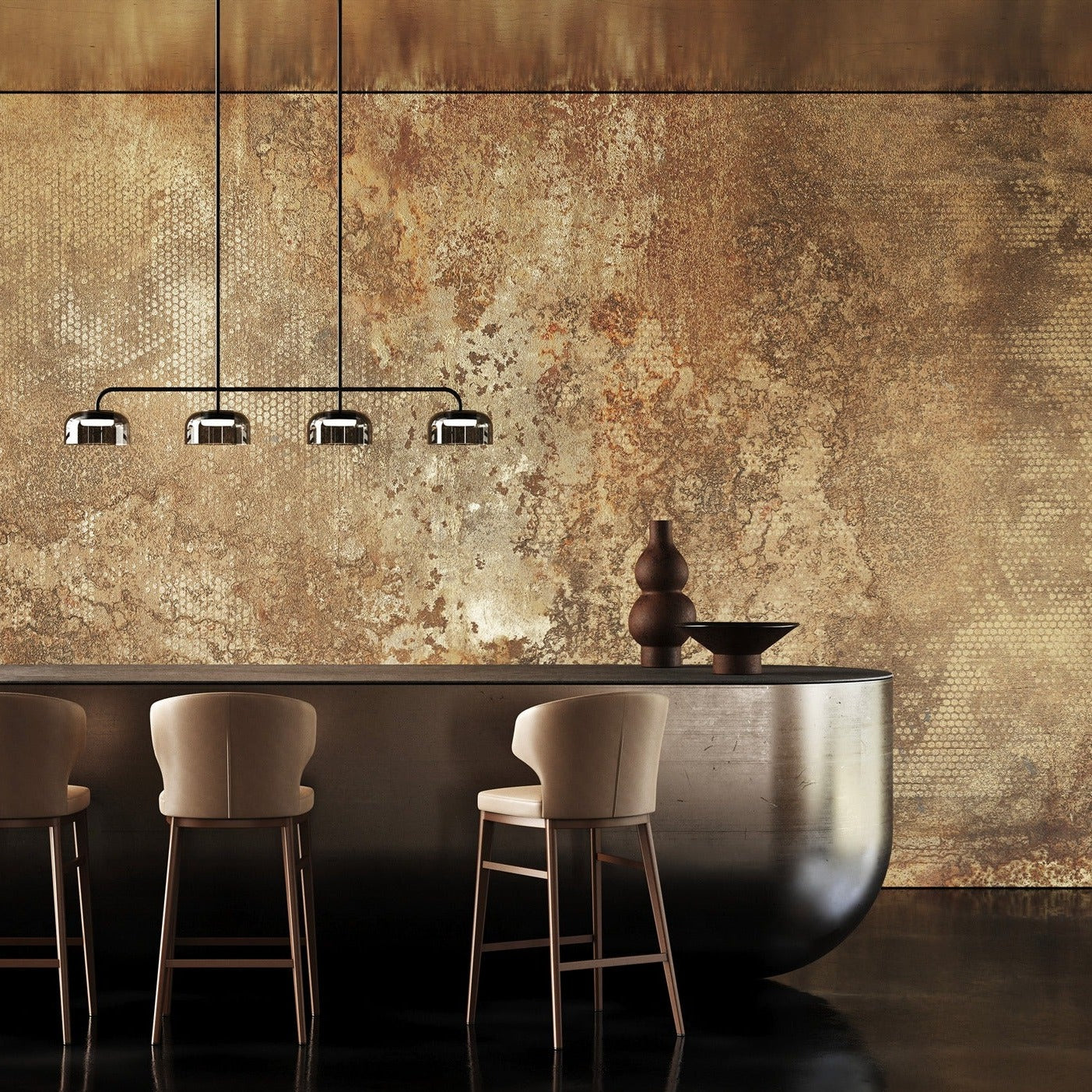 Spots and textures reproduce a wallpaper printed on gold paper. Available in 2 colors.