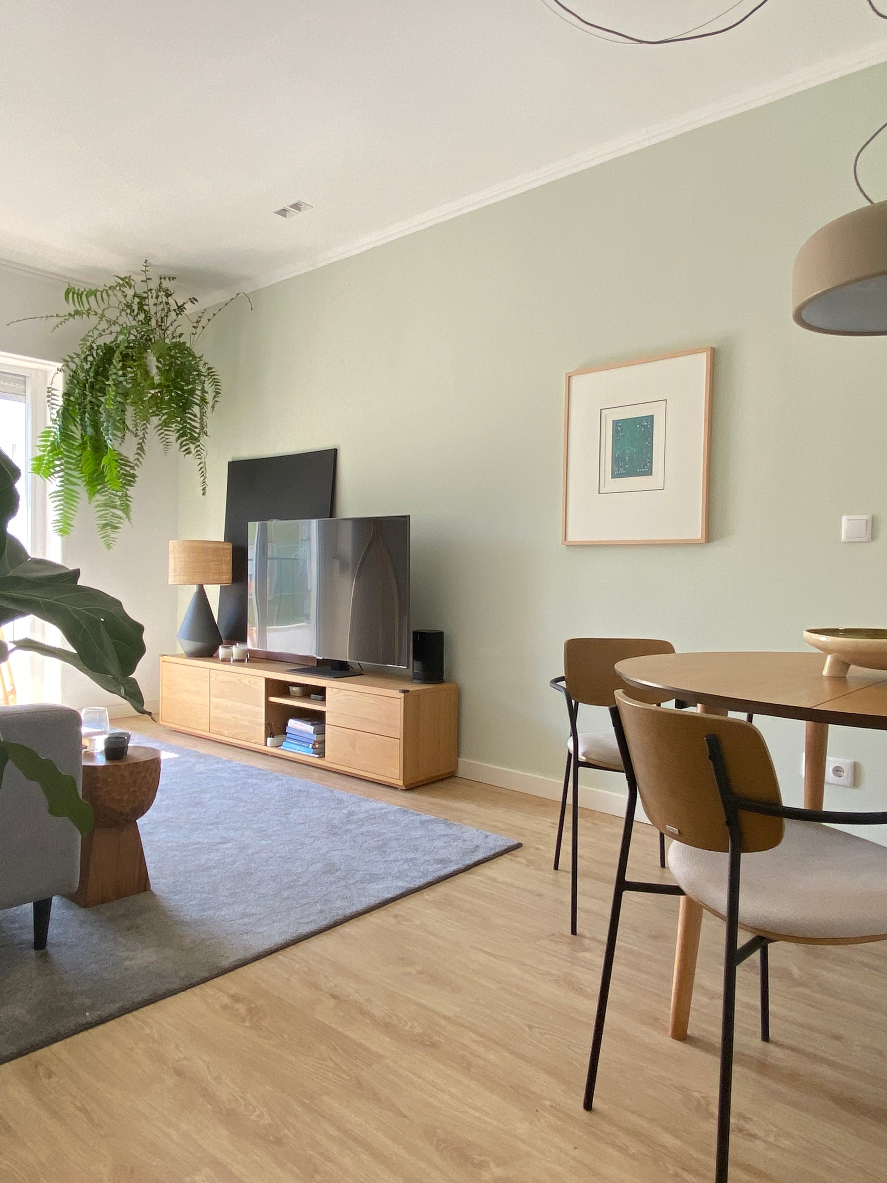 Os tons das madeiras naturais, combinados com verdes suaves e cinzas elegantes nas paredes e peças decorativas, trouxeram a coerência e harmonia essenciais a este projeto de decoração. O resultado foi um ambiente equilibrado, acolhedor e com estilo intemporal. Este projeto teve um significado ainda mais especial para nós, pois foi realizado para um cliente repetente, o que nos enche de orgulho.