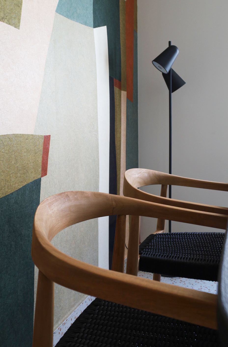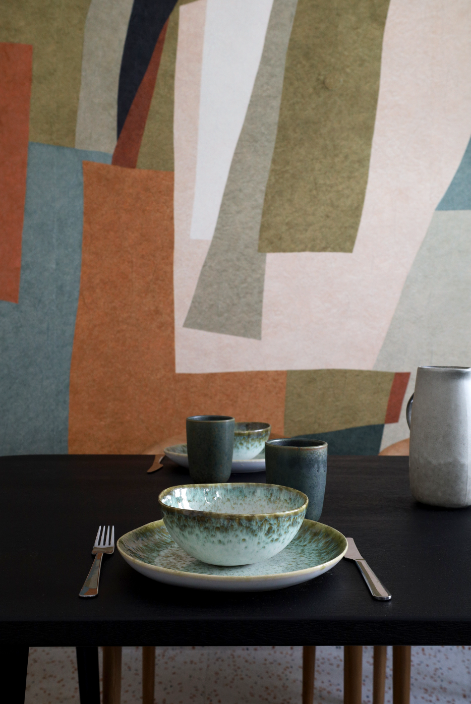 Inspirámo-nos obviamente no mar da Nazaré, nas suas diferentes tonalidades que mudam ao longo do dia. Nos azuis profundos, nos cinzas de um dia nebulado, nos verdes suaves e brancos luminosos. Para isso escolhemos o papel da Casamance com esses tons e com um padrão extremamente intenso e carismático aplicado nas paredes da zona de refeição.