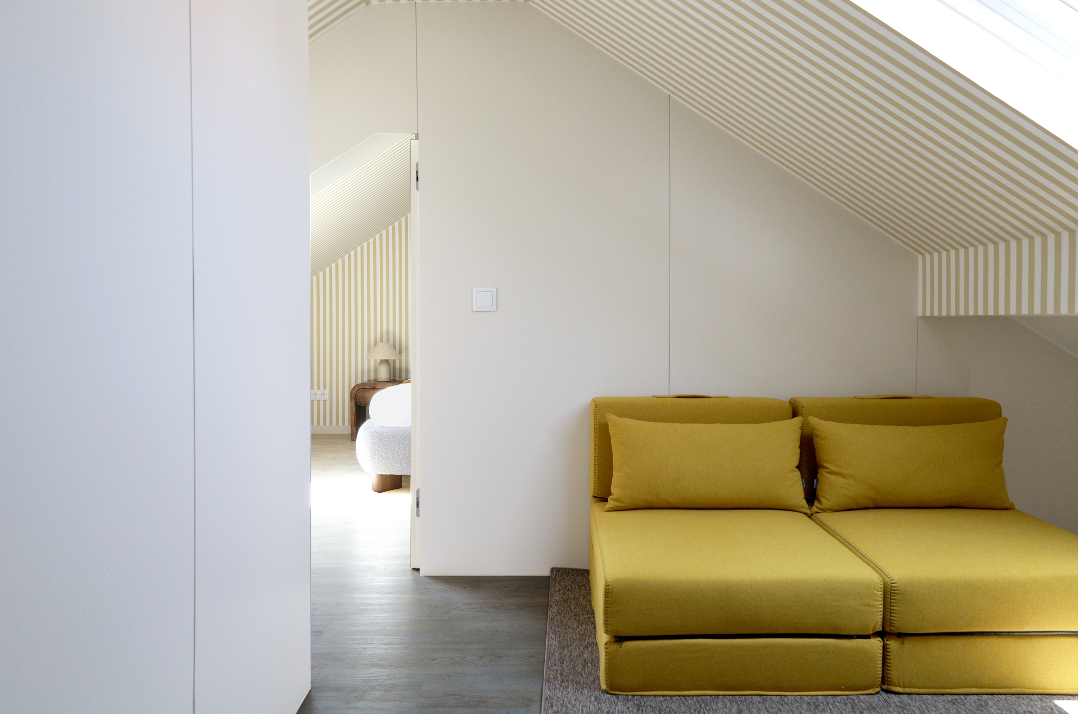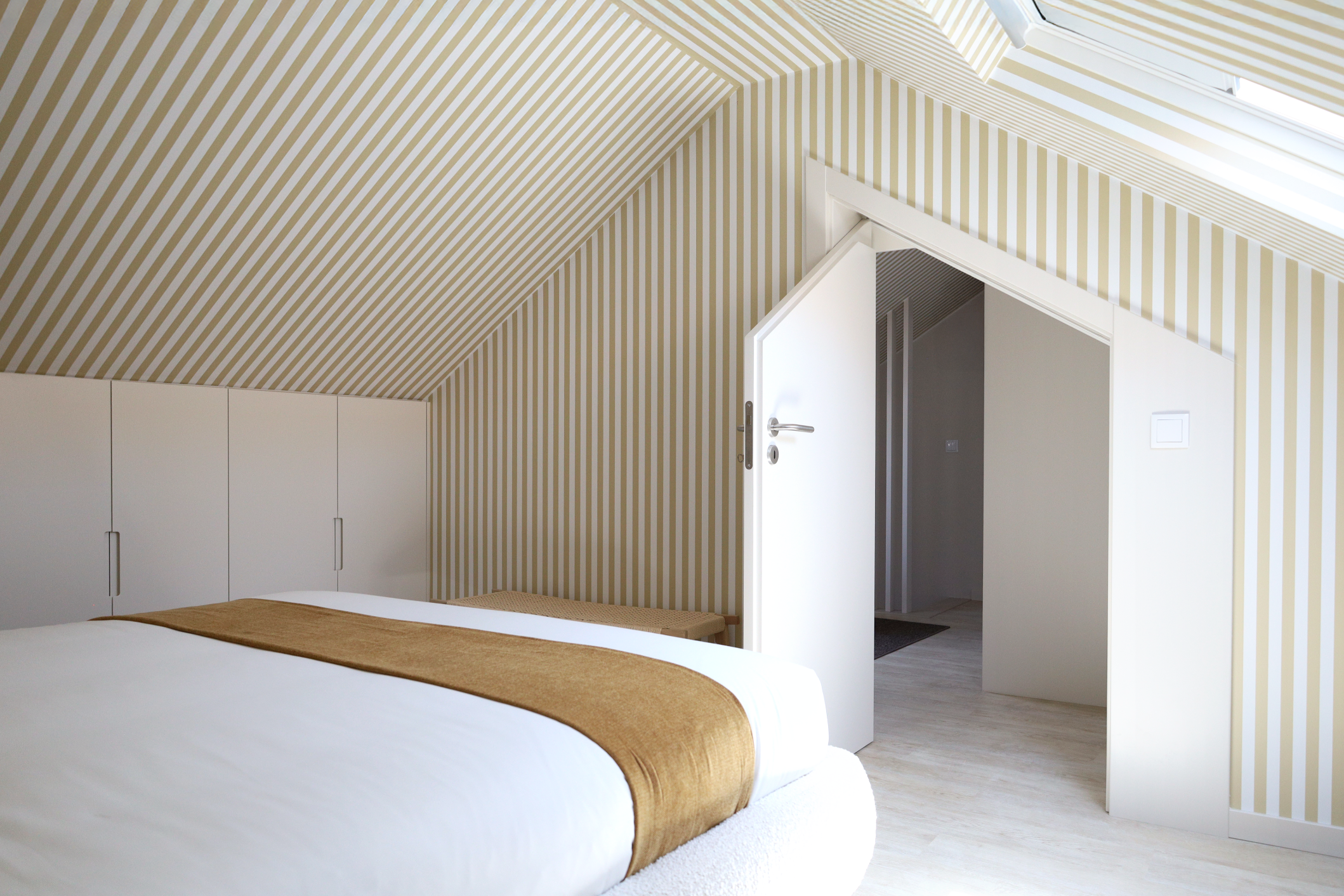 Subimos ao piso de cima e forrámo-lo integralmente com um papel às riscas como as icónicas barraquinhas da Praia da Nazaré, numa interpretação subtil que evoca o ambiente alegre e autêntico desta Costa, transformando esta área da casa num espaço extremamente acolhedor.