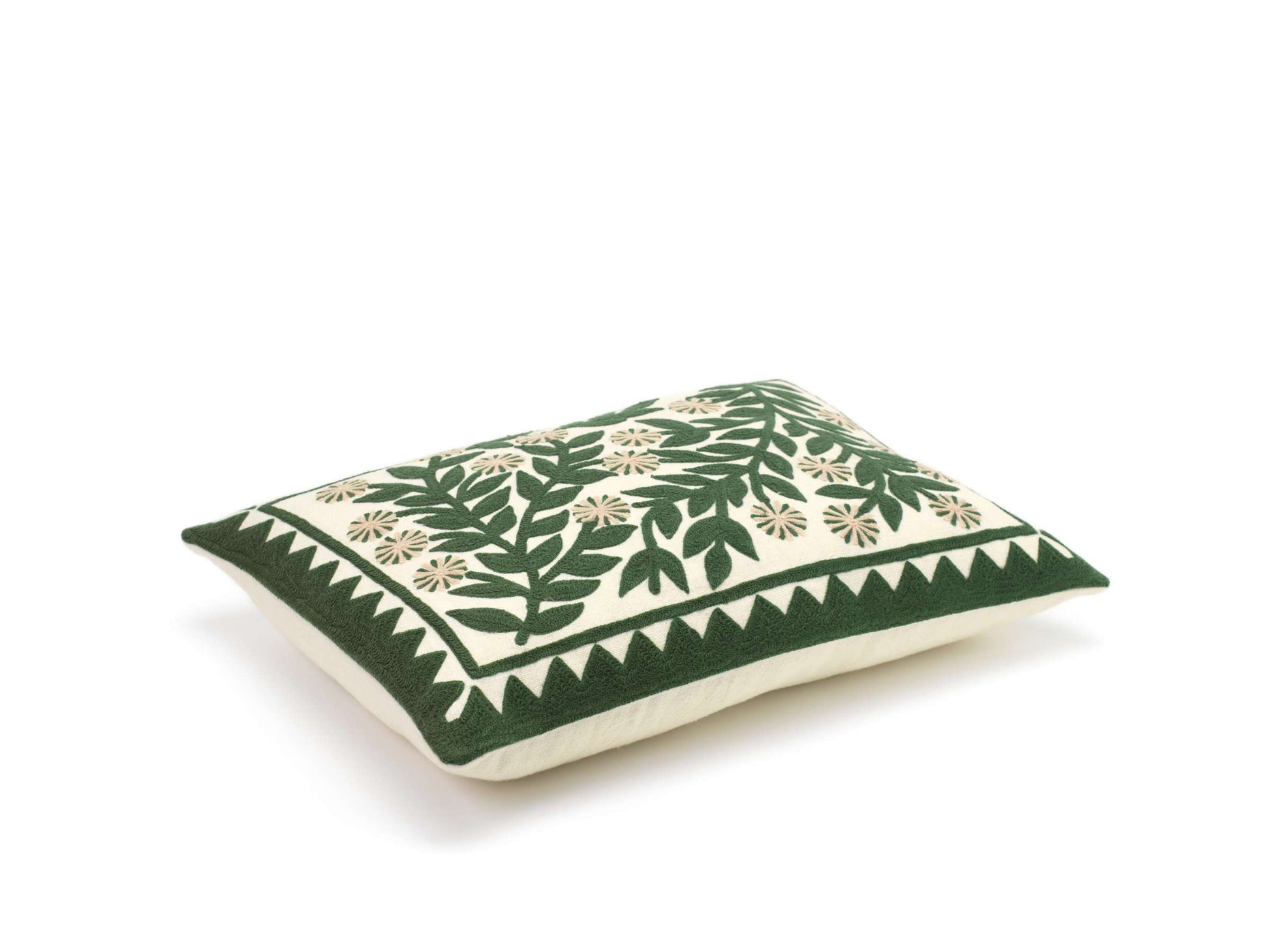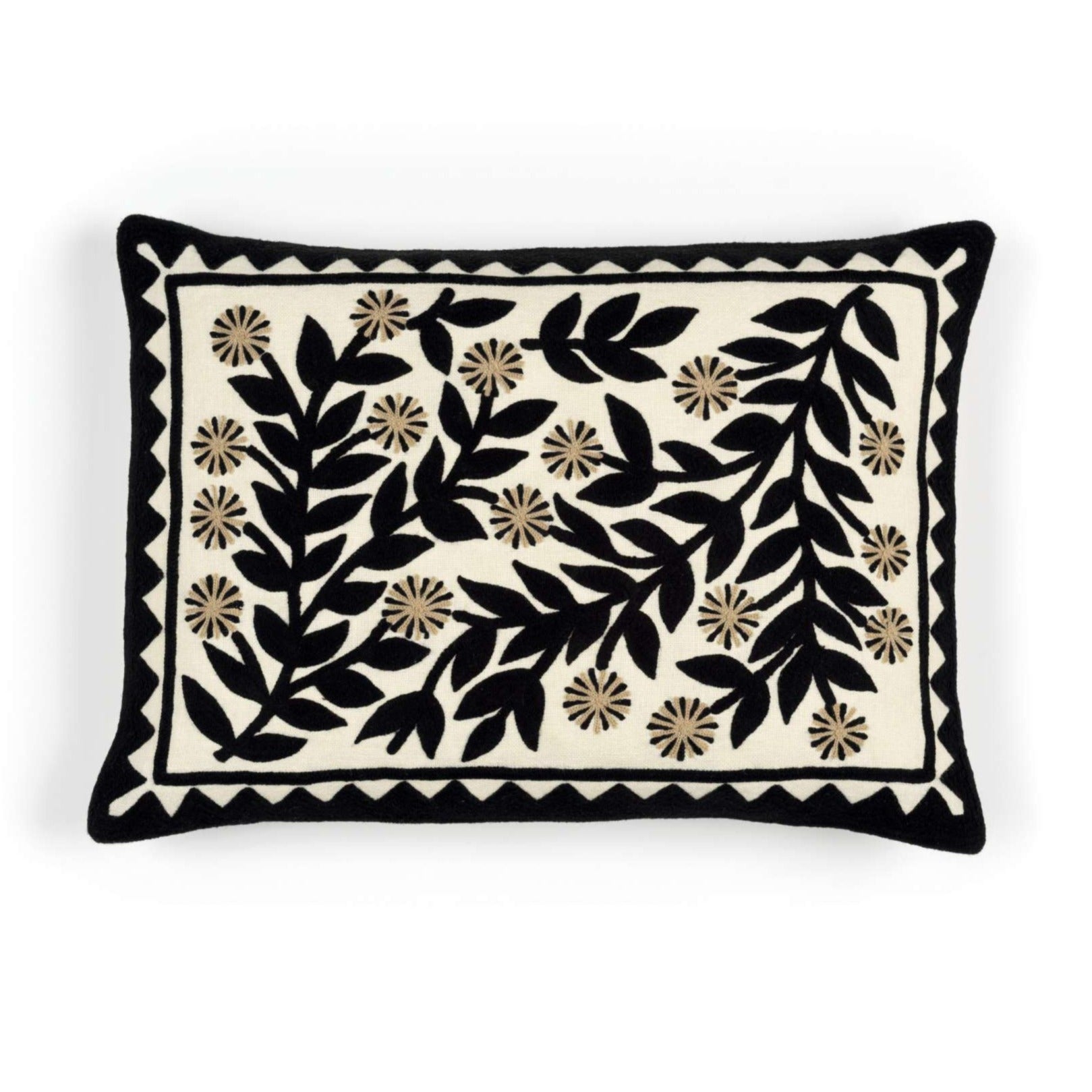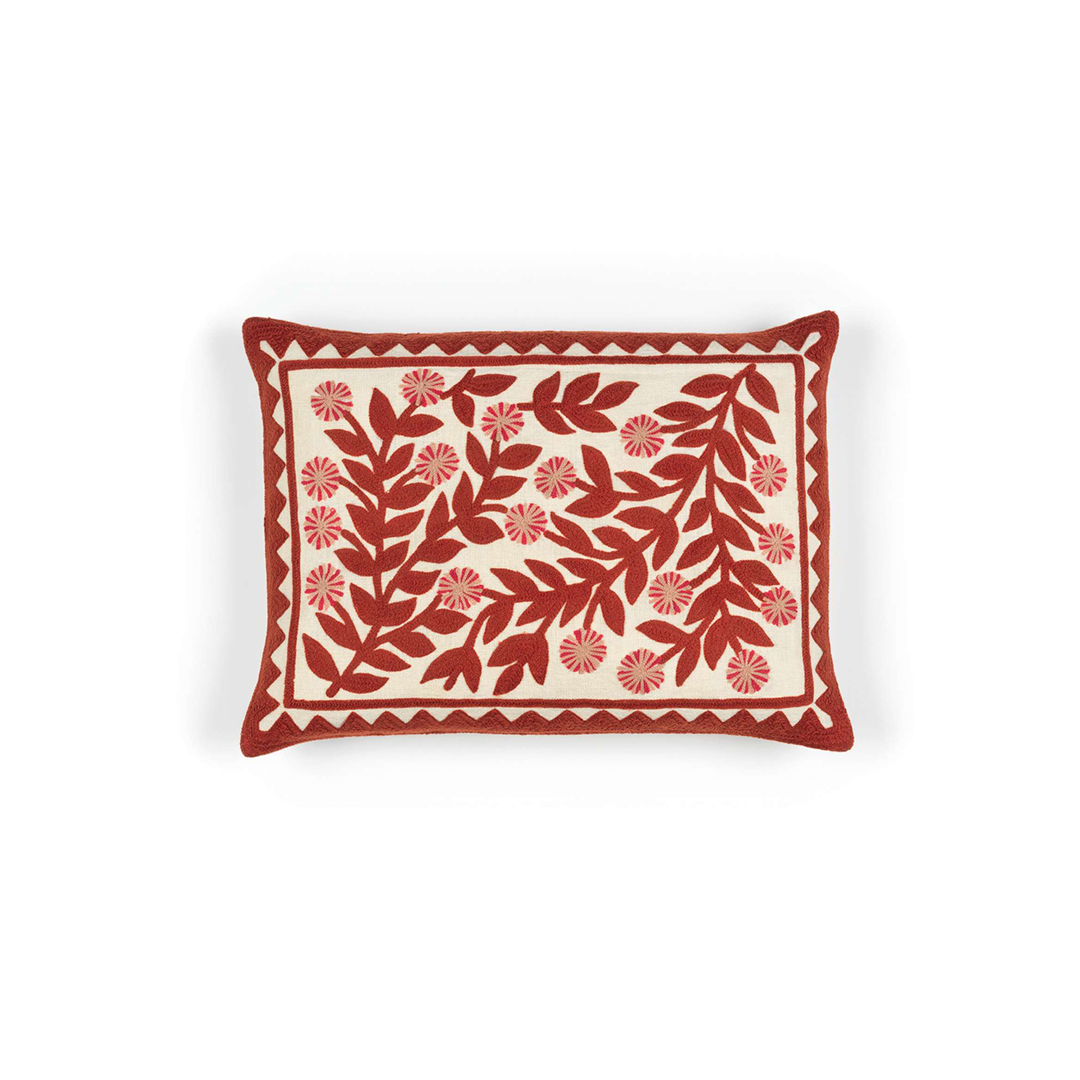 Almofada com padrão bordado num movimento dinâmico, em que flores se entrelaçam. Disponível em 4 cores.