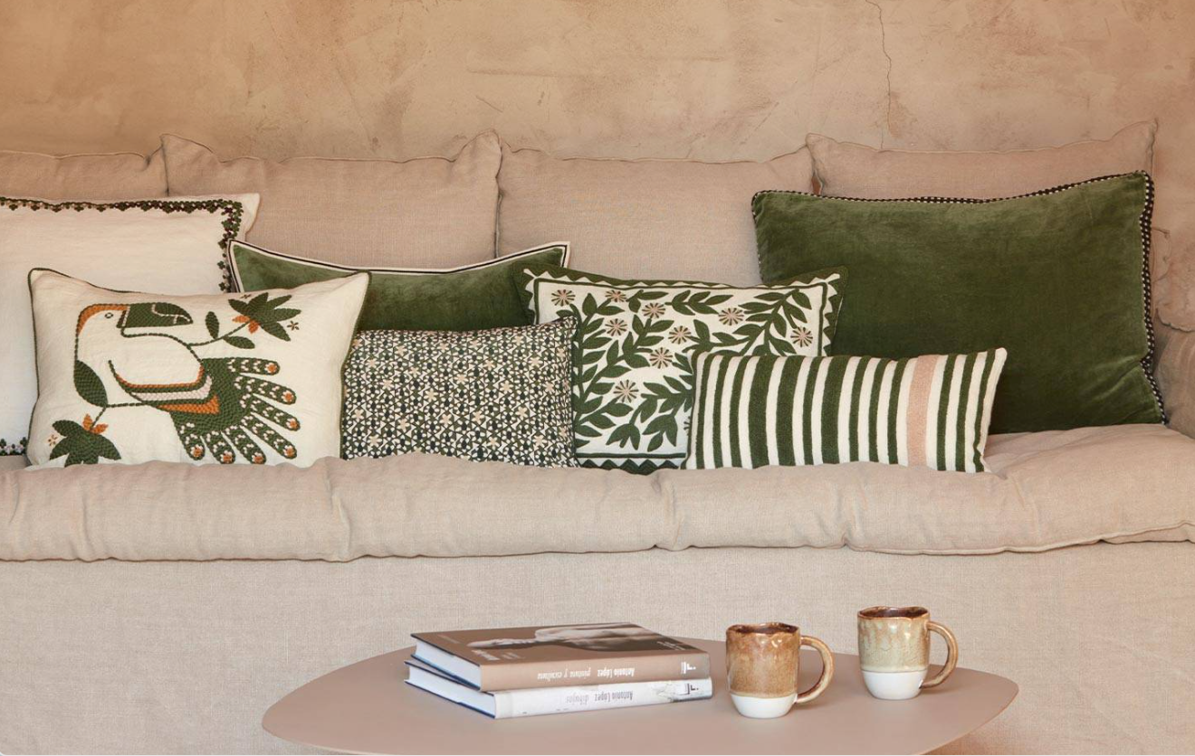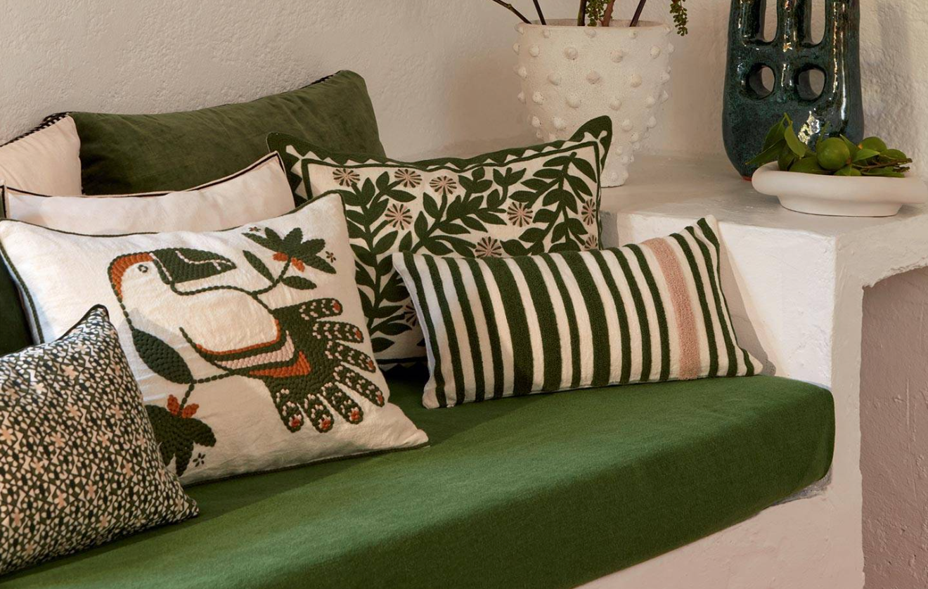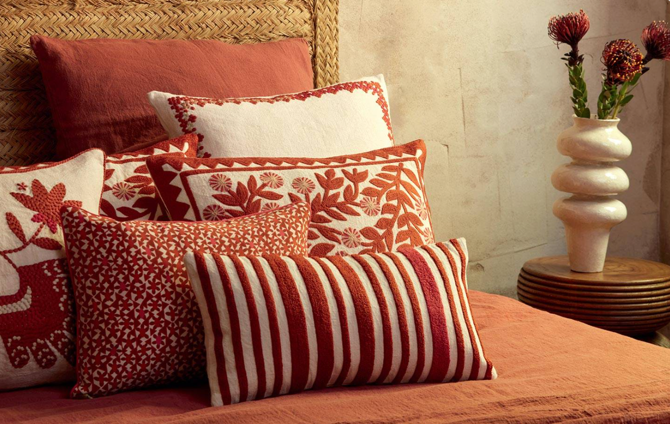 Almofada com padrão bordado num movimento dinâmico, em que flores se entrelaçam. Disponível em 4 cores.