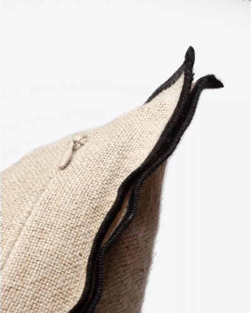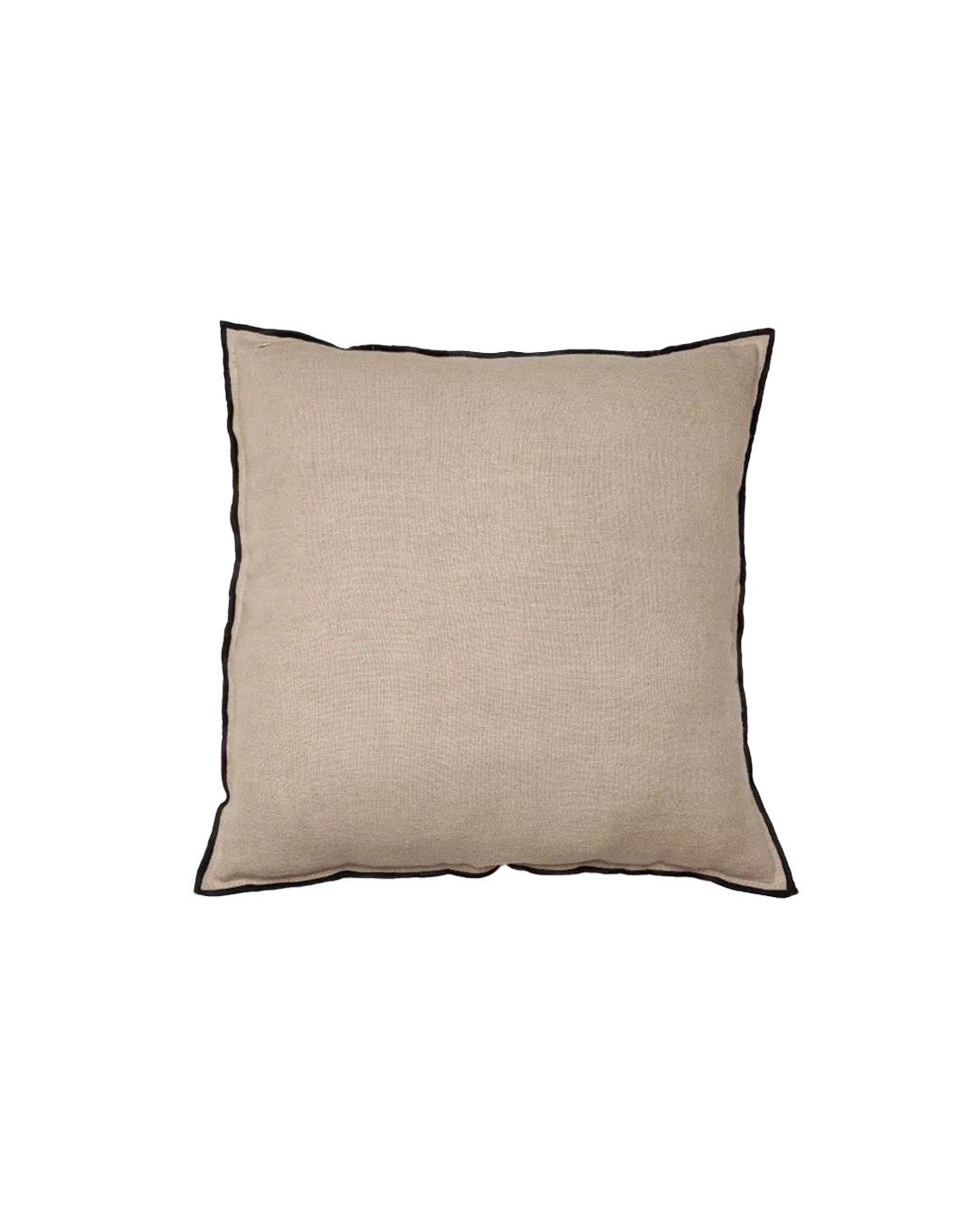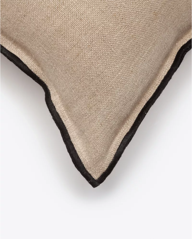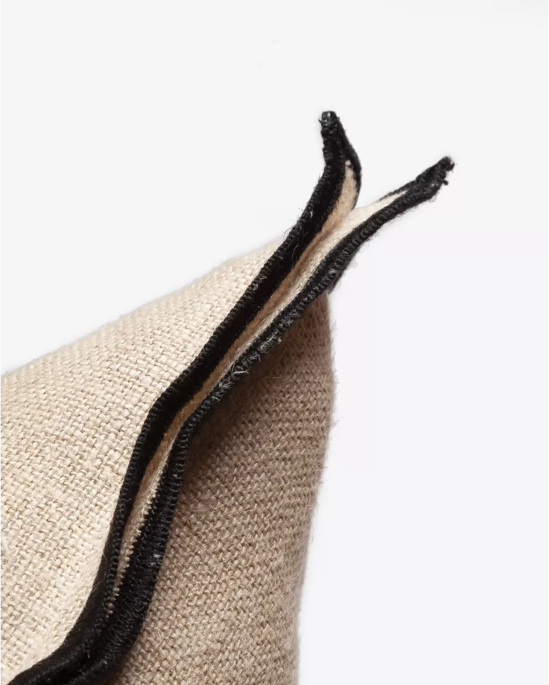 Capa de almofada PAWAI em linho em cor natural, com overloque preto bordado a preto. Esta capa é fornecida com enchimento.