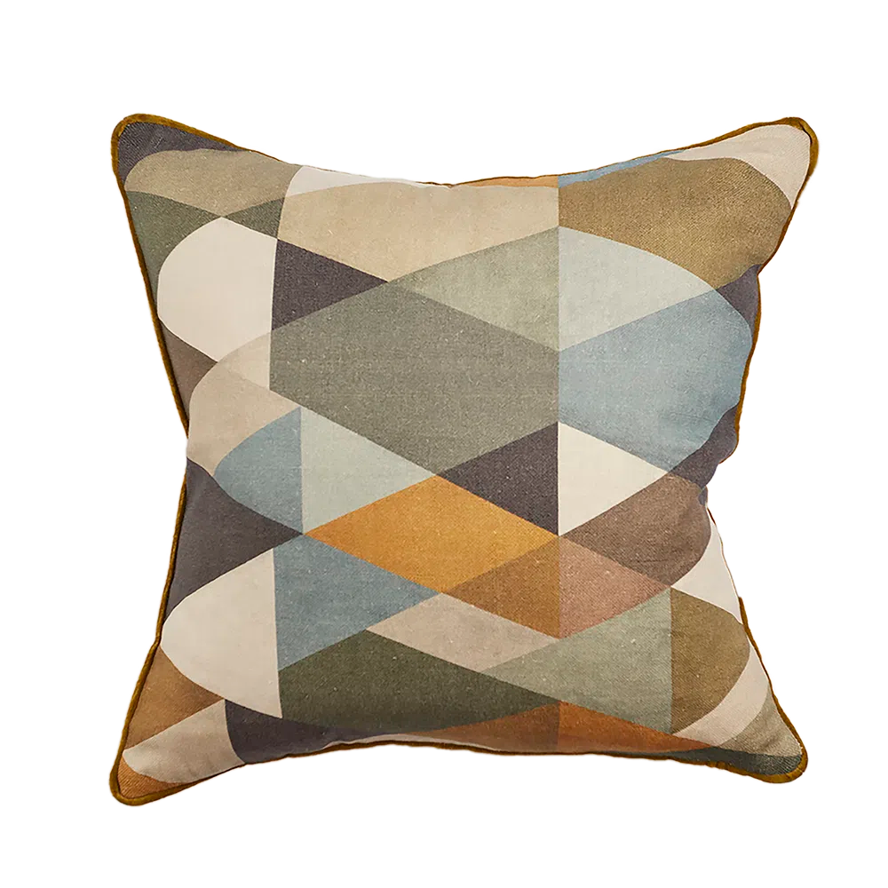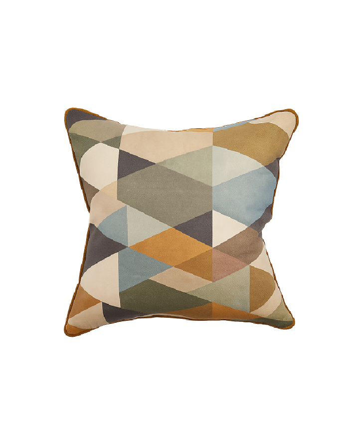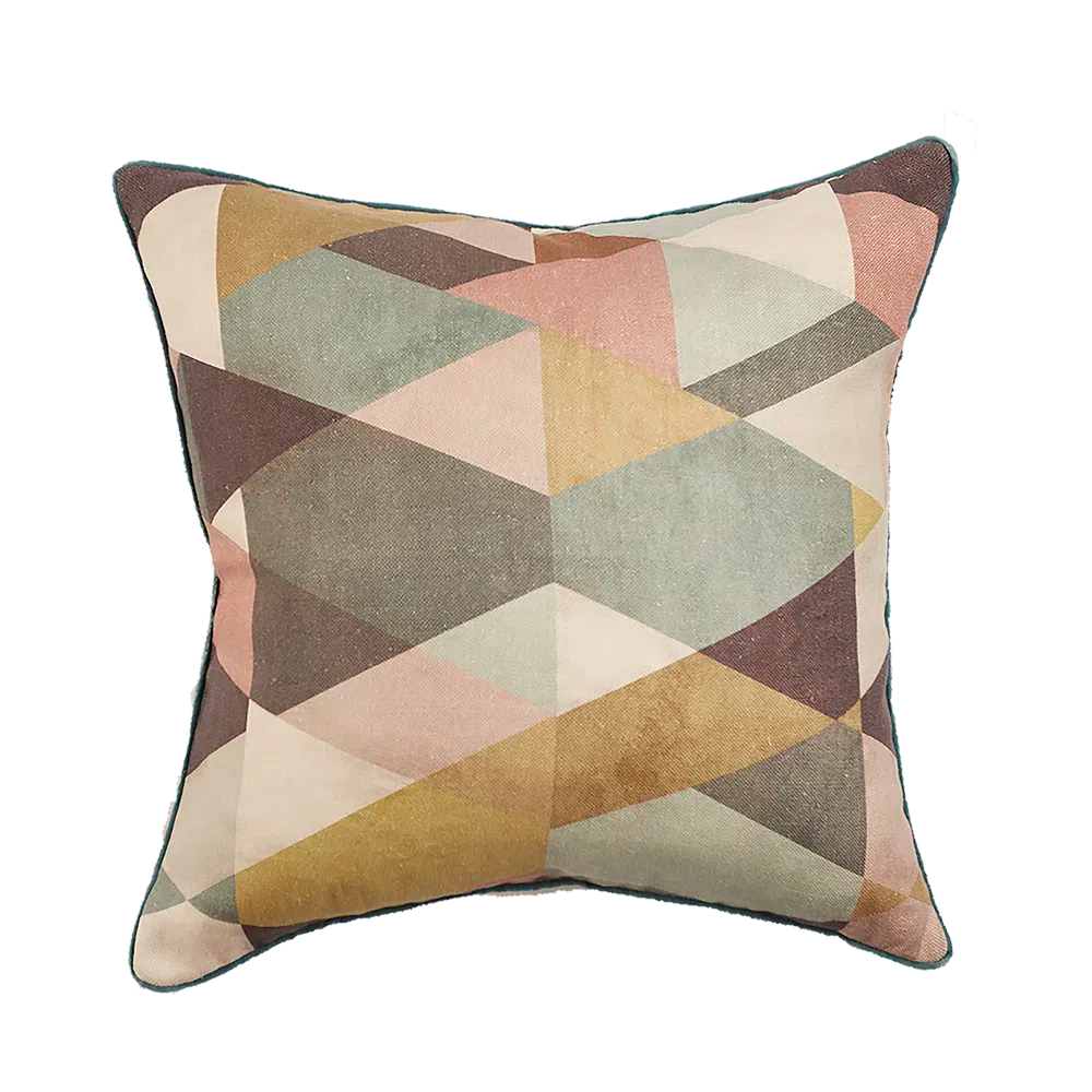 Almofada com padrão geométrico tipo Arlequim presente nos figurinos dos dançarinos de Pulcinella. Carabosse é estampada em linho, com acabamento de vivo de veludo a toda a volta. As costas são em linho e tem um fecho invisível. Fornecido com enchimento de popeline de algodão e pequenas penas do norte da Espanha.