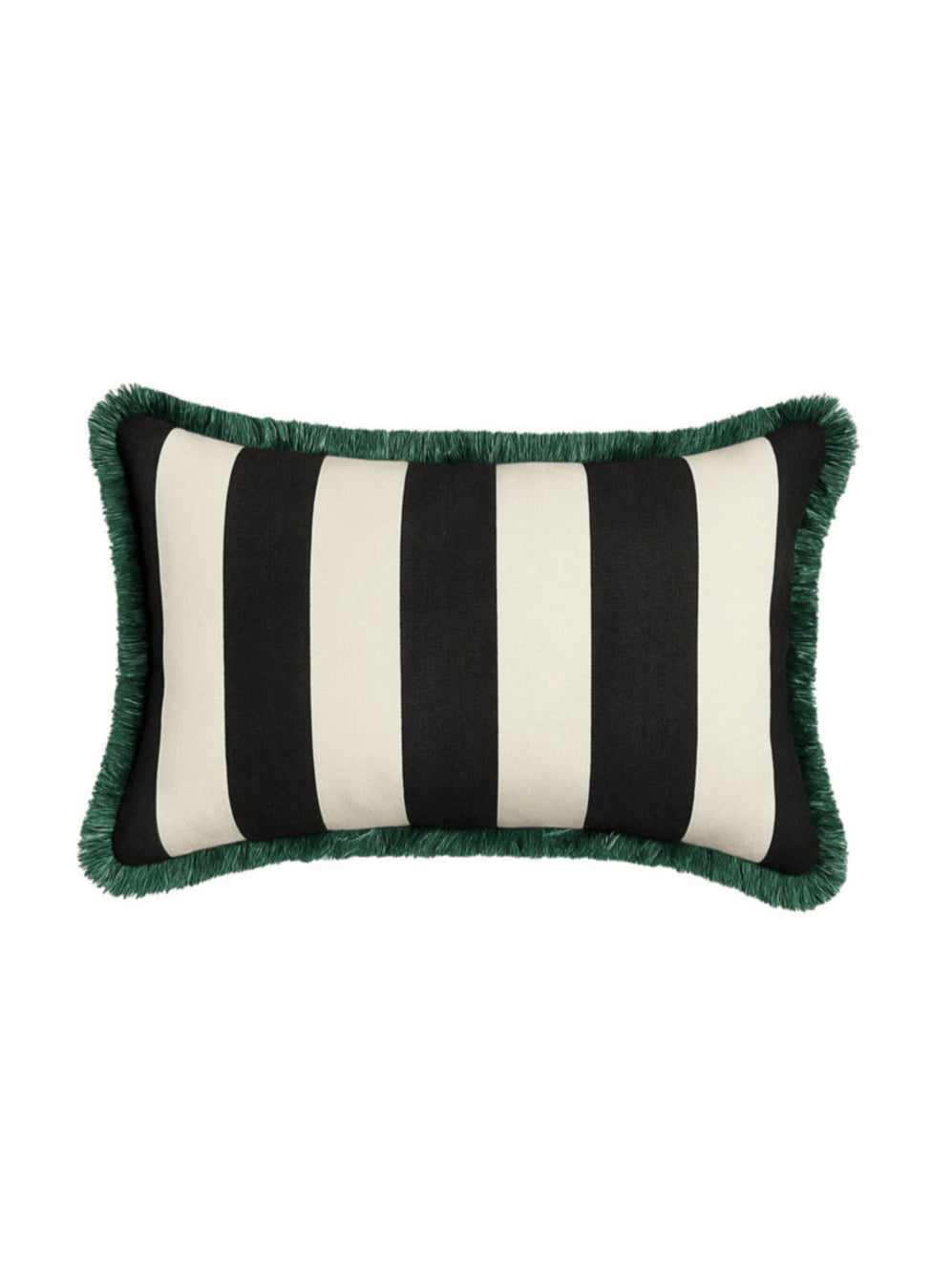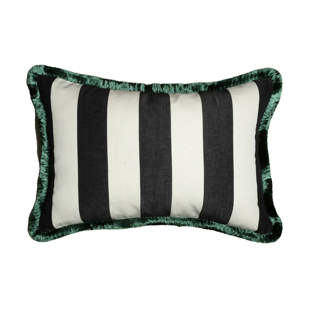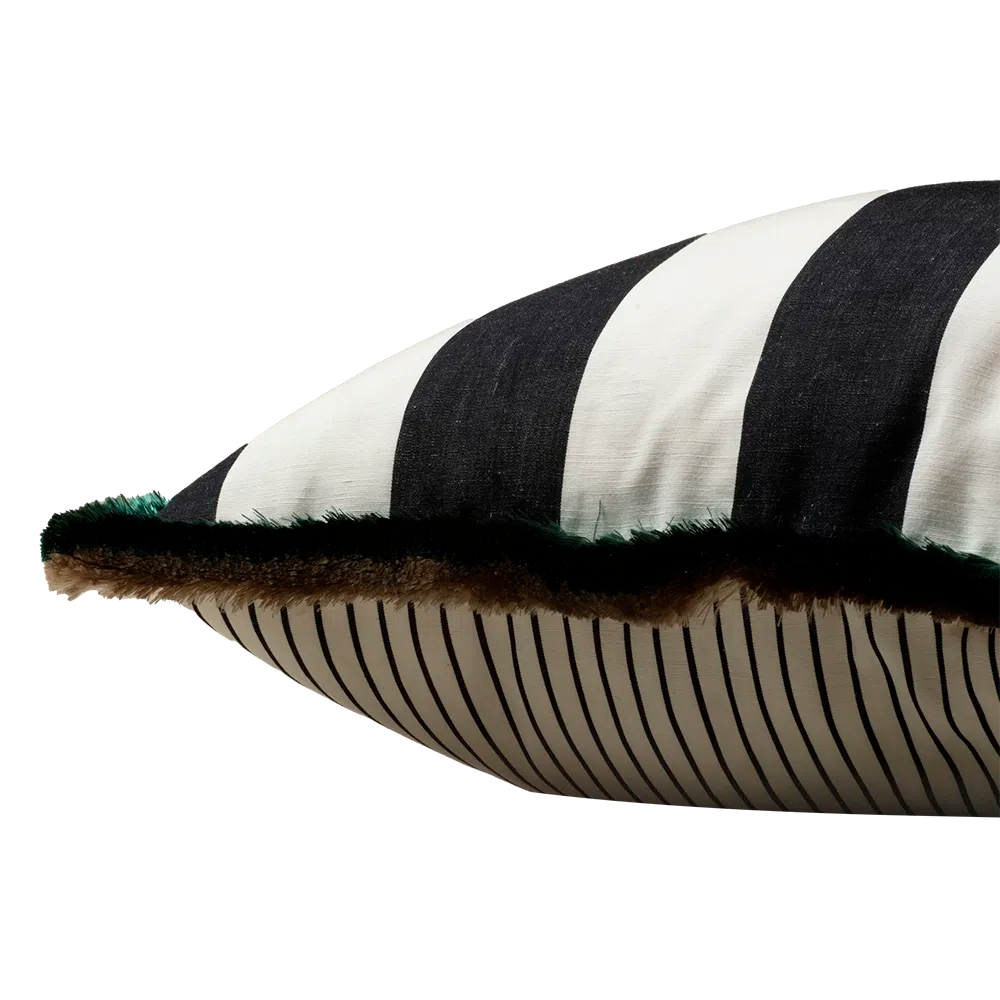 Contraste absoluto um padrão de risca preta e branca, tecida numa mistura de linho e algodão, com acabamento bem sedoso. Acabamento com franja dupla em verde garrafa e dourada. Costas em linho riscado e fecho invisível. Enchimento com pena e popeline de algodão.