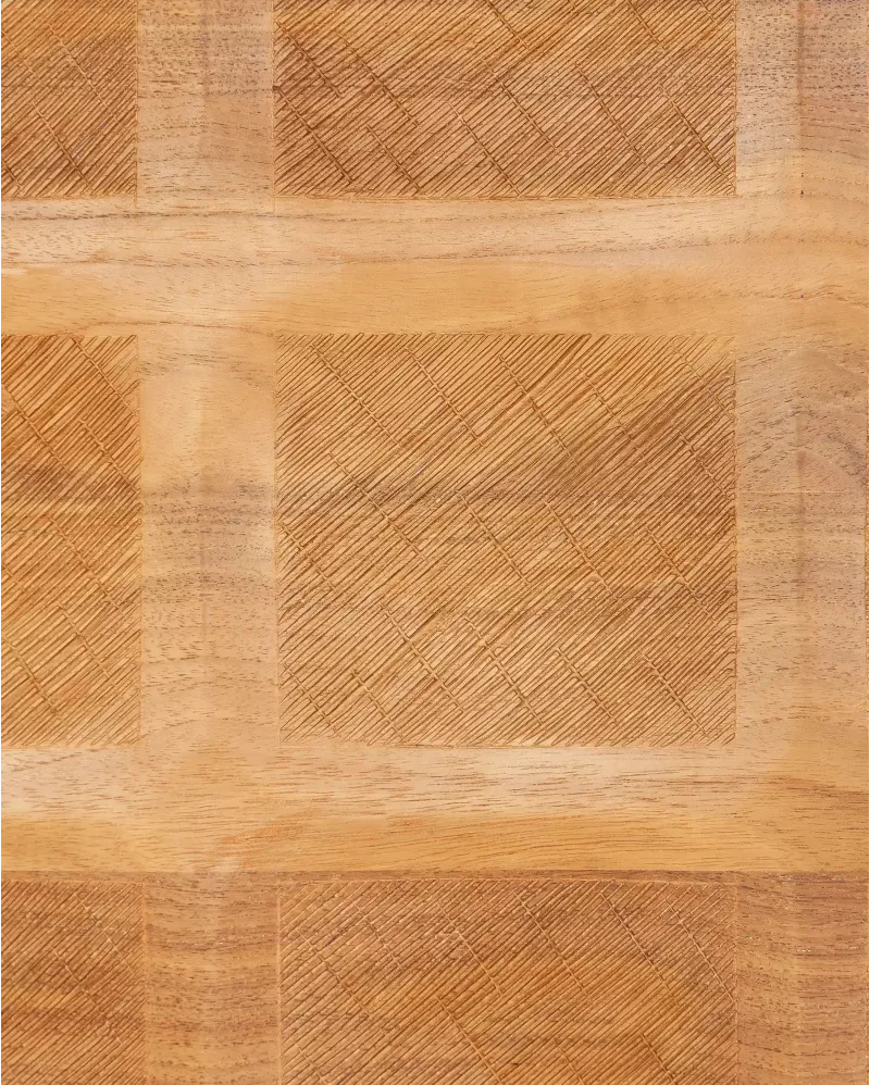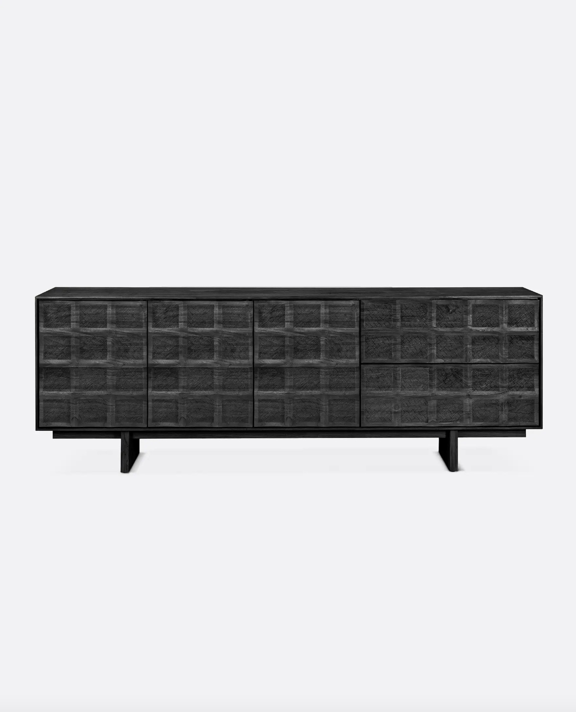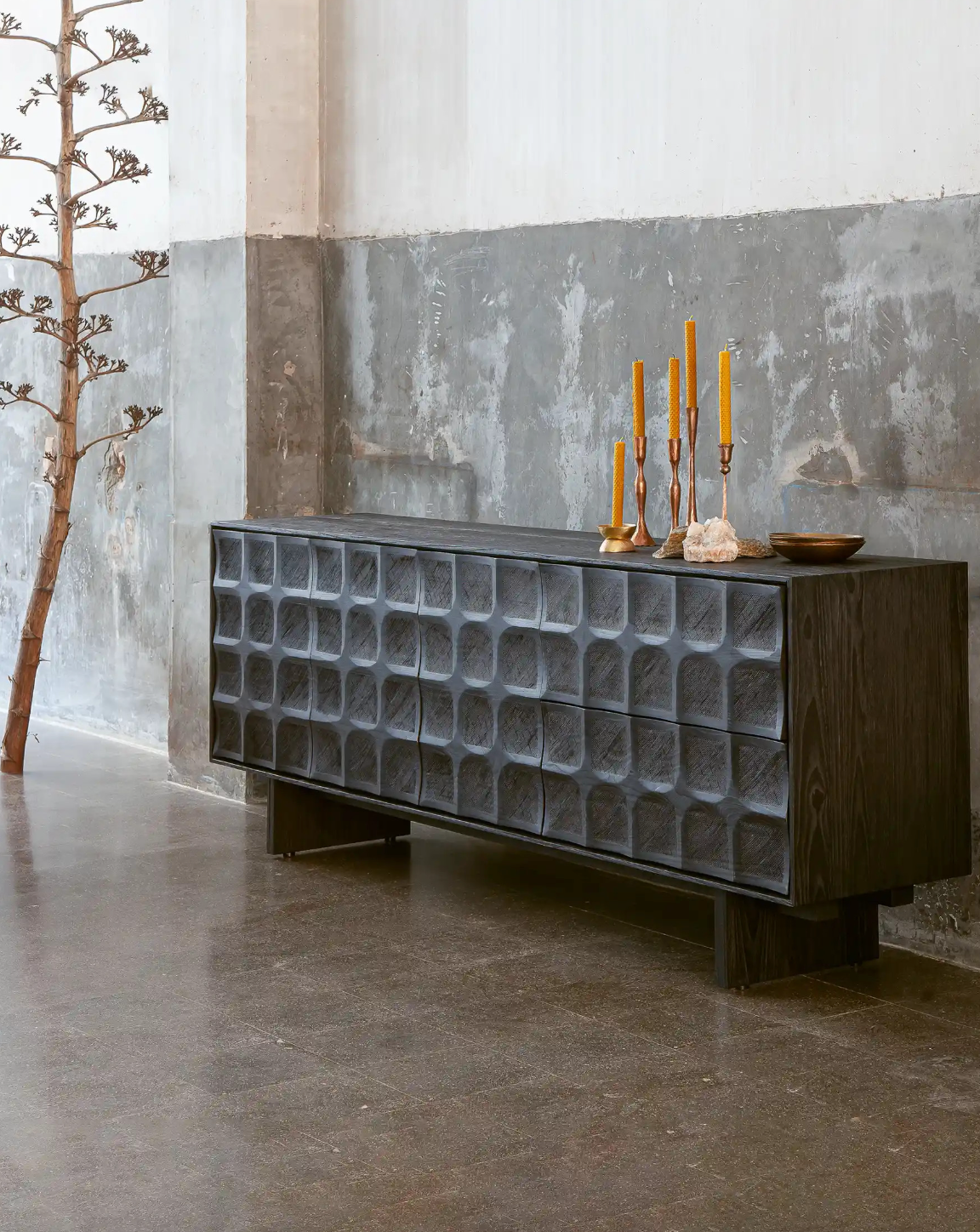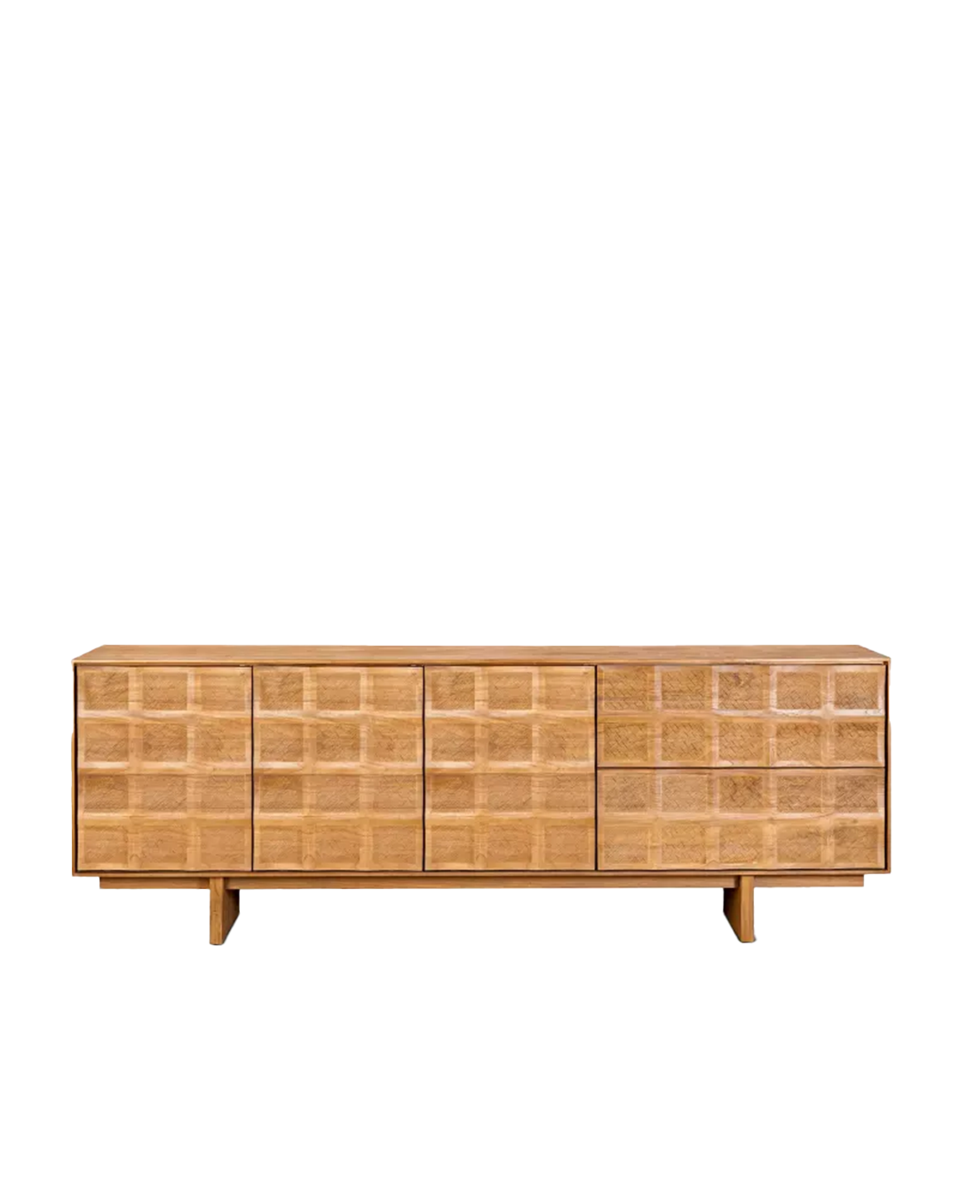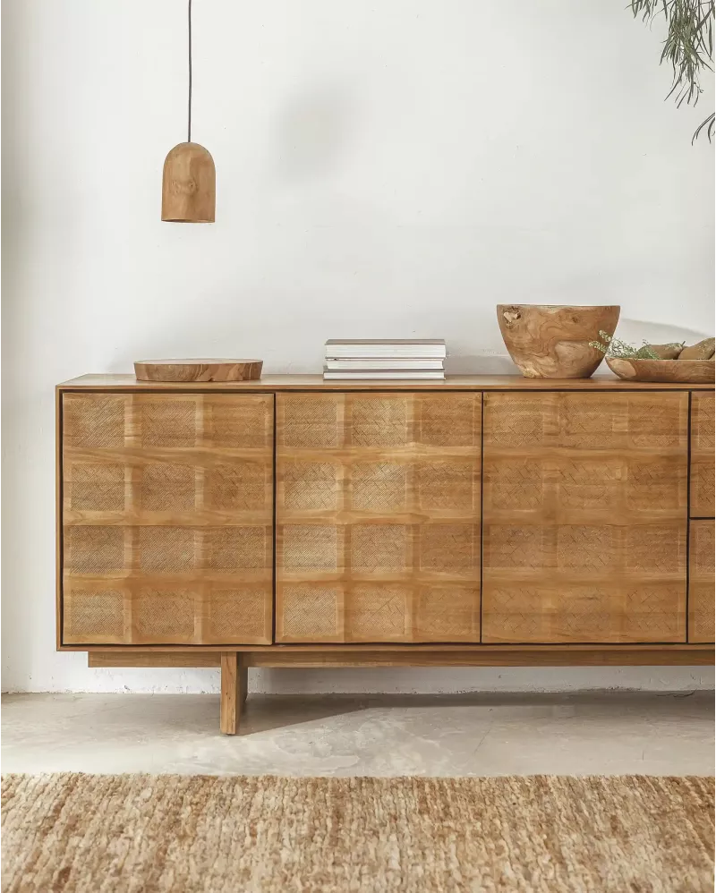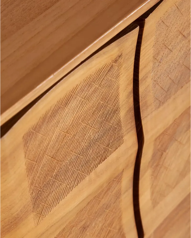 Este aparador é produzido totalmente de madeira teca reciclada, composto por três portas articuladas que revelam compartimentos espaçosos separados por prateleiras. Também tem duas gavetas espaçosas com um sistema soft close. A base consiste em duas tábuas de madeira maciça que formam os pés e são equipadas com niveladores para garantir estabilidade perfeita em qualquer superfície.