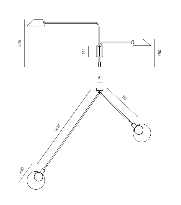 Candeeiro em metal, com dois braços amovíveis de dimensões diferentes.