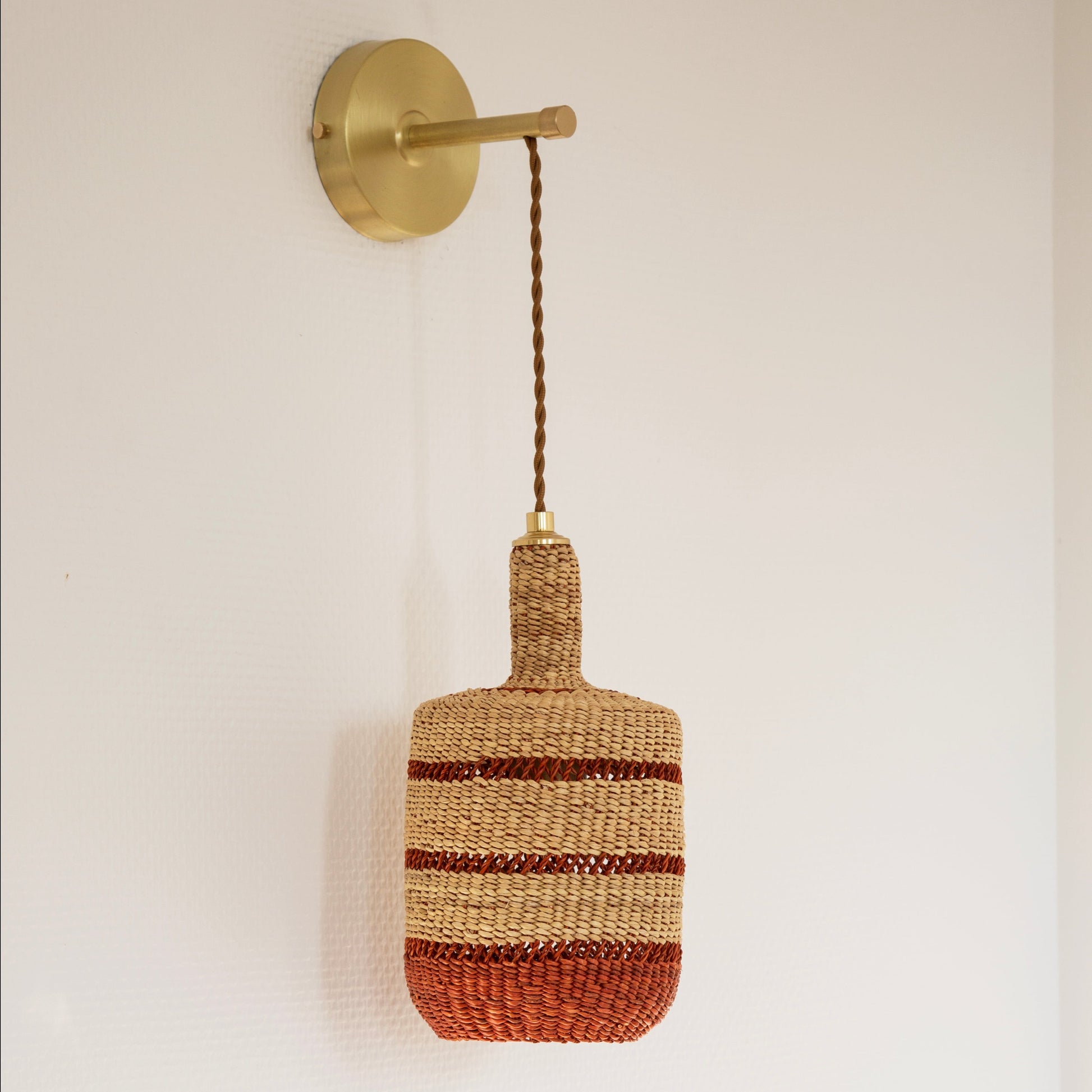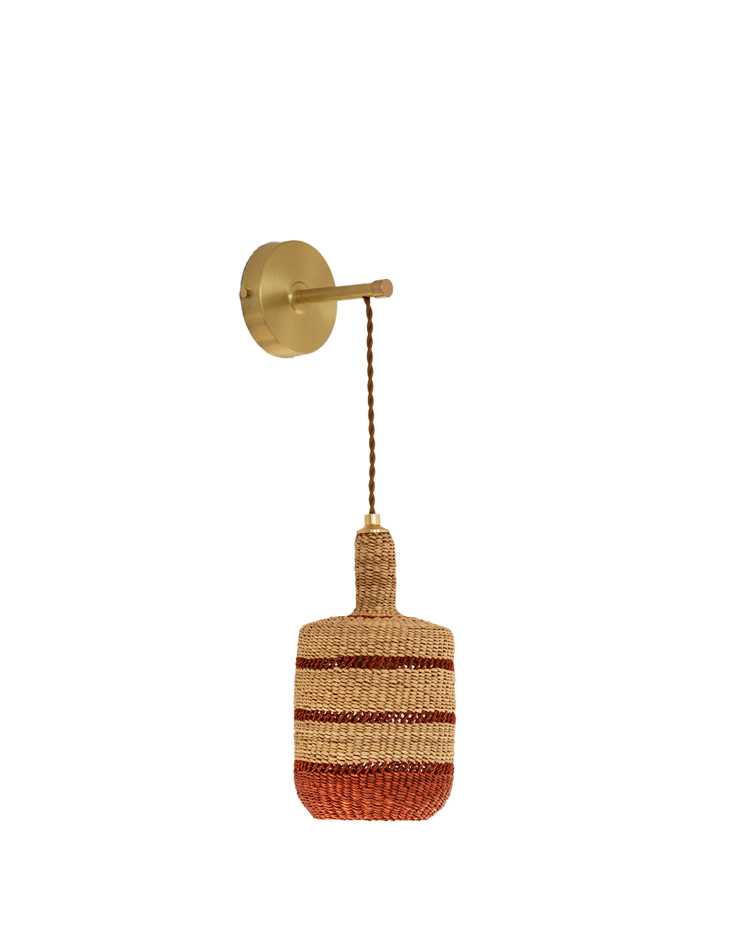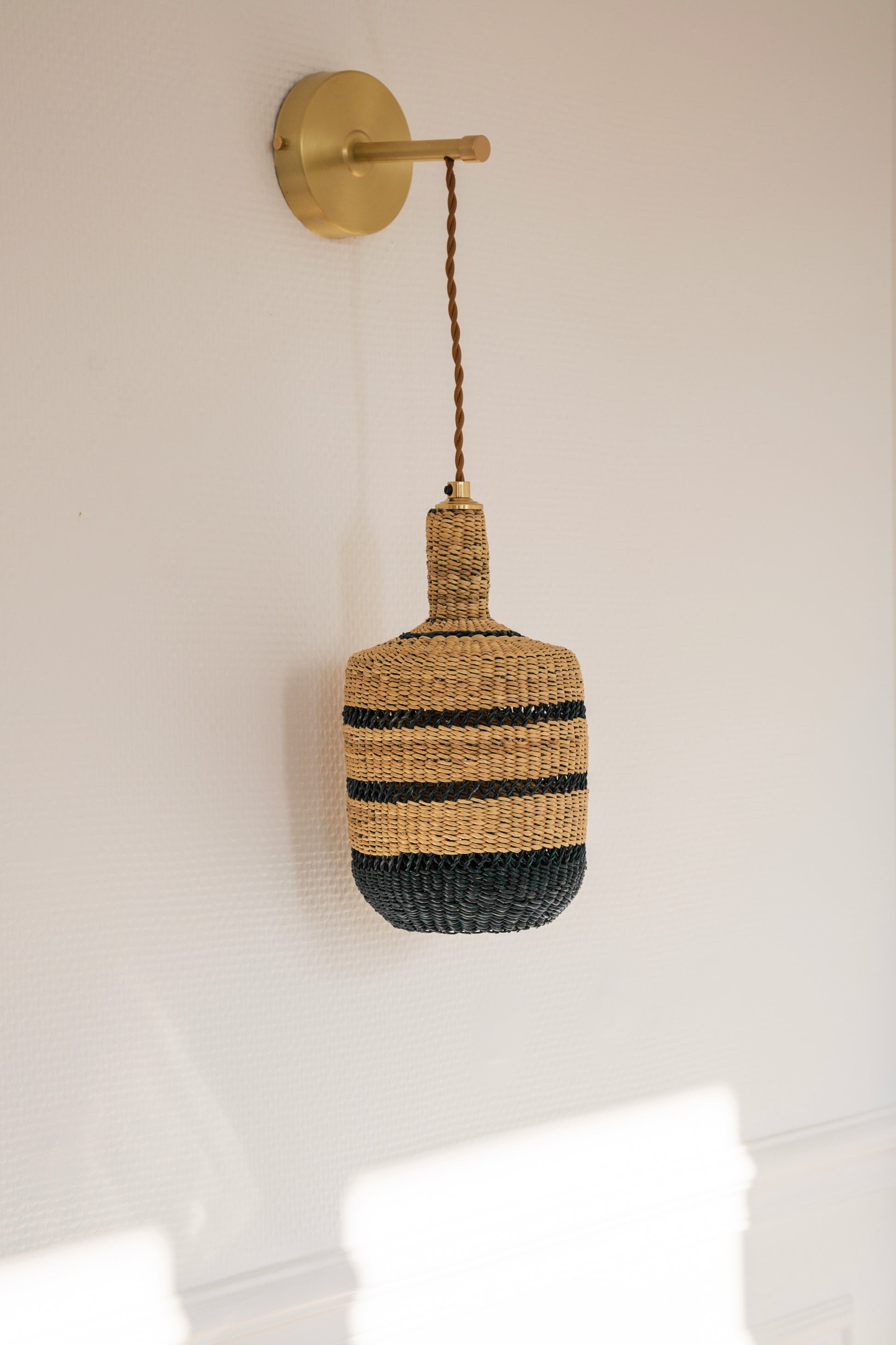 Apliques suspensos de parede que proporcionam um ambiente natural e uma luz acolhedora. Produzidas em capim-elefante tingido naturalmente e torcido à mão, por tecelões qualificados do Norte do Gana (Bolgatanga). O acessório de fixação à parede é em latão rosa. Elegância natural!