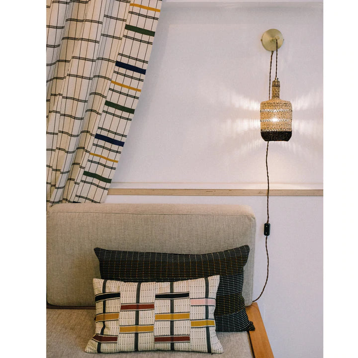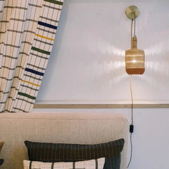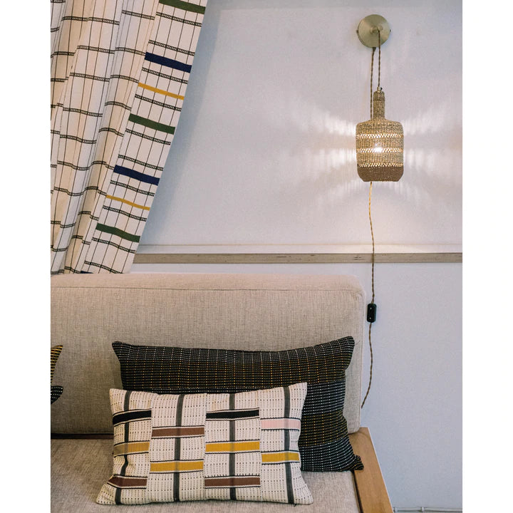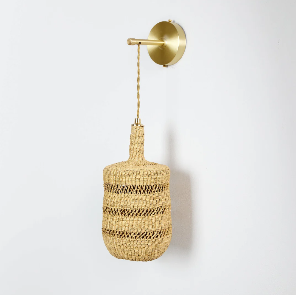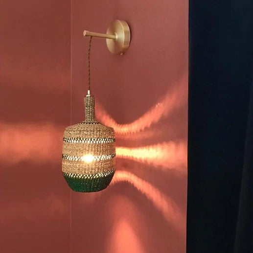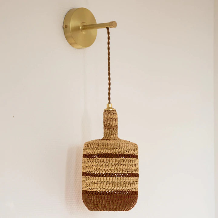 Apliques suspensos de parede que proporcionam um ambiente natural e uma luz acolhedora. Produzidas em capim-elefante tingido naturalmente e torcido à mão, por tecelões qualificados do Norte do Gana (Bolgatanga). O acessório de fixação à parede é em latão rosa. Elegância natural!