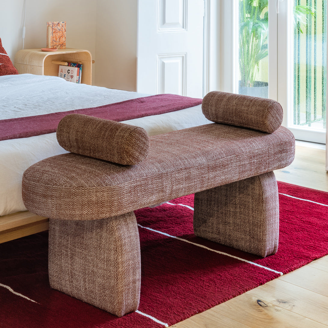 A banqueta Kimi é uma peça totalmente estofada e completada por duas almofadas na parte superior. É uma peça com um design muito exclusivo de linhas depuradas e arredondadas. Disponível em duas medidas e dois tipos de tecido (standard ou premium)