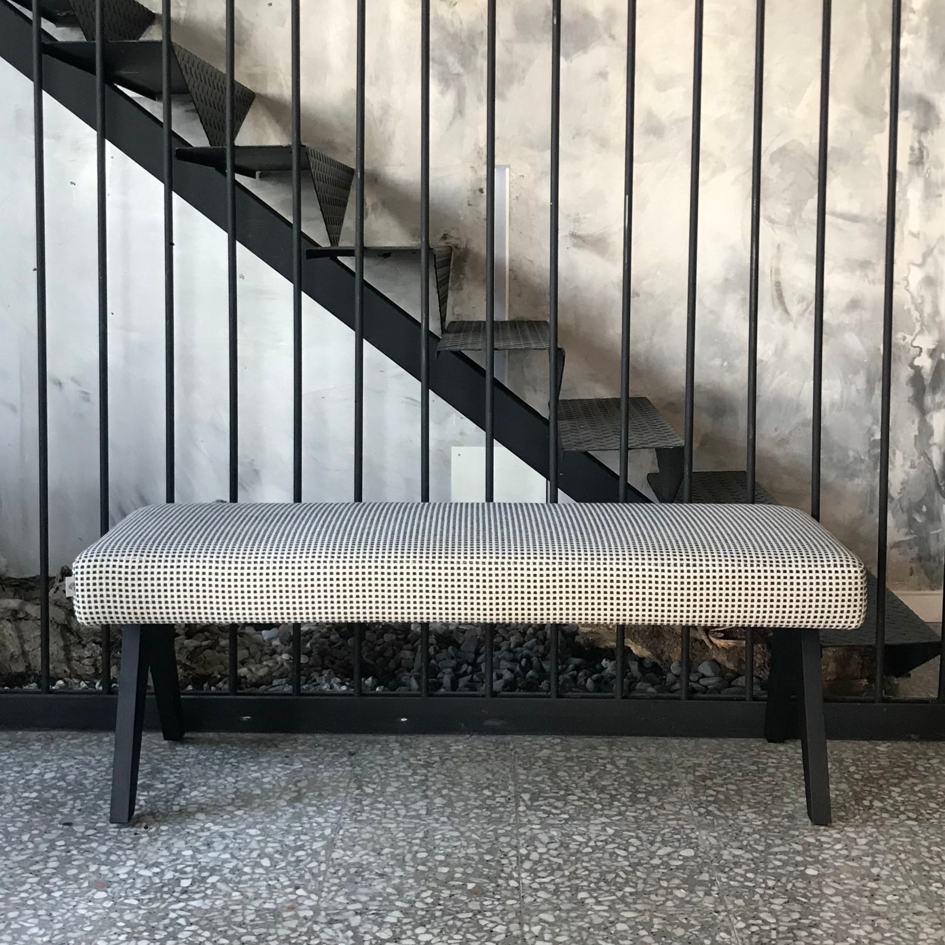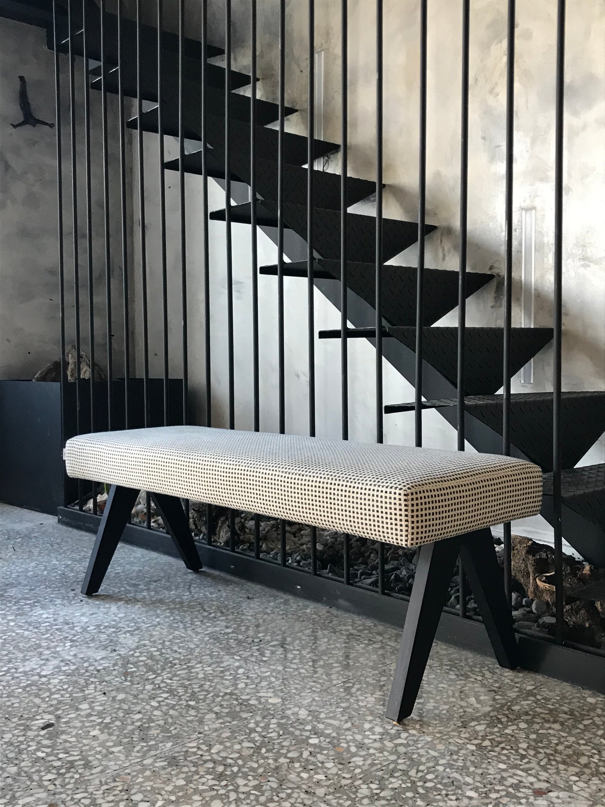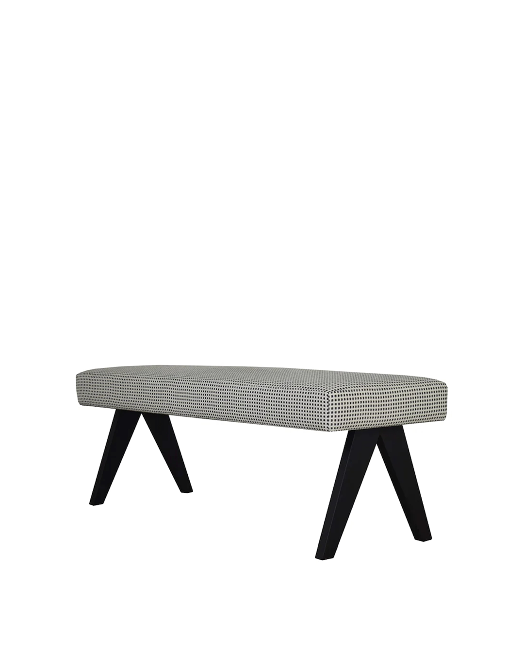 Este modelo tem uma estrutura em madeira e assento em estofo, pode ser visto em showroom (por agendamento) e ser produzido por encomenda num outro acabamento de madeira, tecido e cor à sua escolha.
