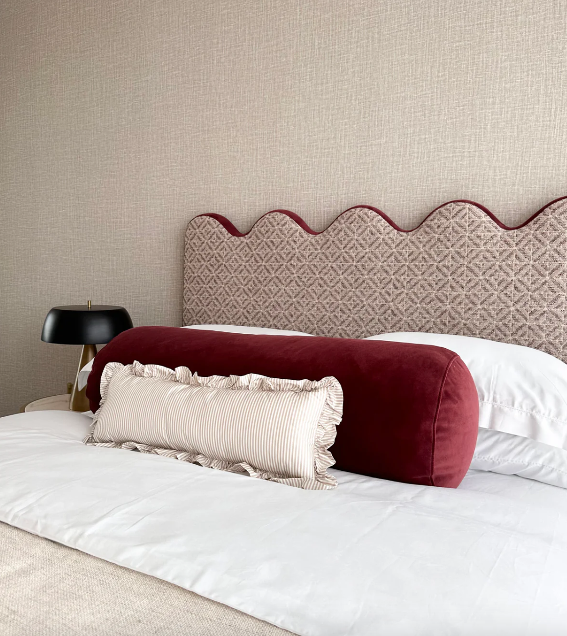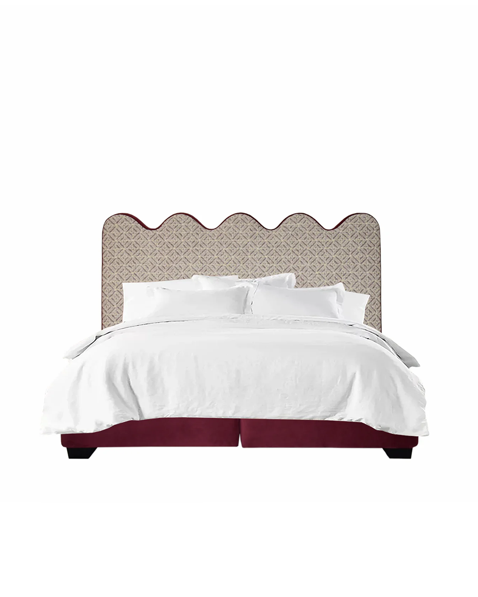 A sofisticada cama Elms consiste num sommier em madeira compensada com 2 gavetões e totalmente estofada em veludo bordeaux. Exibe uma bonita cabeceira ondulada com tecido padronizado e um vivo bordeaux a toda a volta, que lhe dá um acabamento excepcional.