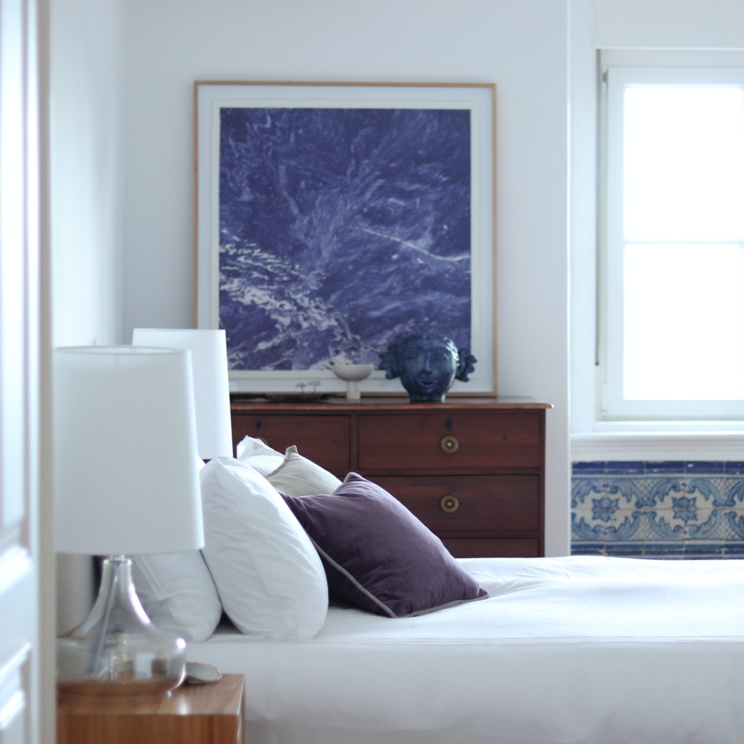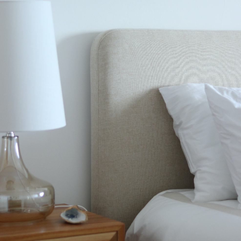 Cama composta por cabeceira + sommier (e estrado incluído) totalmente estofados em tecido e pés em alumínio. A cabeceira é uma peça produzida à parte e posteriormente fixada à parede. Esta cama é produzida com todos os cantos arredondados e detalhe de costuras a toda a volta, que lhe confere um acabamento excepcional. Os pés podem ser em alumínio com acabamento à escolha, ou em madeira.