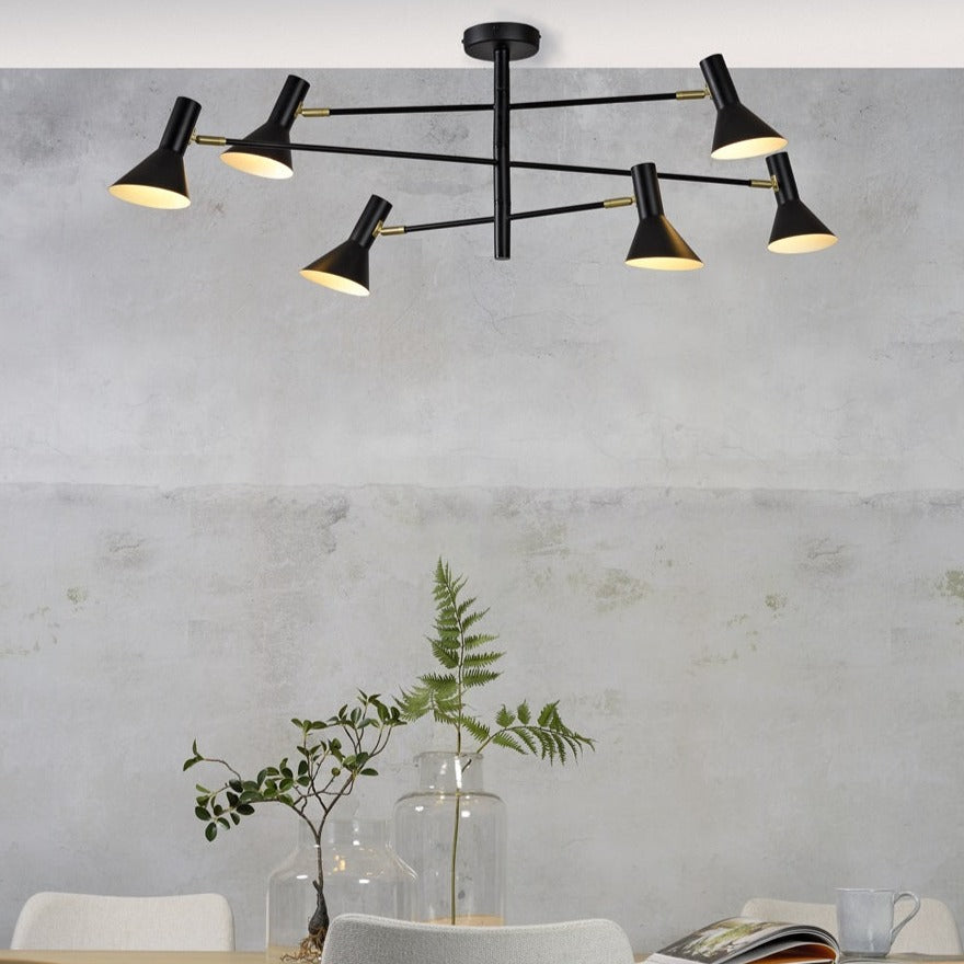 Candeeiro ideal para estar em cima de uma mesa de refeição, com 6 pontos de luz reguláveis. Este modelo é produzido em metal preto, com detalhes em latão escovado.