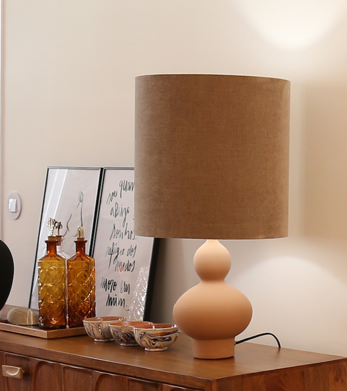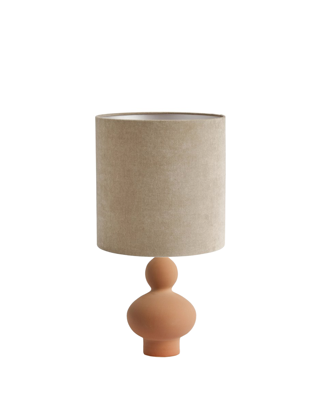 Candeeiro original de forma orgânica, produzido em barro com acabamento fumê mate e casquilho em latão escovado. A sofisticação do abajur num suave veludo com o barro é a perfeita conjugação de materiais que apesar de distintos, ligam na perfeição.