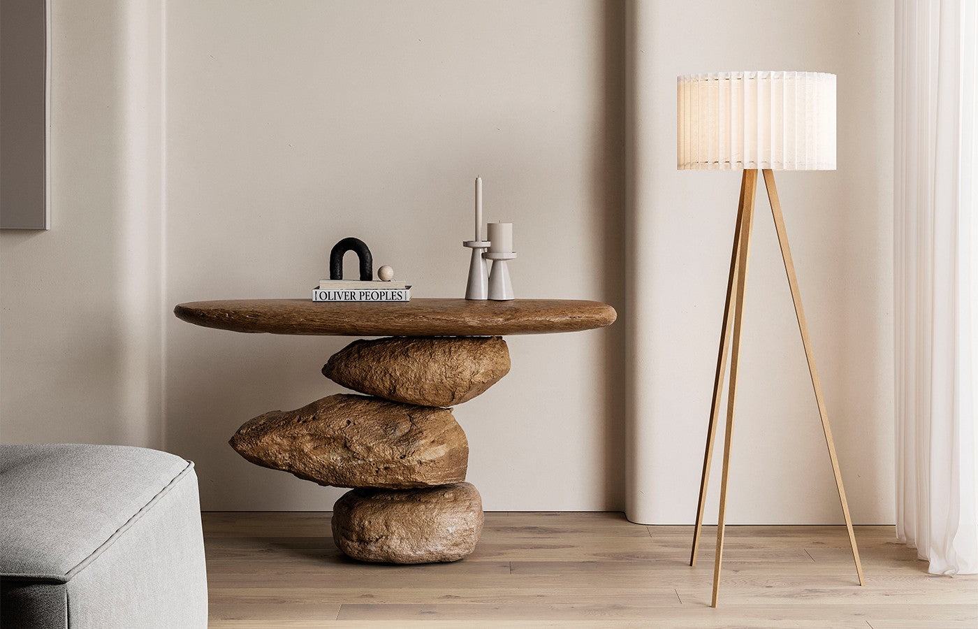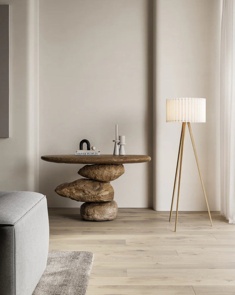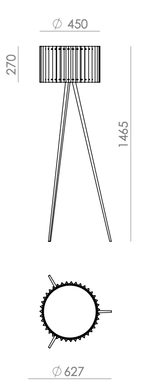 Candeeiro de pé bastante elegante e decorativo, com três pés metálicos a imitar a madeira pinho e um abajur em linho plissado que proporcionará uma luz quente e muito acolhedora.