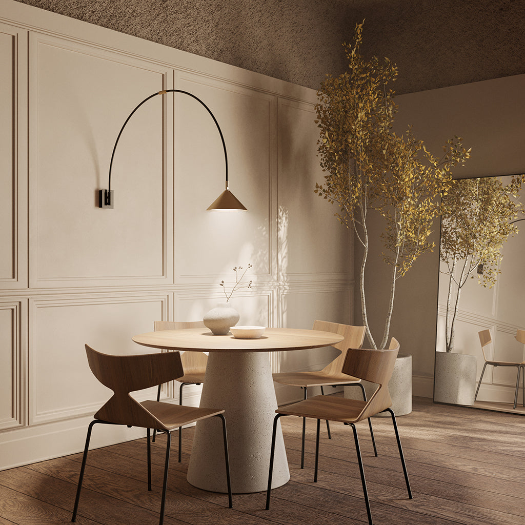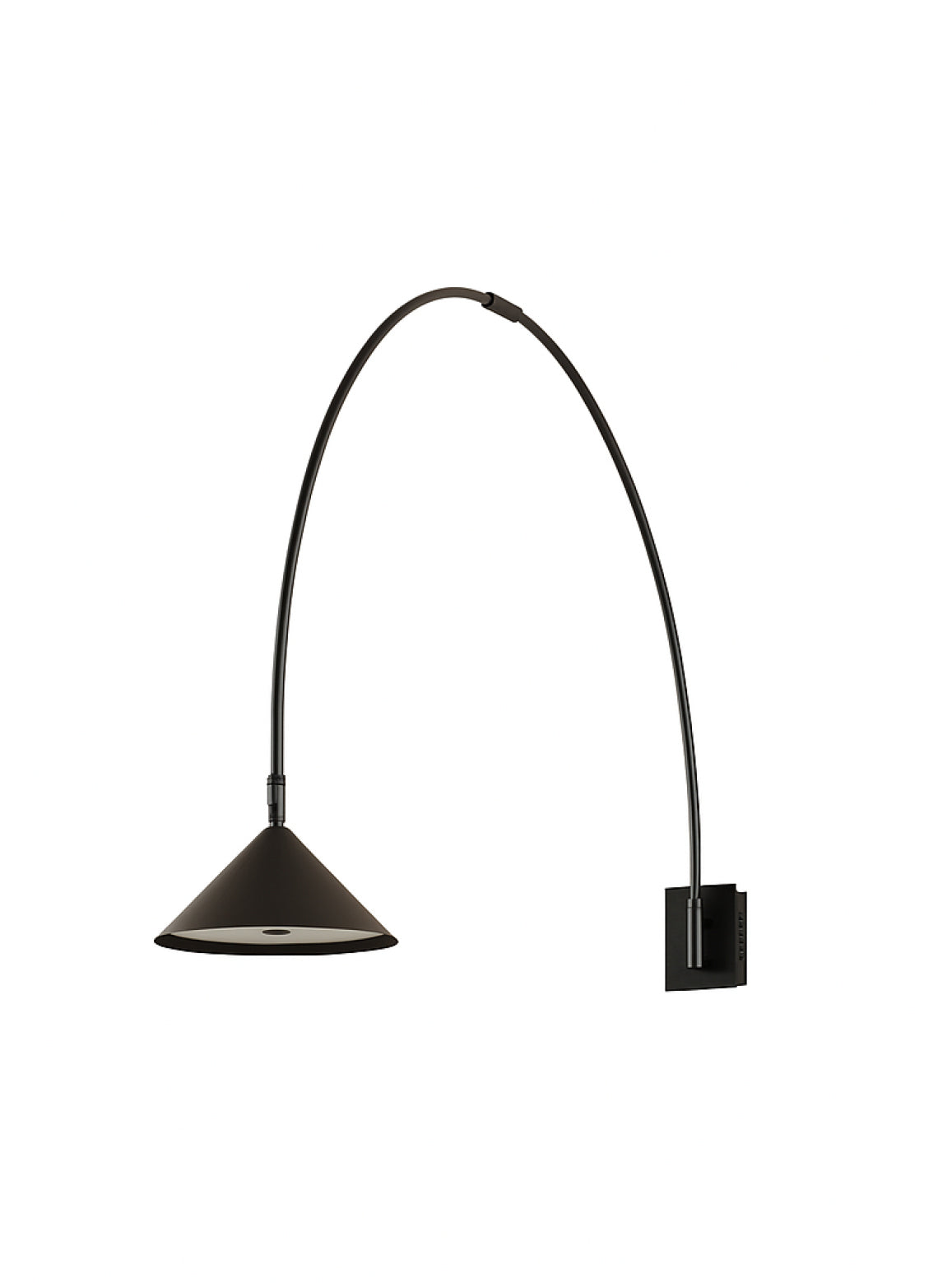 Candeeiro de parede com braço curvo alongado e ajustável, perfeito para ter por cima de uma mesa de refeição ou de um sofá numa zona de leitura.