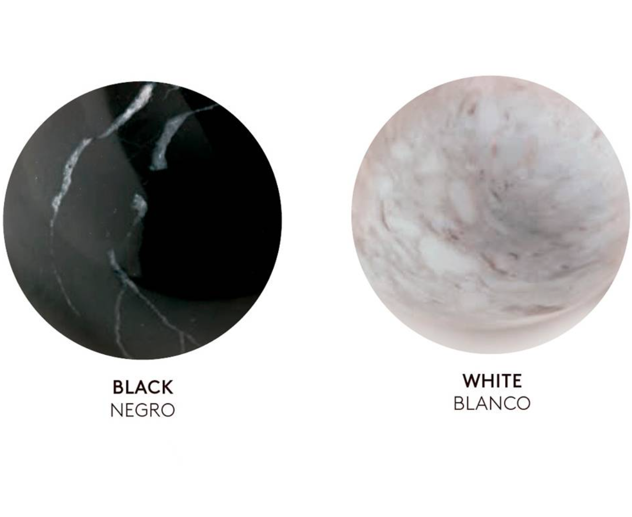Está disponível em dois acabamentos: metal preto fosco com cúpula de mármore preto e metal dourado envelhecido com cúpula de mármore branco.