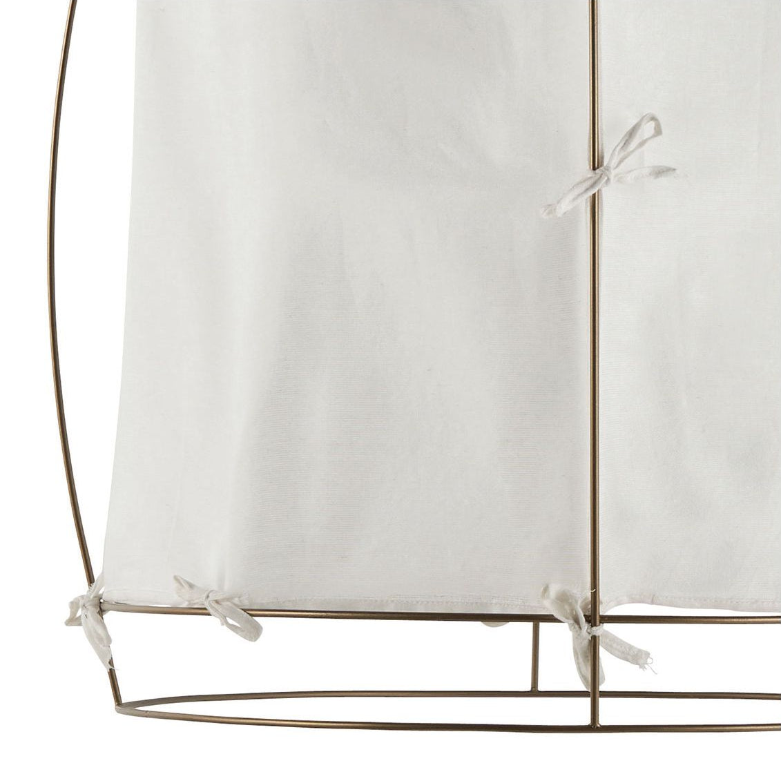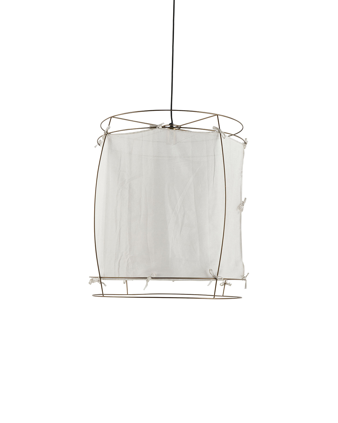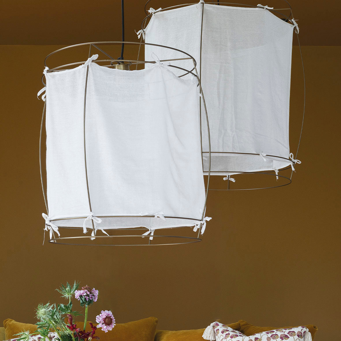 O tecido do abajur é leve e arejado e está fixo à estrutura metálica por diversos laços. Tem a capacidade de filtrar a luz e criar uma atmosfera suave e acolhedora. Está disponível em 2 generosas dimensões e é ideal para sala ou quarto e numa grande área misturando os dois tamanhos.
