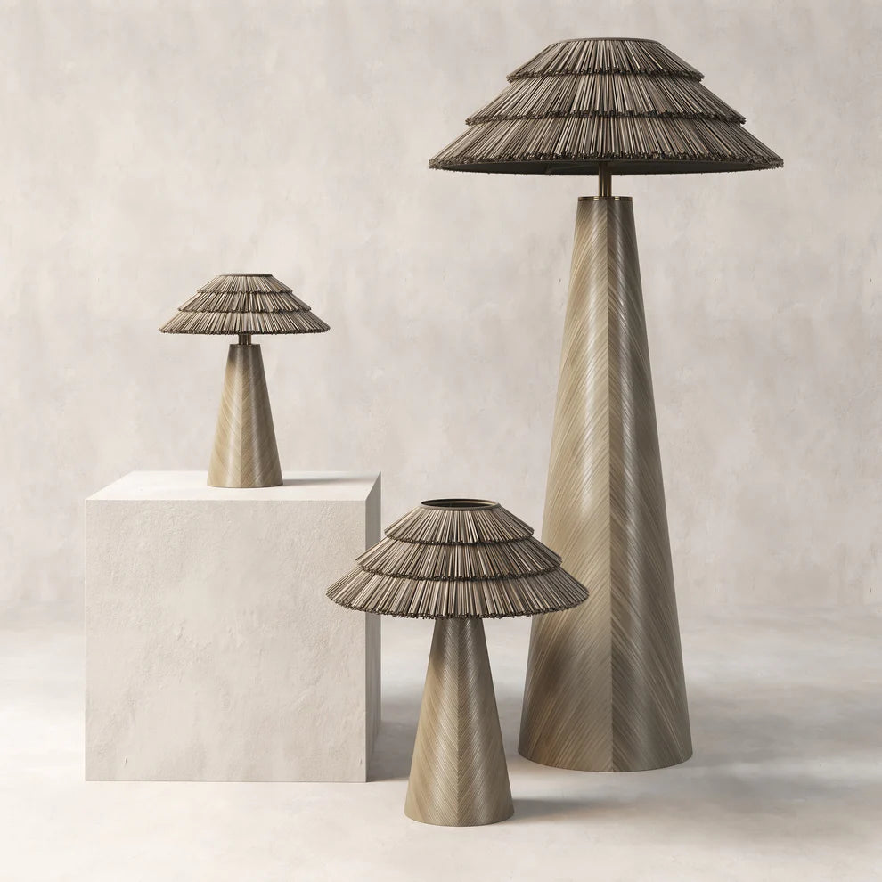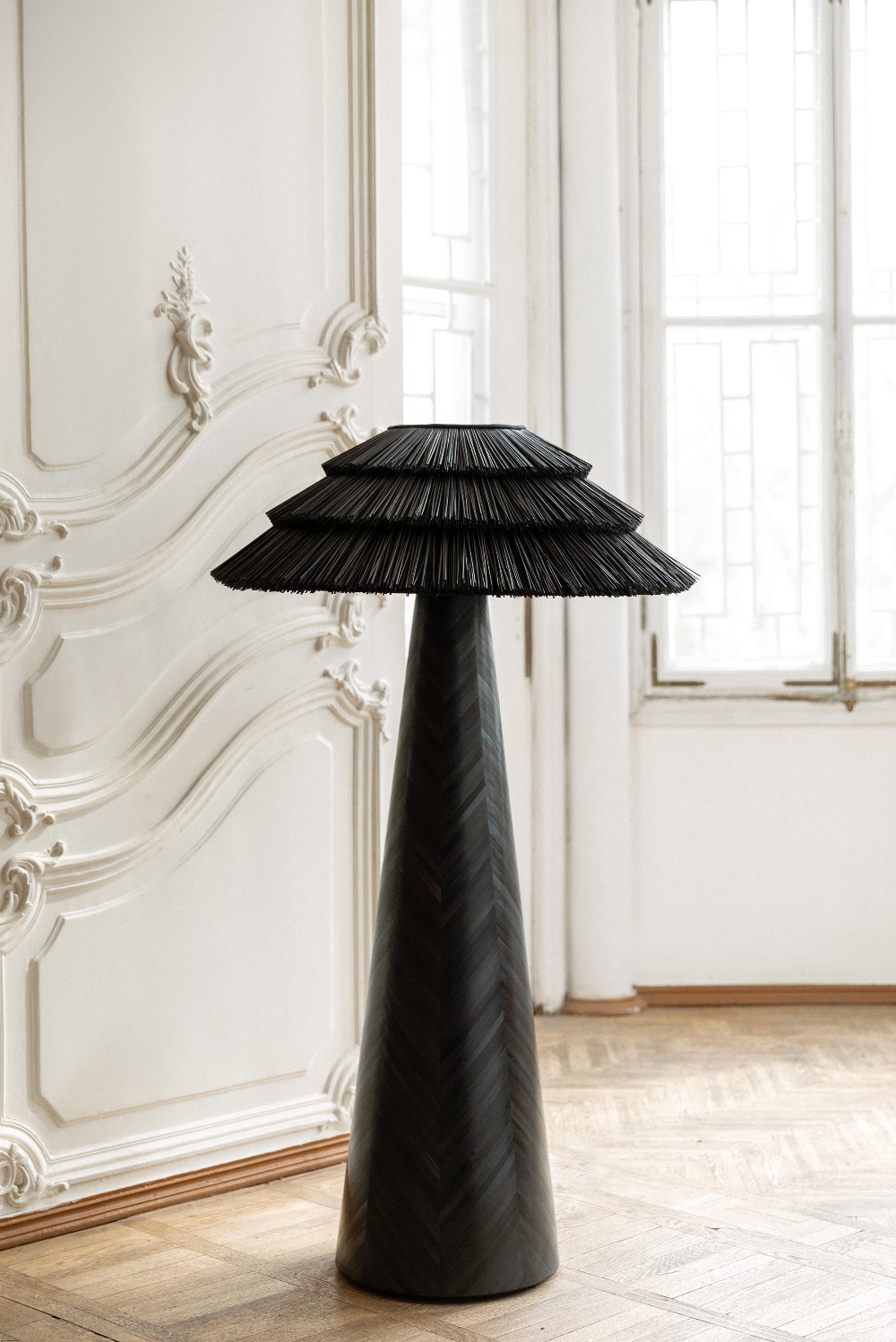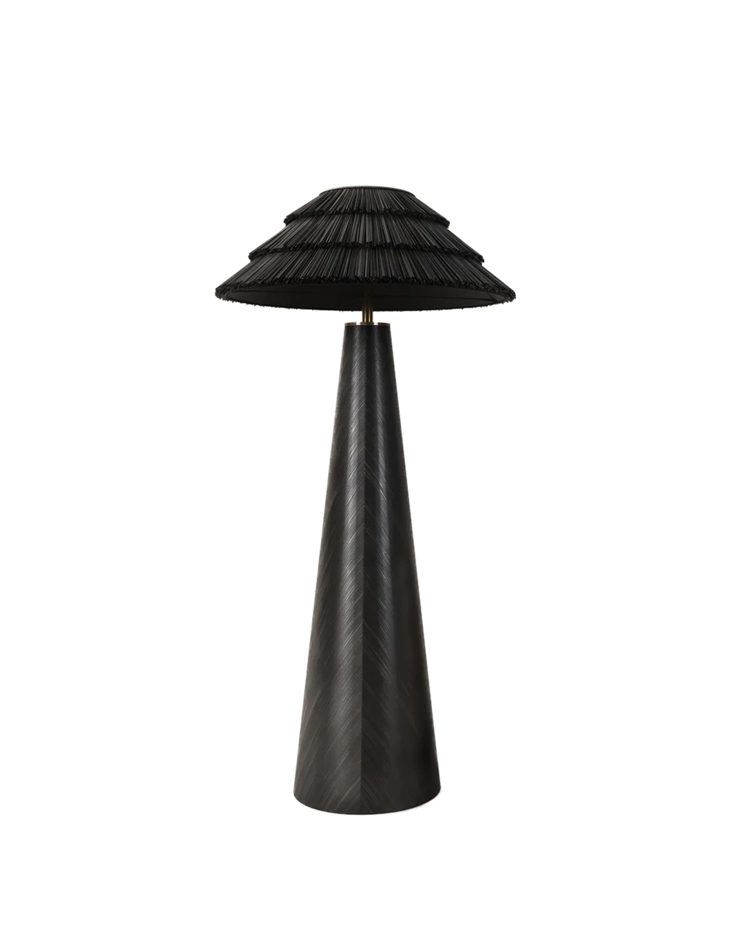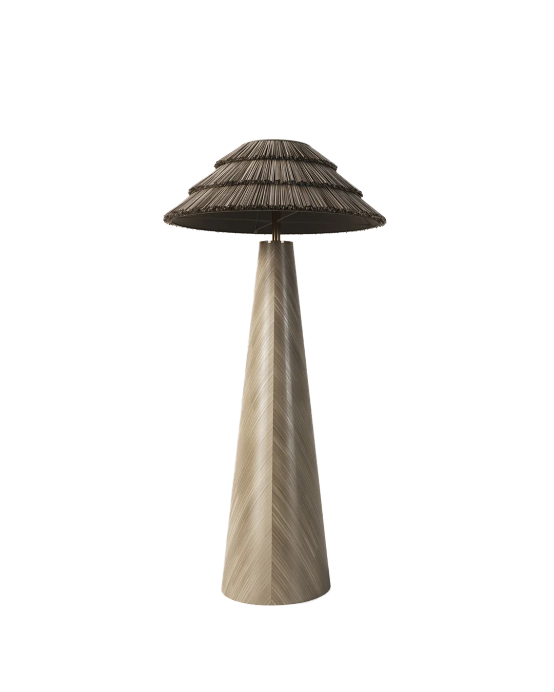 O topo do candeeiro é feito com estrutura em metal, lona e palha de centeio tingida e a base, em formato de cone é trabalhada com a técnica ancestral de marqueterie. O seu design faz lembrar uma cabana em que o abajur parece o telhado também ele feito pela técnica antiga de cosntrução "Tyruvannia".