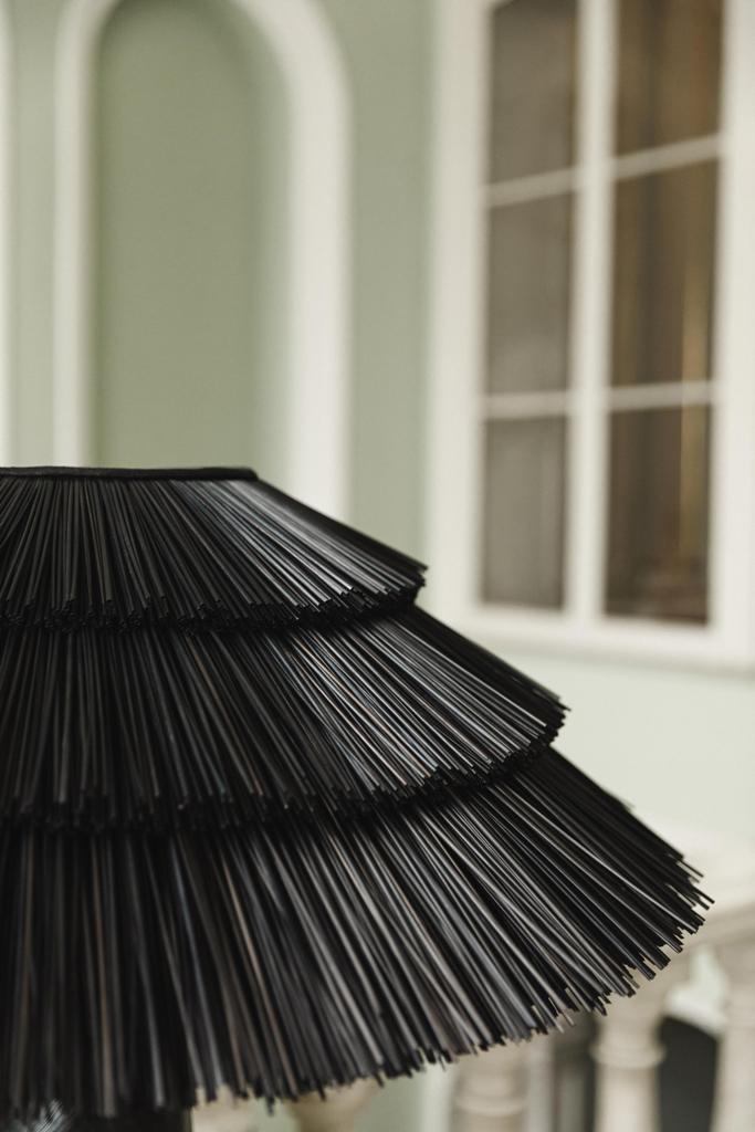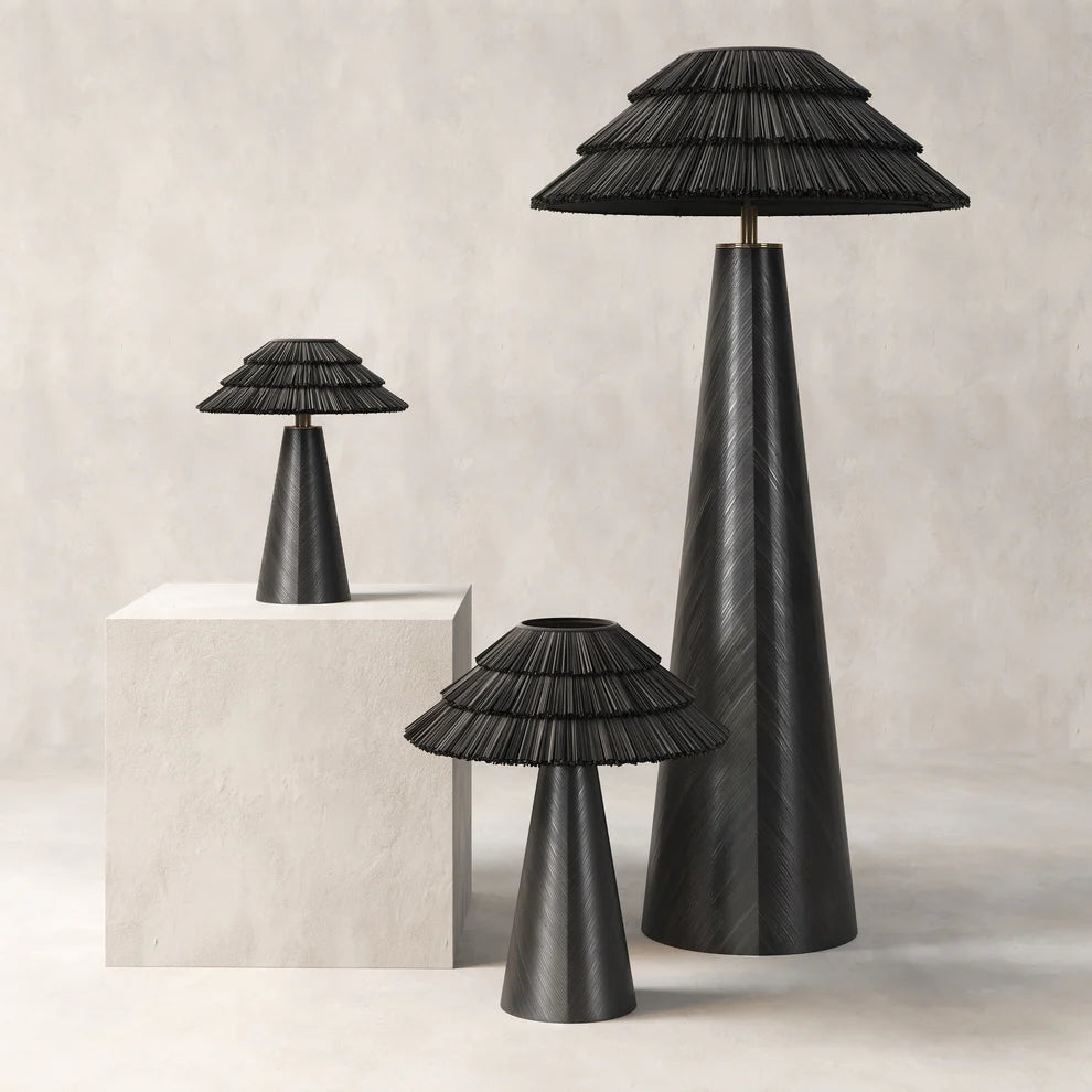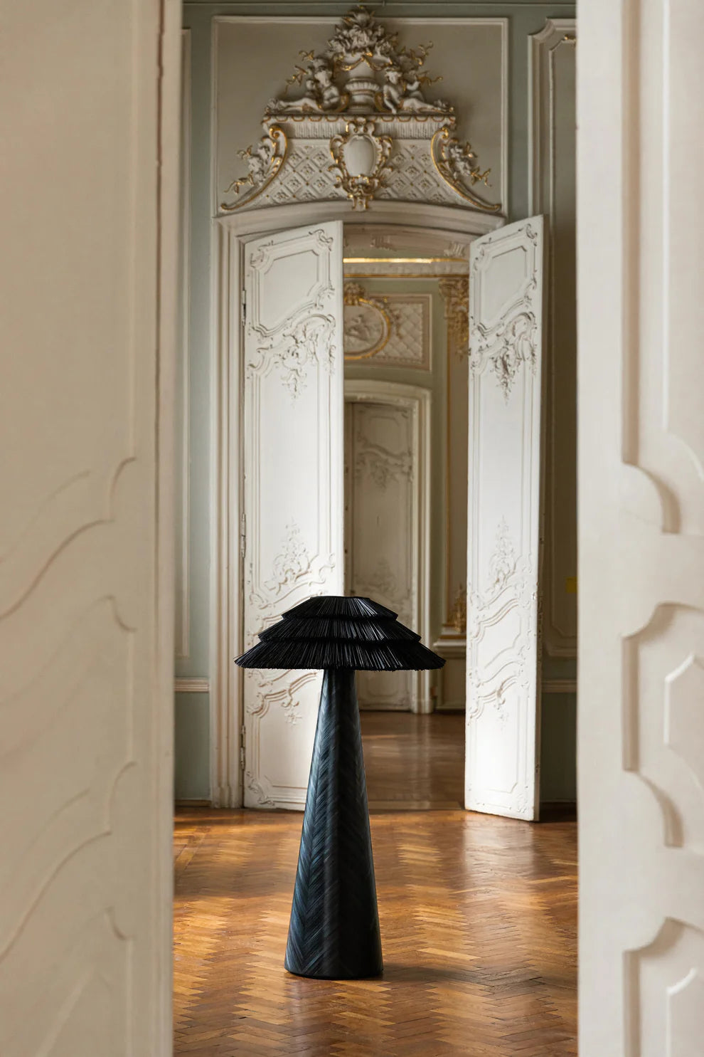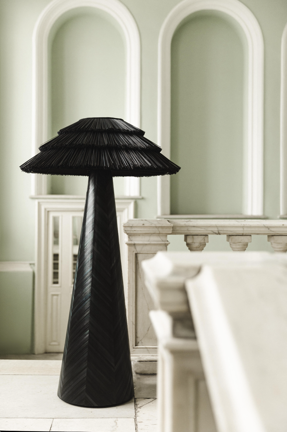 O topo do candeeiro é feito com estrutura em metal, lona e palha de centeio tingida e a base, em formato de cone é trabalhada com a técnica ancestral de marqueterie. O seu design faz lembrar uma cabana em que o abajur parece o telhado também ele feito pela técnica antiga de cosntrução "Tyruvannia".
