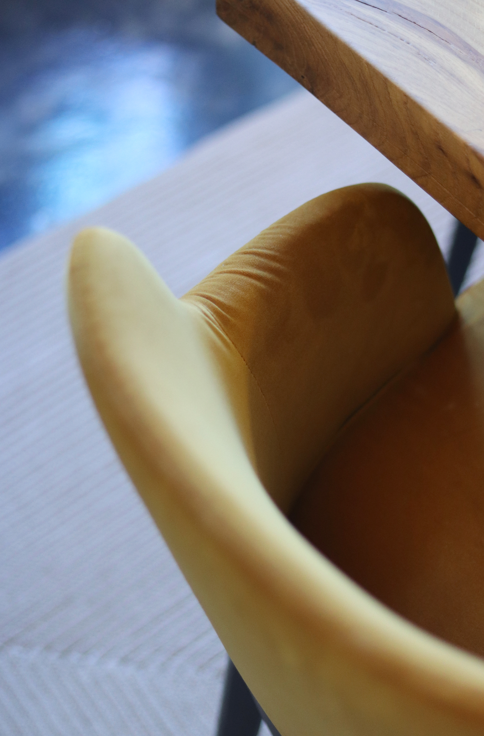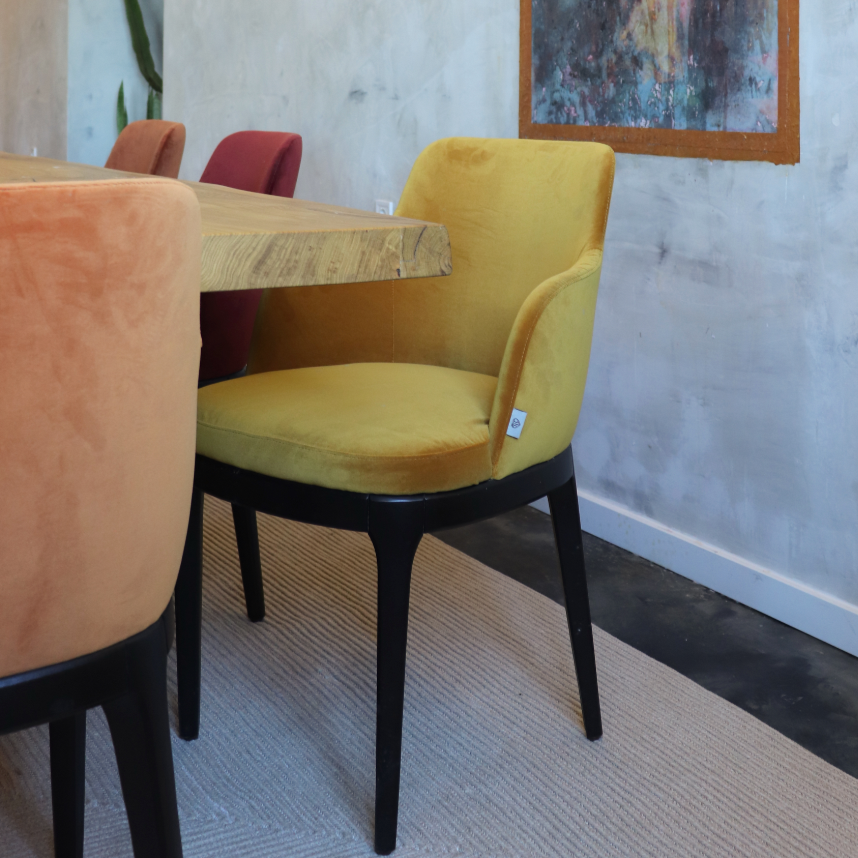 Ergonomia e conforto combinam-se perfeitamente na cadeira Tóquio. O atrativo visual desta cadeira eleva as formas curvas que acrescentam um estilo especial à sua zona de refeição. O estofo é em veludo e a estrutura base é em sólida madeira de carvalho, lacada a preto mate.
