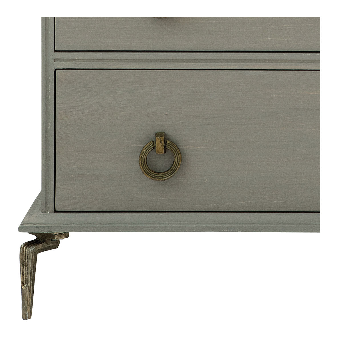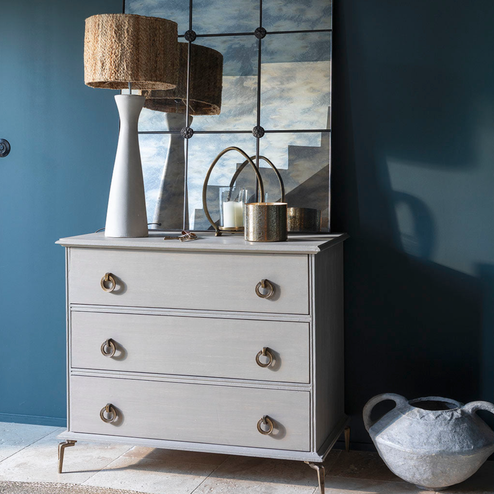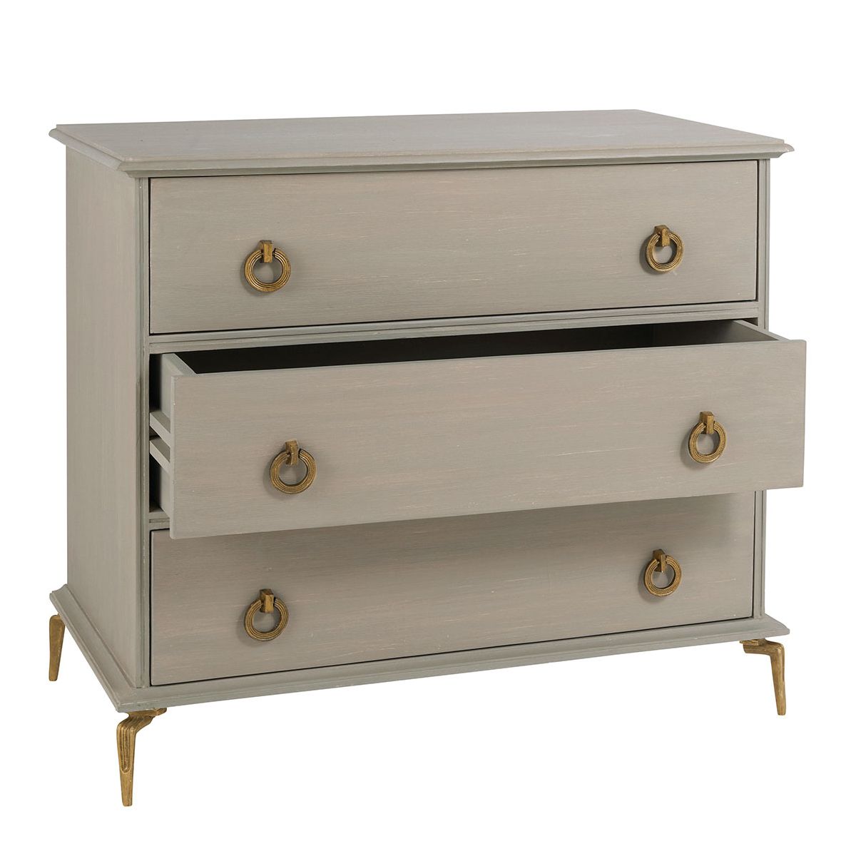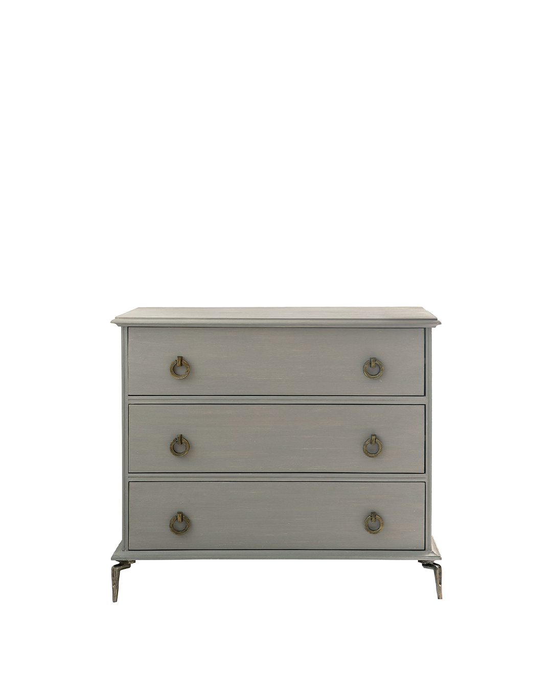 A cómoda Gabrielle é composta por três gavetas para arrumação e tem um design clássico. Produzida em madeira de mangueira maciça, realçada com uma patine cinzenta feita à mão. Os pés e as pegas das gavetas em latão envelhecido, dão um ligeiro toque de luz.