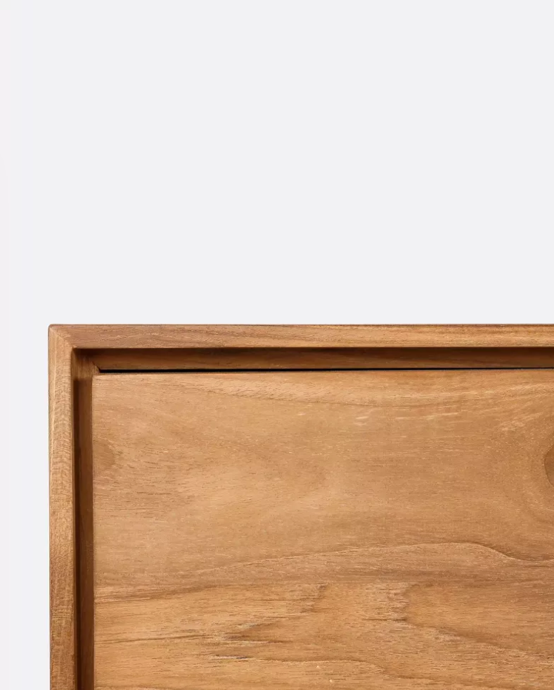 A estrutura de perfil quadrado de ferro sólido desta consola, incorpora uma placa de metal perfurada como uma prateleira de meia altura. Na parte superior, há duas grandes gavetas de madeira de teca com sistema de fecho soft-close, cuja borda frontal foi cuidadosamente rebaixada para apenas um centímetro para estilizar e adicionar leveza ao design.