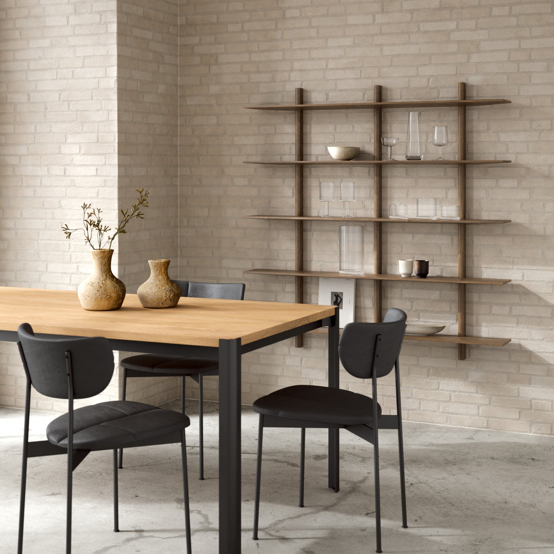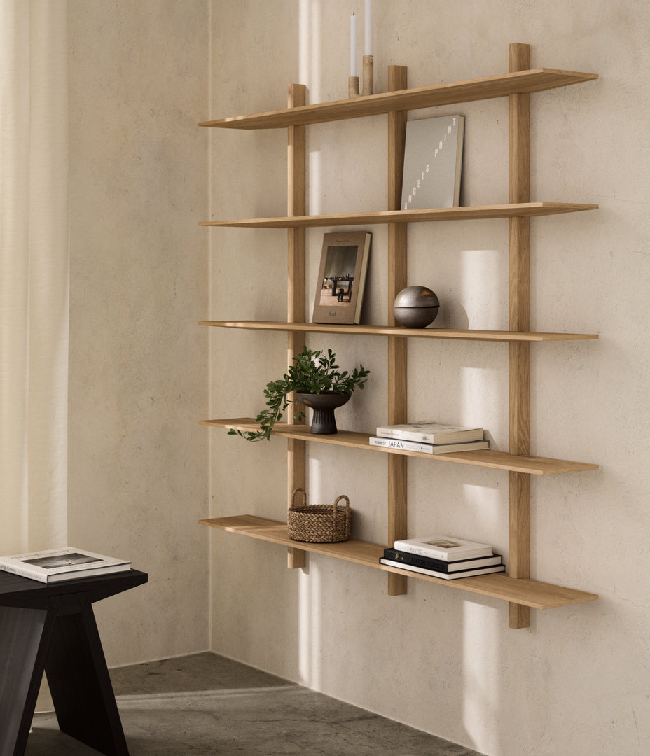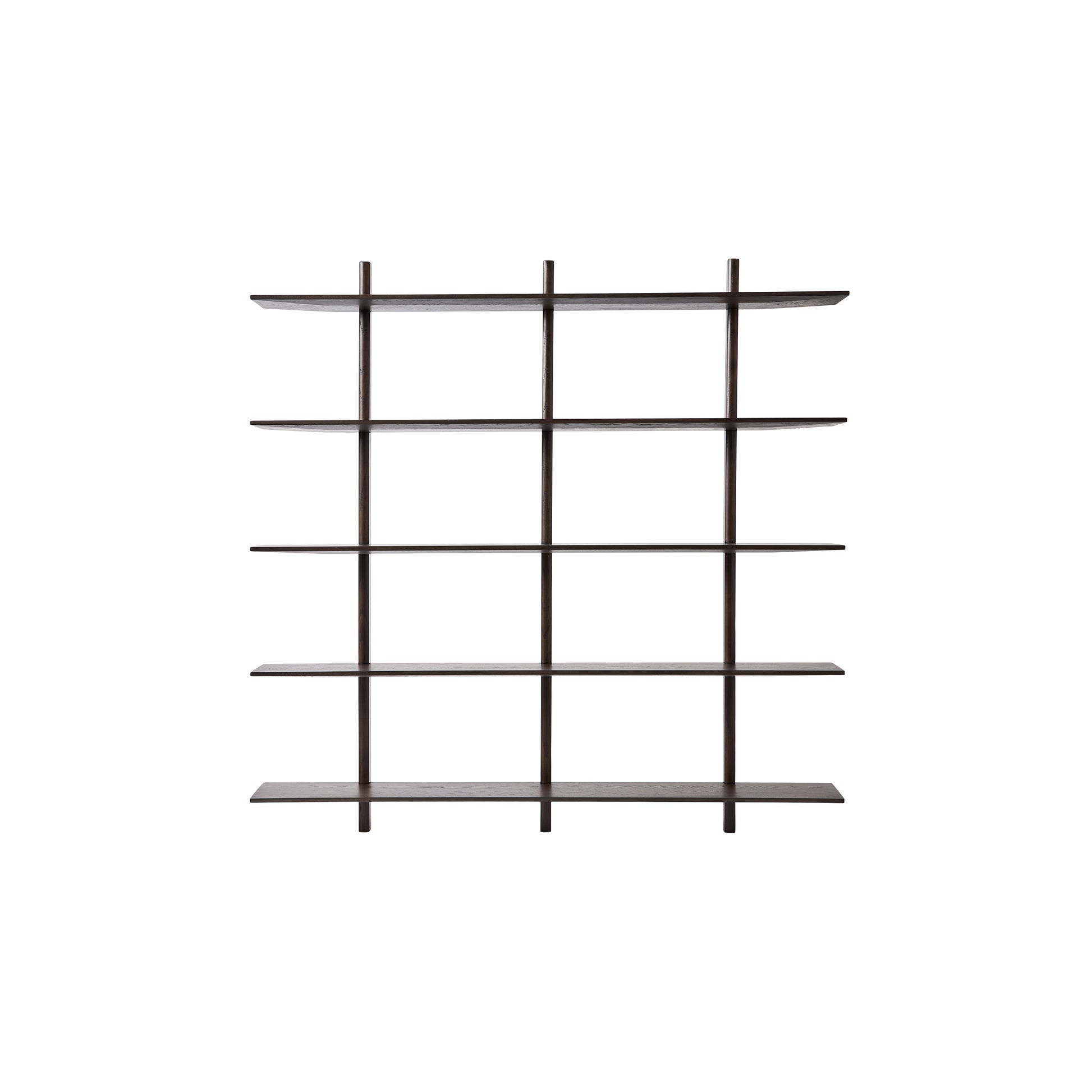 A prateleira Noir é feita de carvalho, realçando os veios naturais e únicos da madeira. Esta grande prateleira de parede foi projetada com cinco níveis contínuos, com bordas rebaixadas que criam uma expressão leve e elegante, exalando o artesanato tradicional.