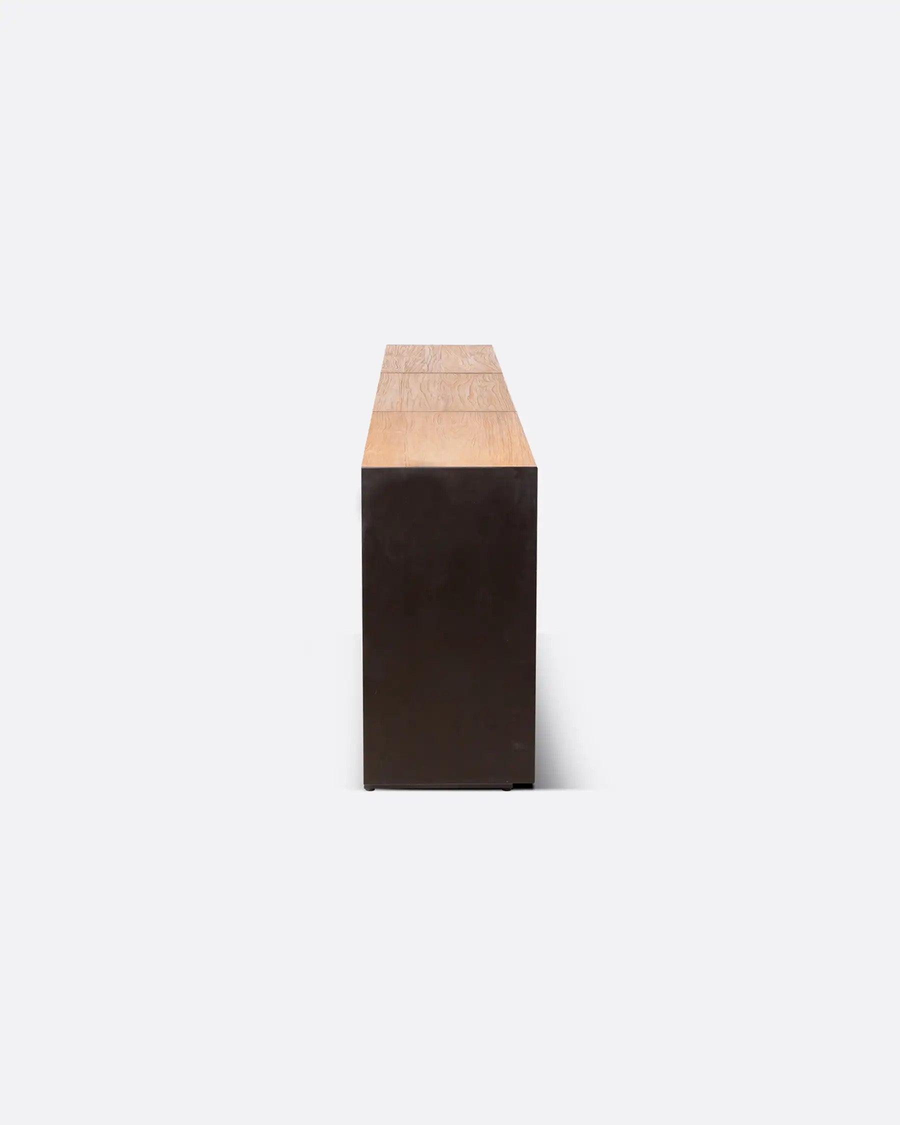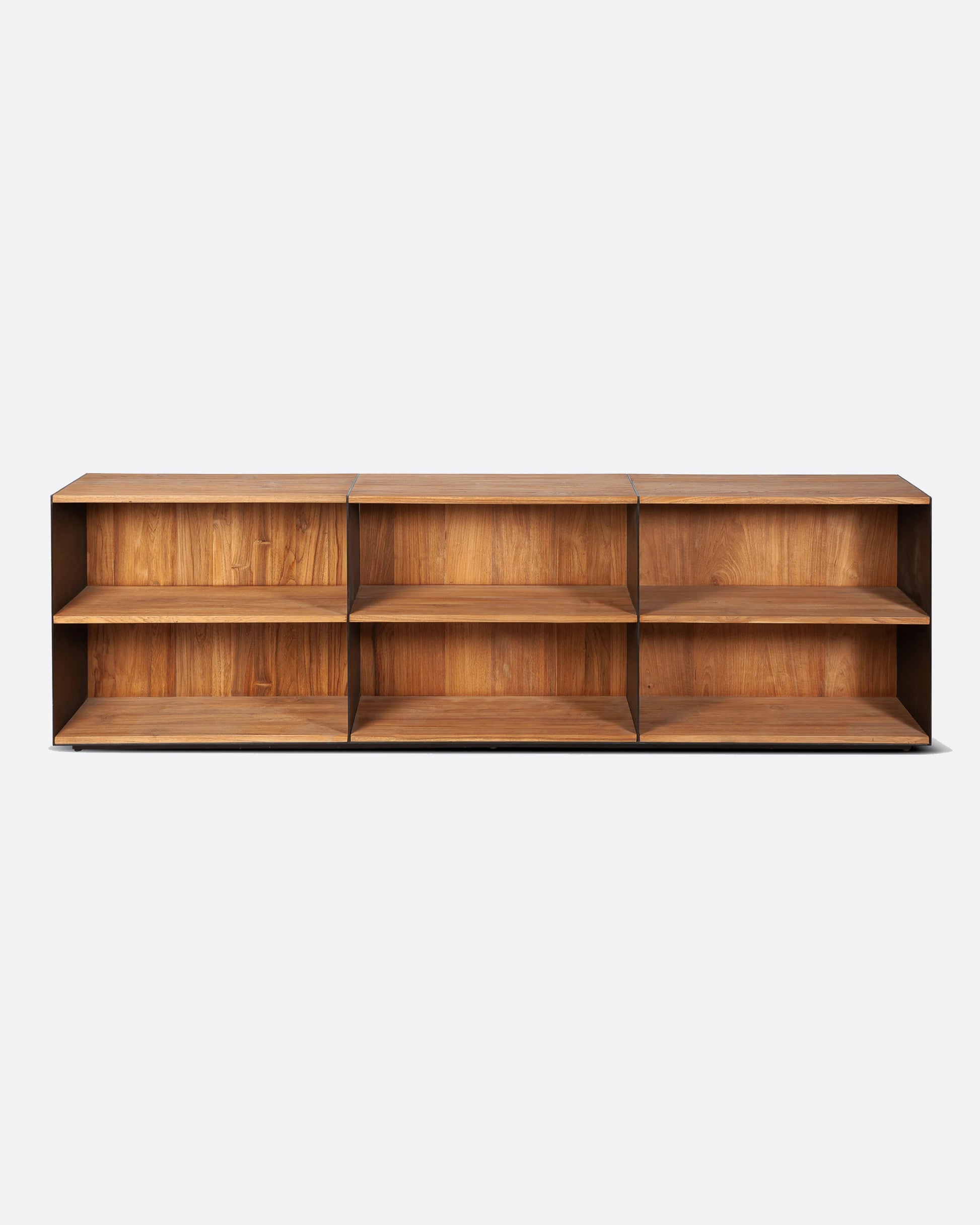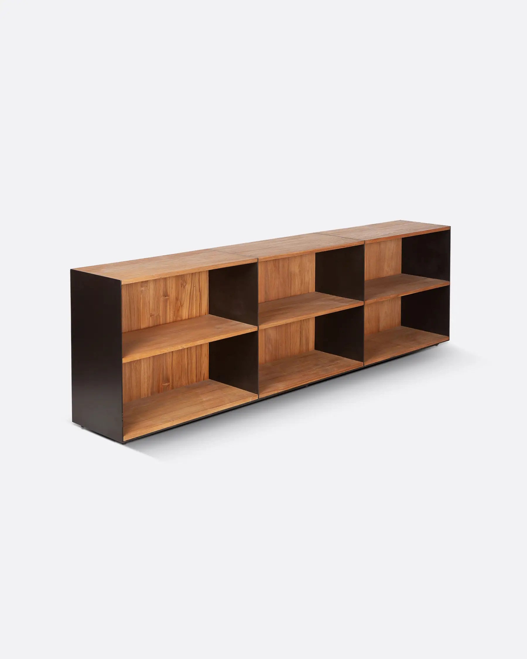 A estante GEOX combina o aconchego da madeira teca reciclada com a sofisticação do ferro com acabamento preto, criando peças de estilo industrial com linhas minimalistas. .