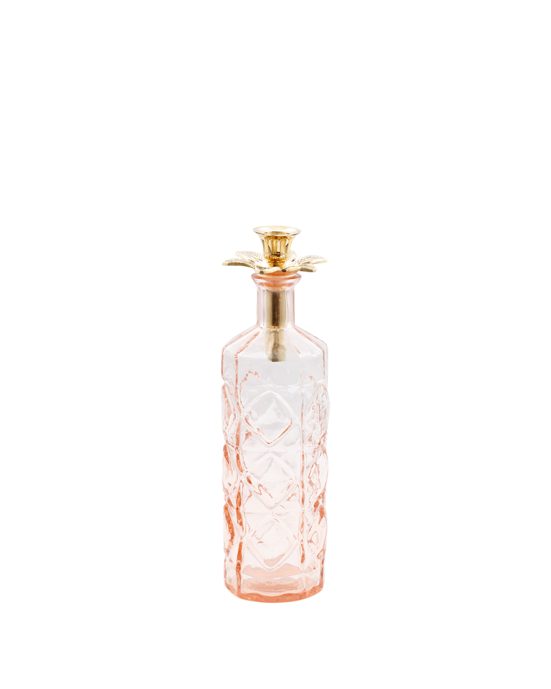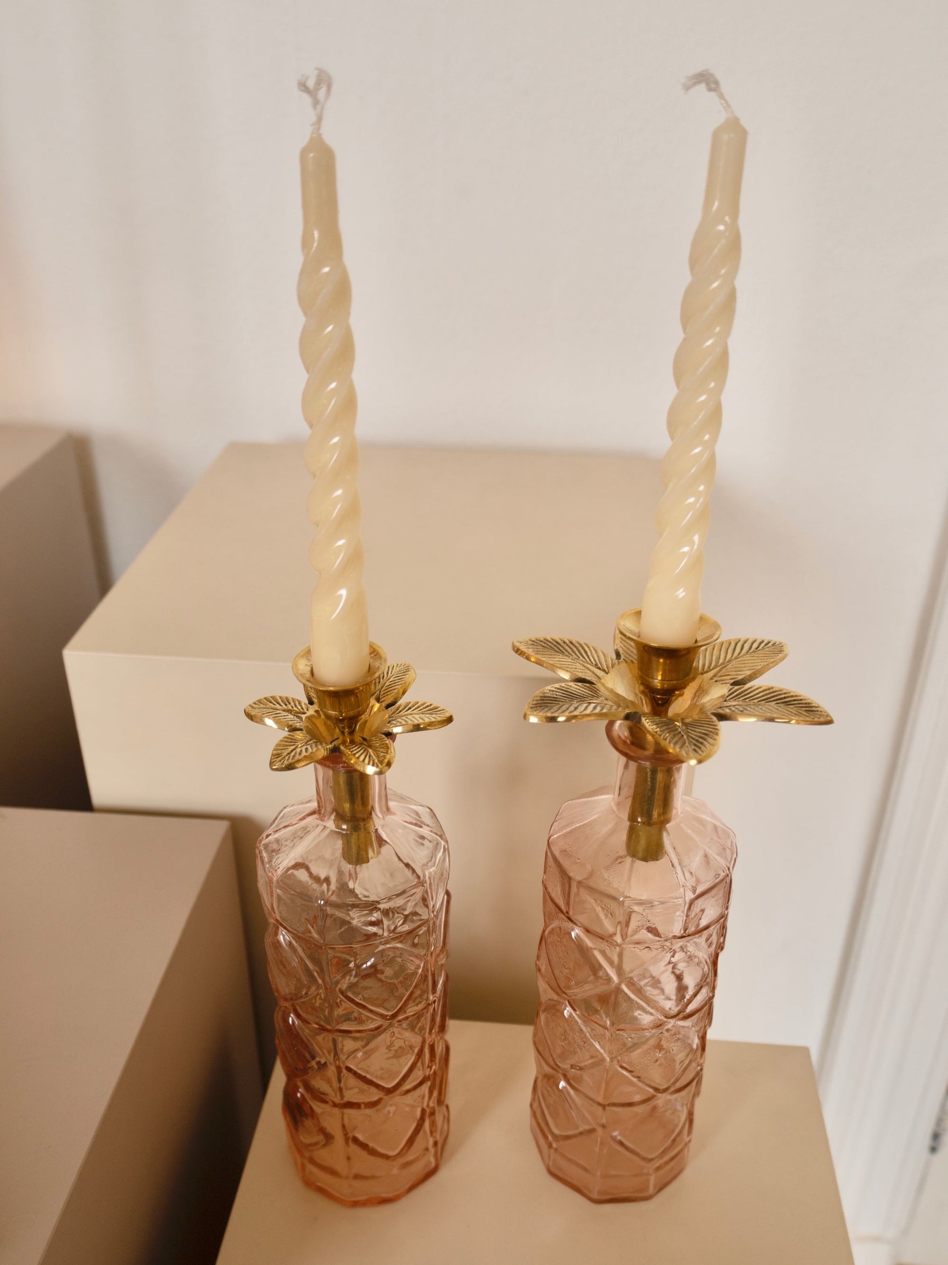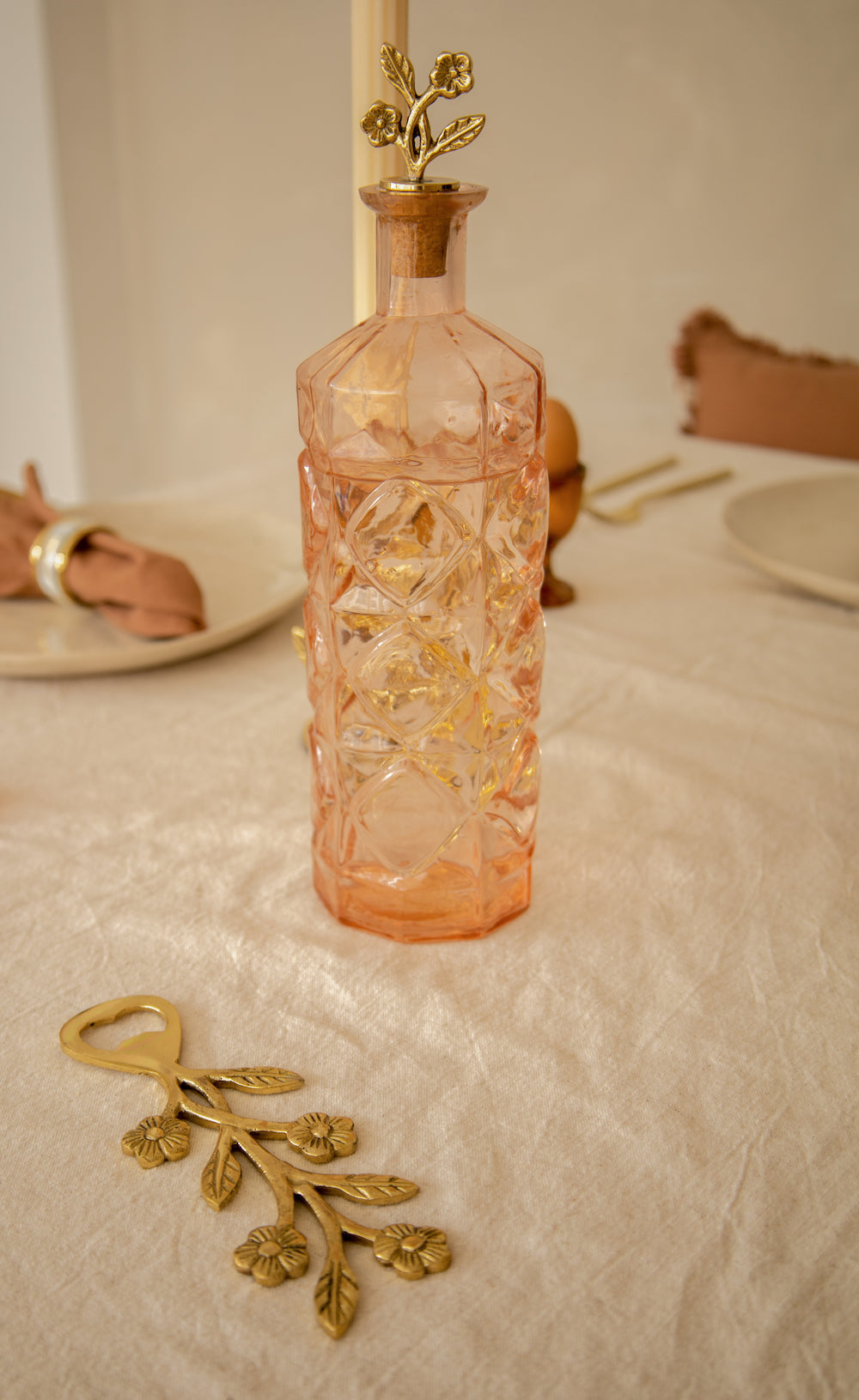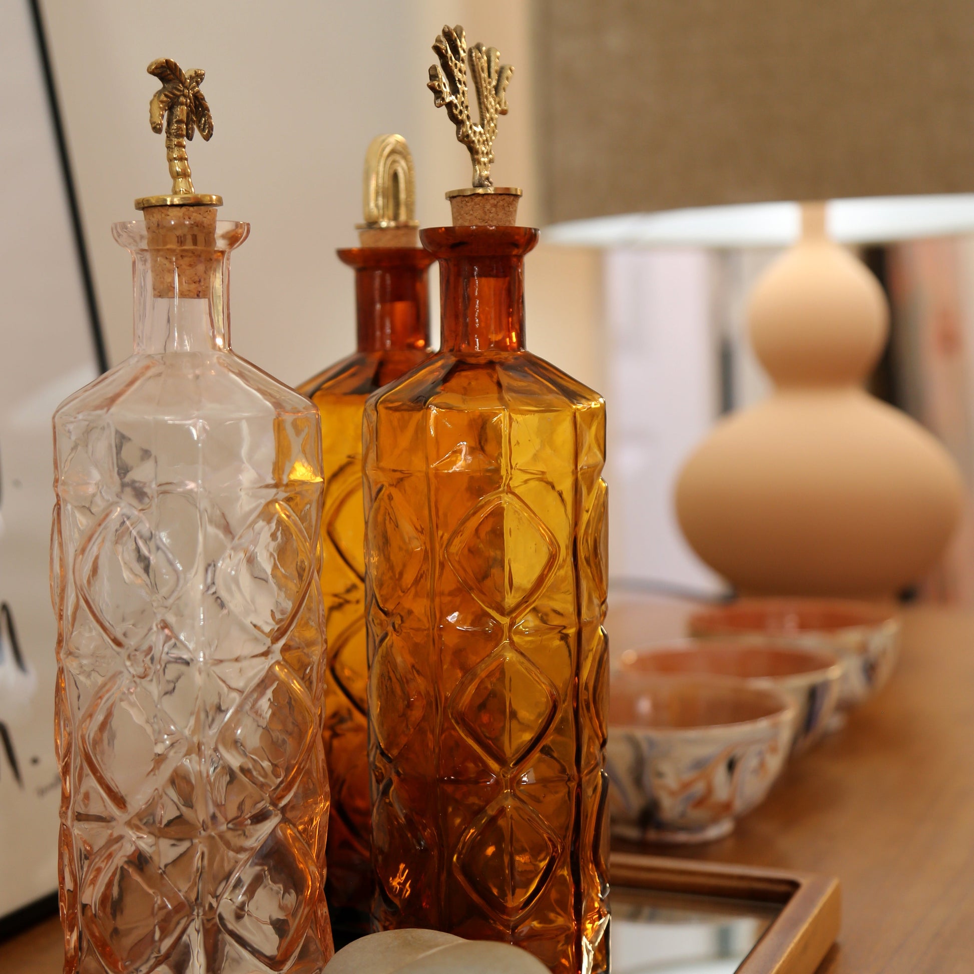 Garrafas em vidro soprado, nas cores mostarda e rosa coral. São peças decorativas mas também podem ser usadas na mesa para servir bebidas.