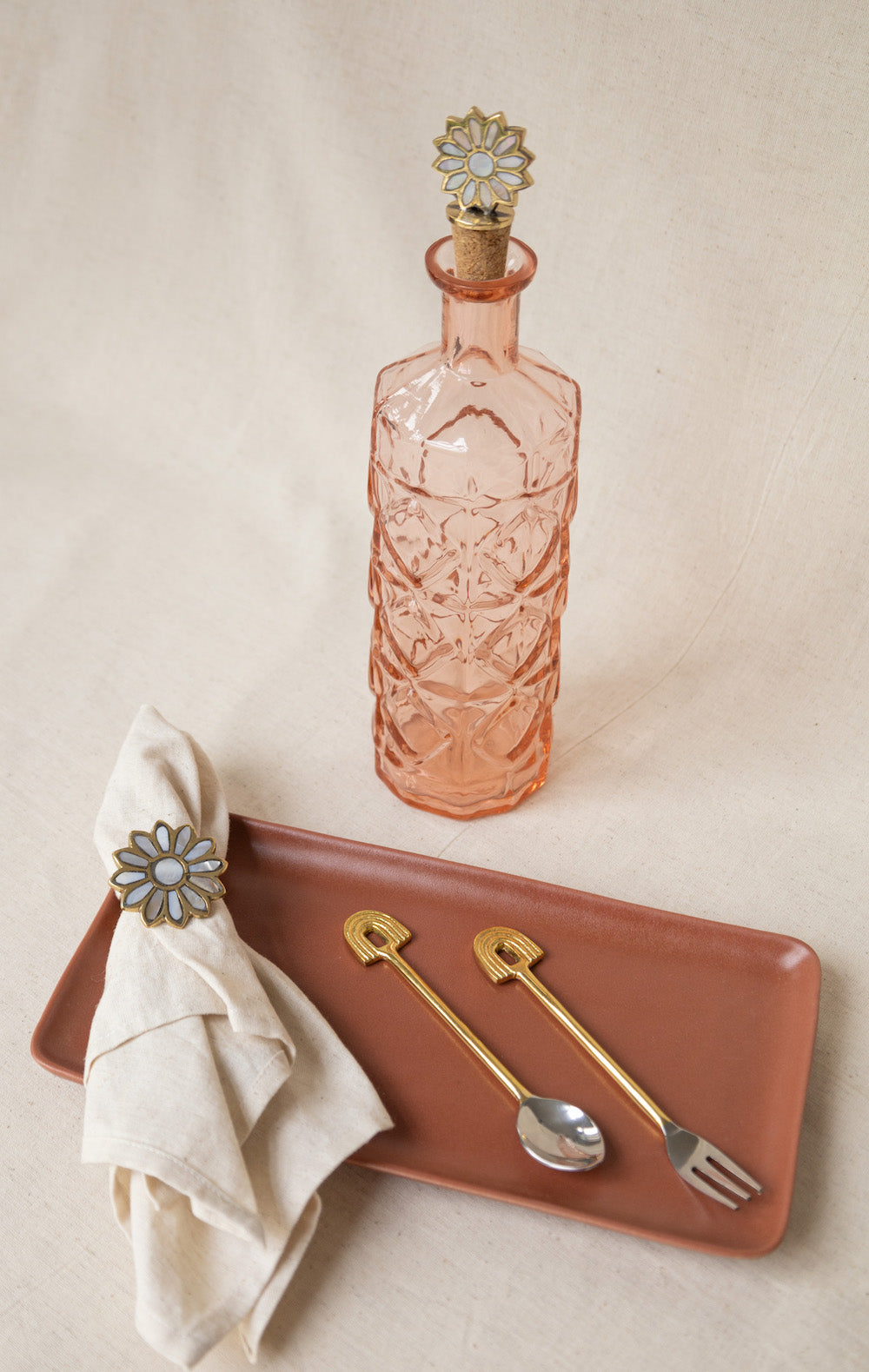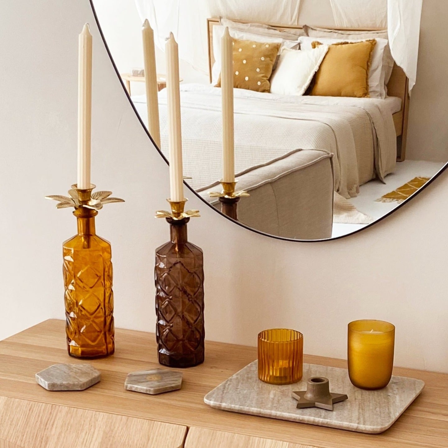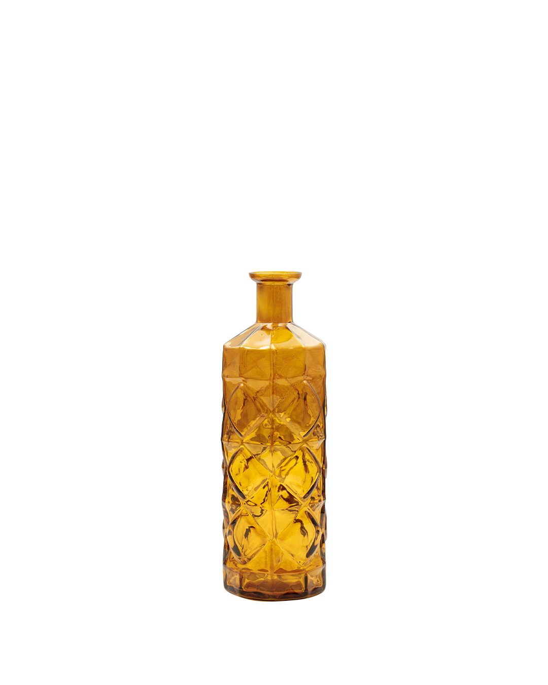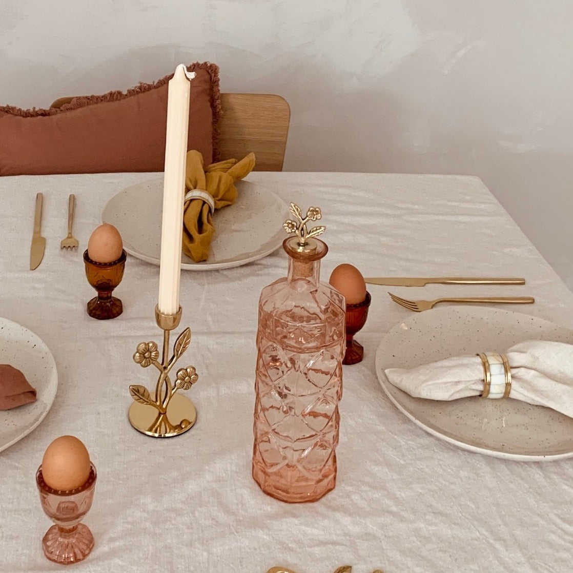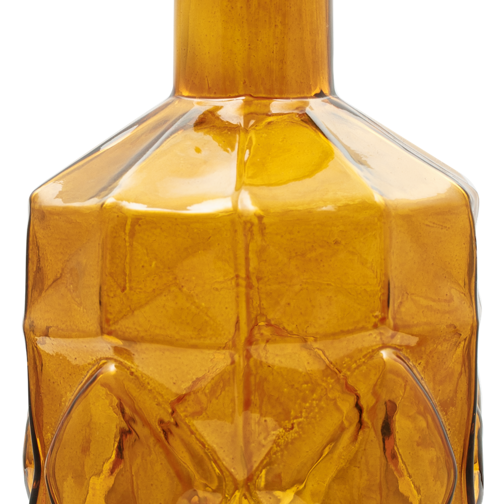 Garrafas em vidro soprado, nas cores mostarda e rosa coral. São peças decorativas mas também podem ser usadas na mesa para servir bebidas.