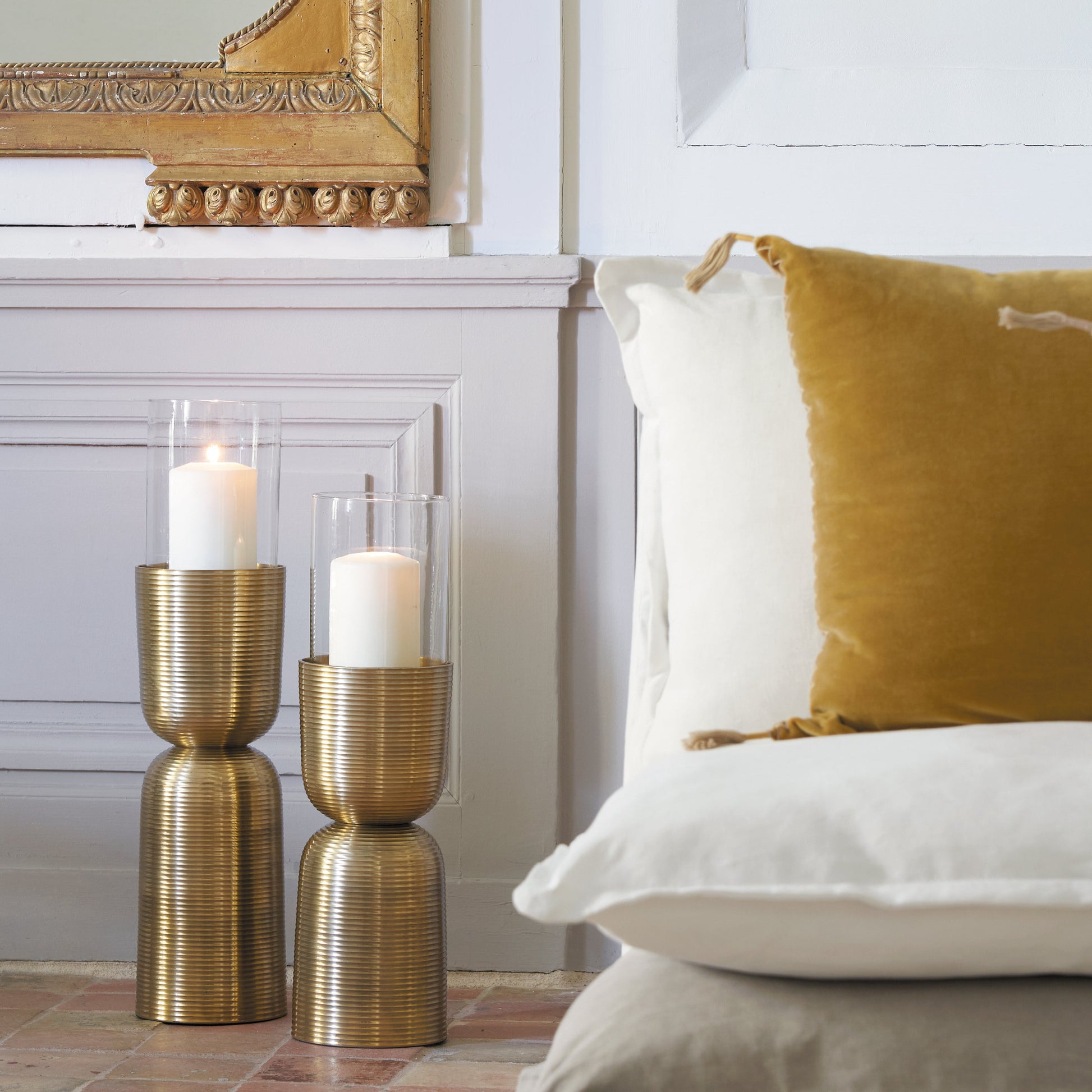 Estes majestosos porta-velas são como uma jóia. As suas bases são em metal com acabamento em latão e têm uma peça amovível em vidro, que permite colocar a vela à sua escolha. São peças como estas, que iluminam a casa de uma forma quente e acolhedora. Disponíveis em 4 tamanhos.