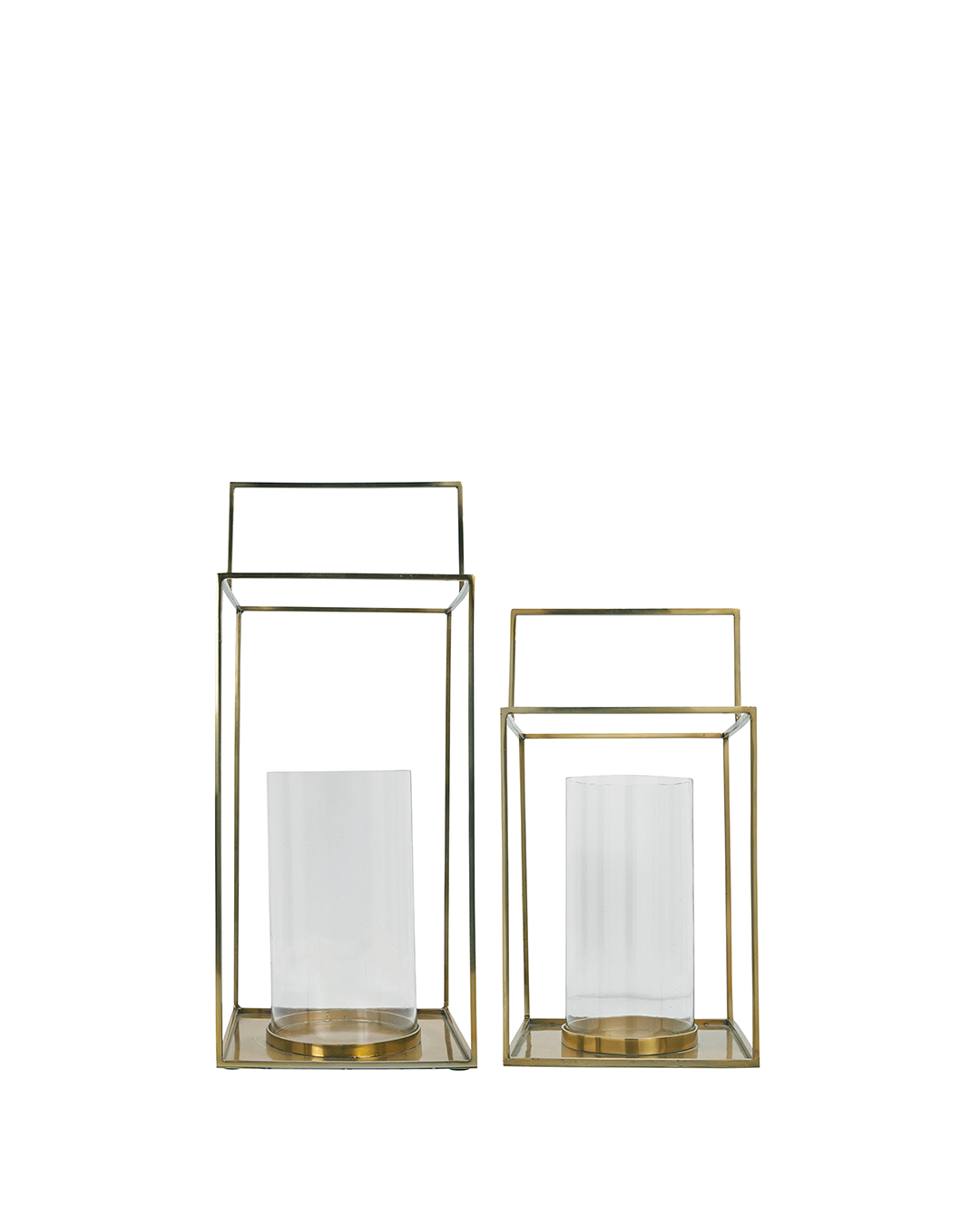 Estas elegantes lanternas em latão para velas, enchem a sua casa de brilho e estilo. Desenhadas com uma pega na parte superior para um fácil transporte e adaptabilidade a vários ambientes. Recomendamos a sua limpeza com um pano seco e evitar a utilização de produtos químicos. Podem ser utilizadas em terraços cobertos, desde que protegidas de fenómenos atmosféricos. Escolha entre o conjunto de duas de diferentes medidas, ou uma única grande retangular.