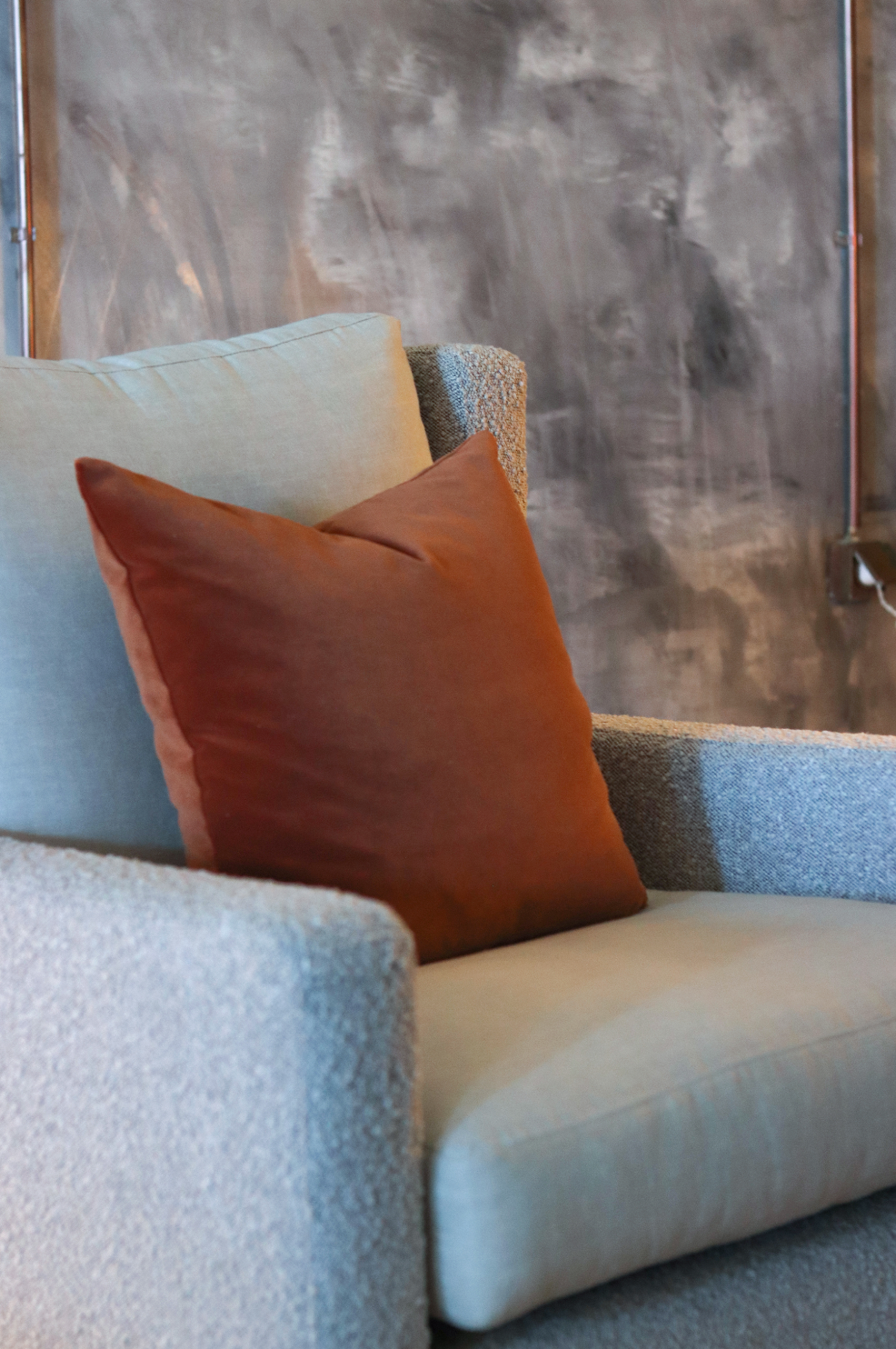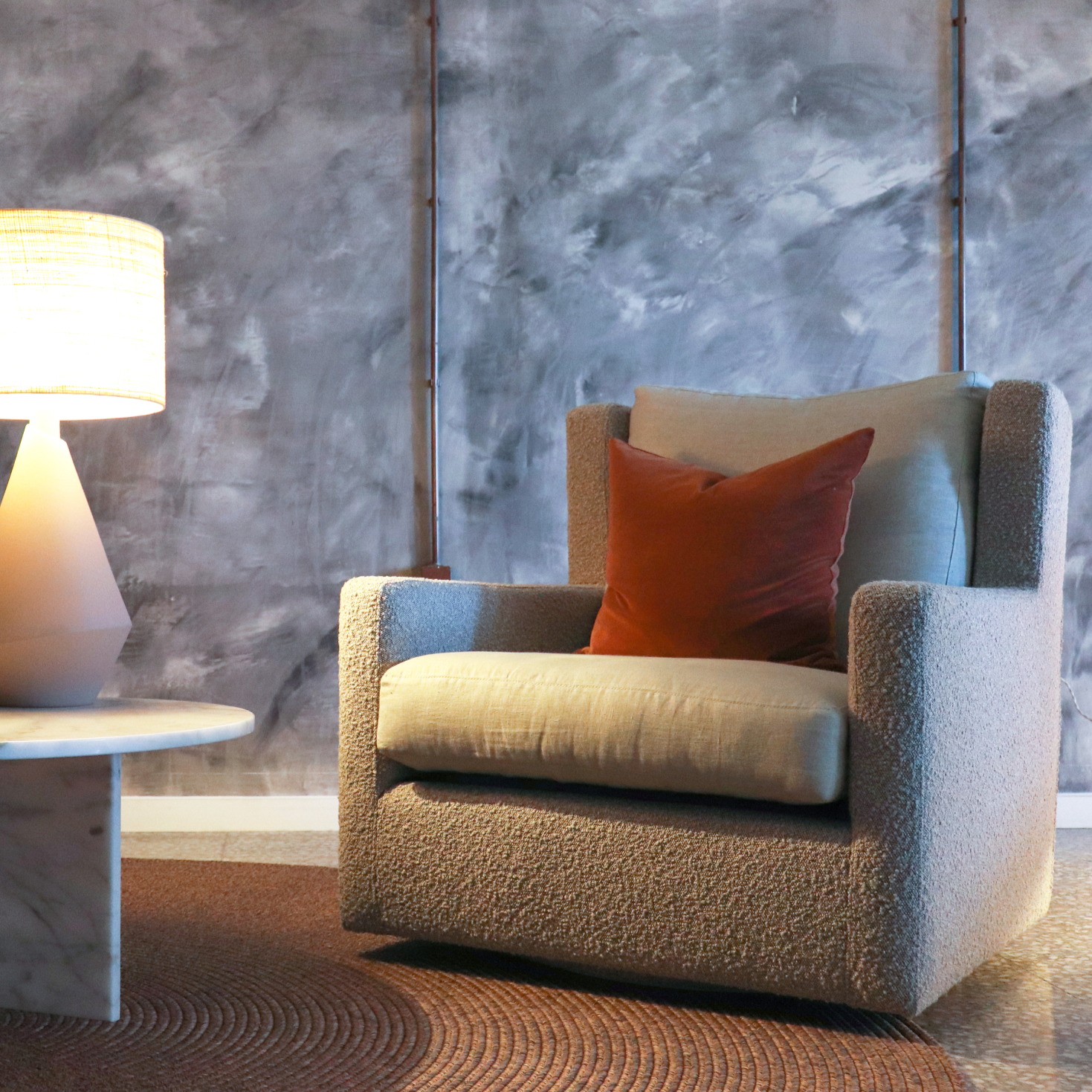 Maple com estrutura e braços com estofo em tecido bouclé e almofadas (costas e assento) num tecido alinhado, ambos numa elegante cor cinza pedra. O sistema giratório é de excelente qualidade e o conforto e a ergonomia deste maple, é muito mais do que se possa imaginar.