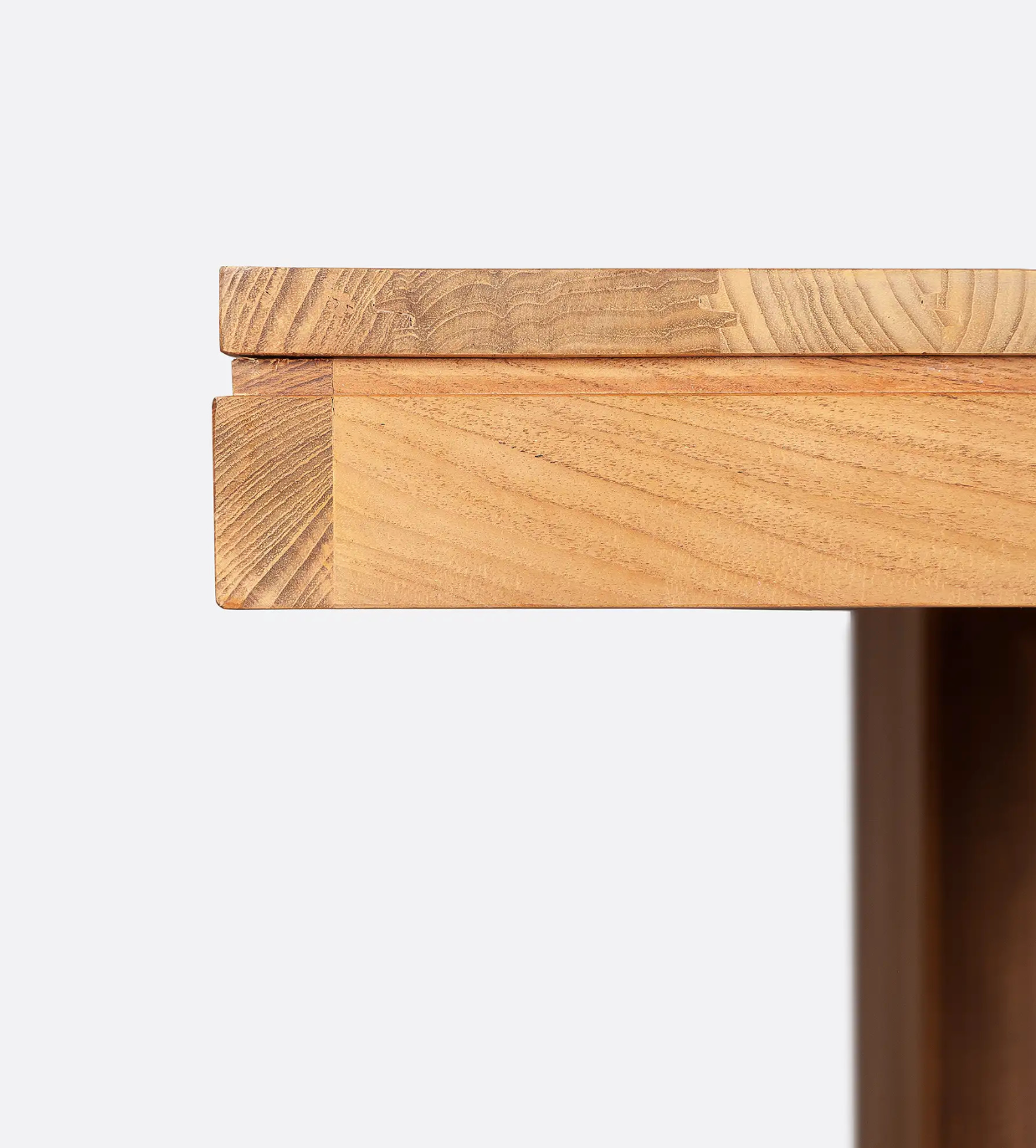 A mesa KERBANG exala a solenidade e a sobriedade de um altar. Dois pedestais robustos reforçam a sua presença e suportam um tampo igualmente robusto que proporciona amplo espaço para as pernas. O recorte que contorna a borda do tampo se repete nas pernas, dando continuidade ao design.
