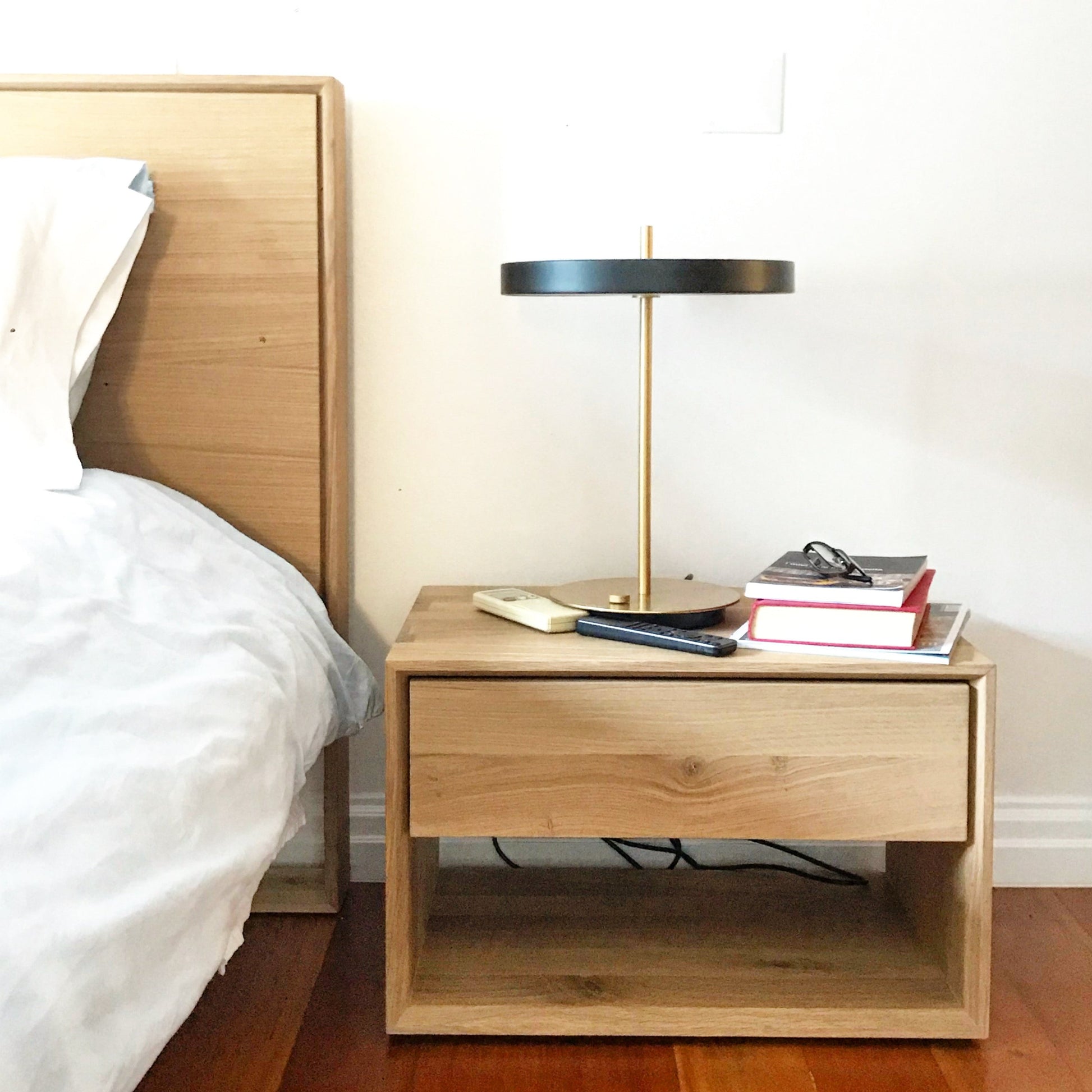 Mesa de cabeceira com design atemporal e elegante, produzida em carvalho maciço com acabamento a óleo de cera dura. Materiais de alta qualidade e um incrível trabalho de marcenaria, pois é feito com encaixes de precisão, sem se ver as junções.