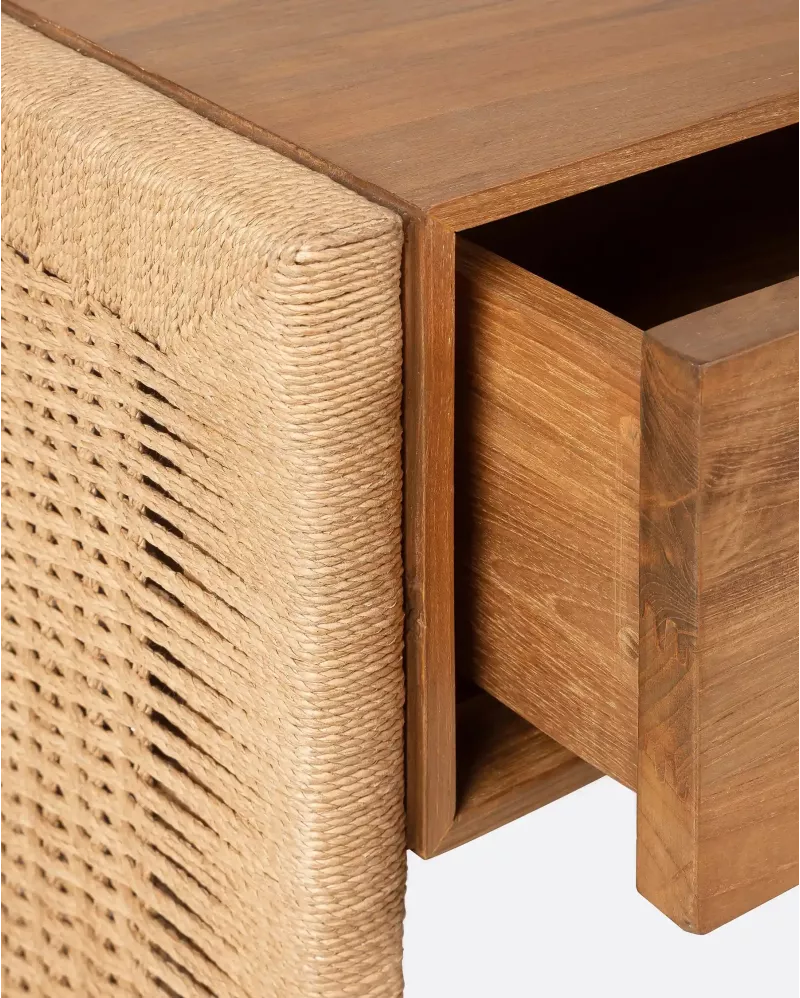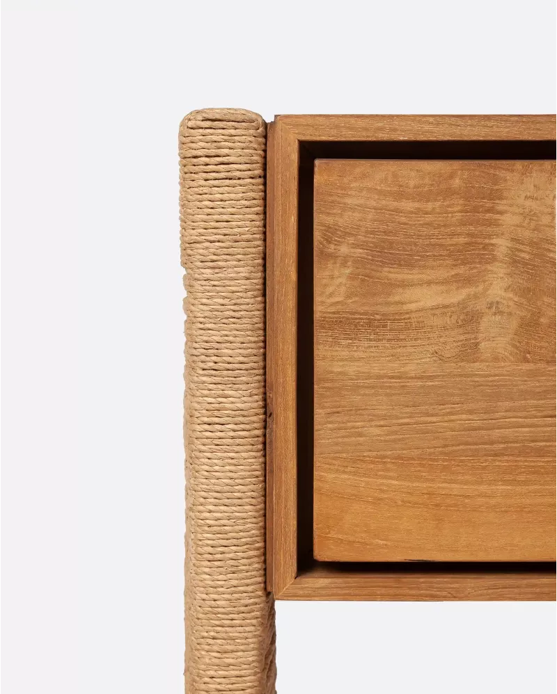 A mesa de cabeceira TAROK é feita de madeira de teca reciclada e corda entrelaçada. A sua estrutura em sólida madeira é equipada com uma gaveta central e dois painéis laterais que funcionam como pés totalmente revestidos a corda. É uma peça de mobiliário muito original e charmosa para ter no seu quarto e pode conjugar com a cama Tarok, também com o mesmo design e acabamento.