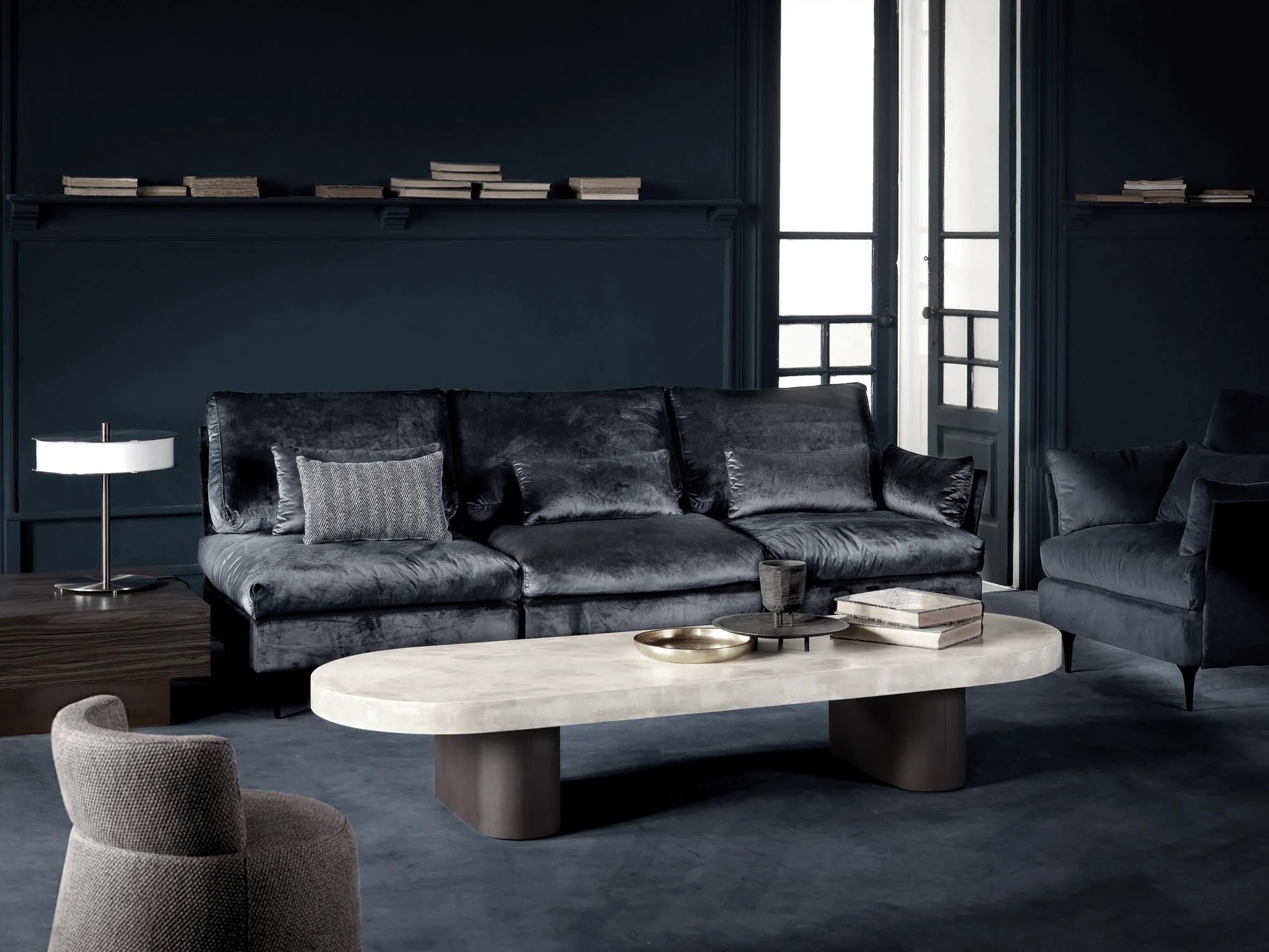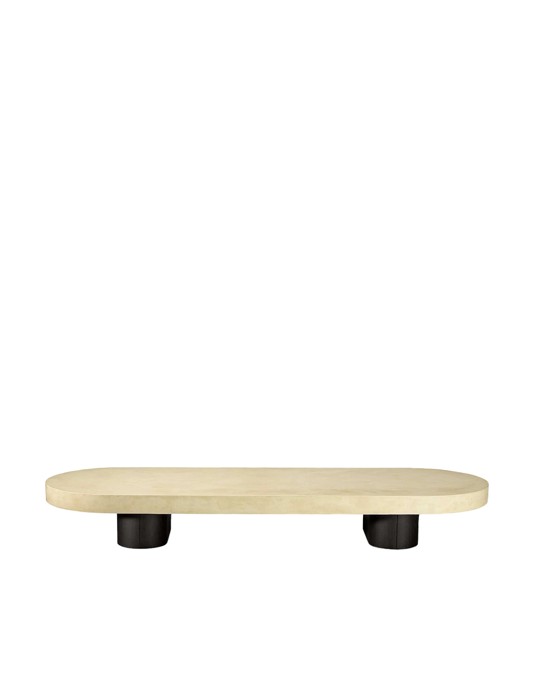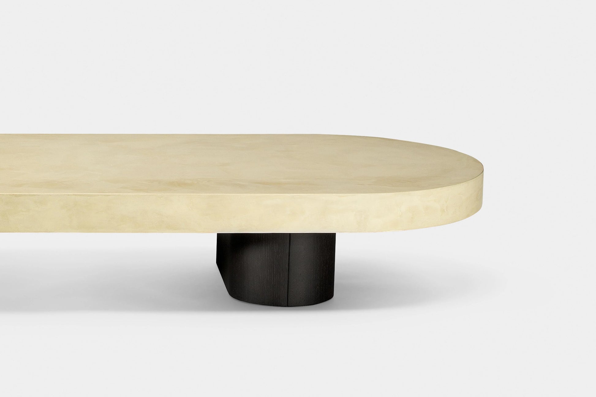 A mesa de centro segue a tendência do brutalismo, sem nunca deixar de lado o equilíbrio e a elegância. Esta é a versão com tampo em microcimento (cinza quente) e pés em madeira com acabamento (carvalho fumado).