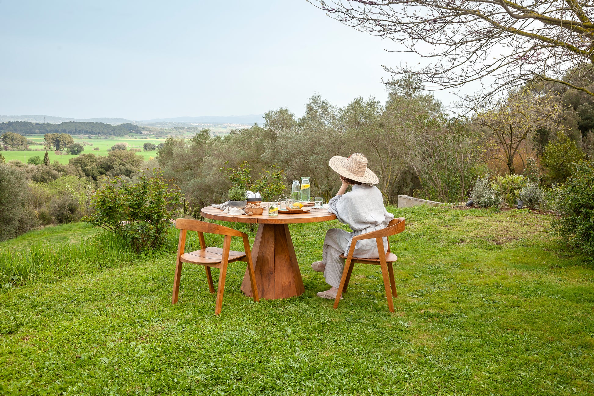 Magnífica mesa de exterior em madeira que se destaca pela sua forma marcante.