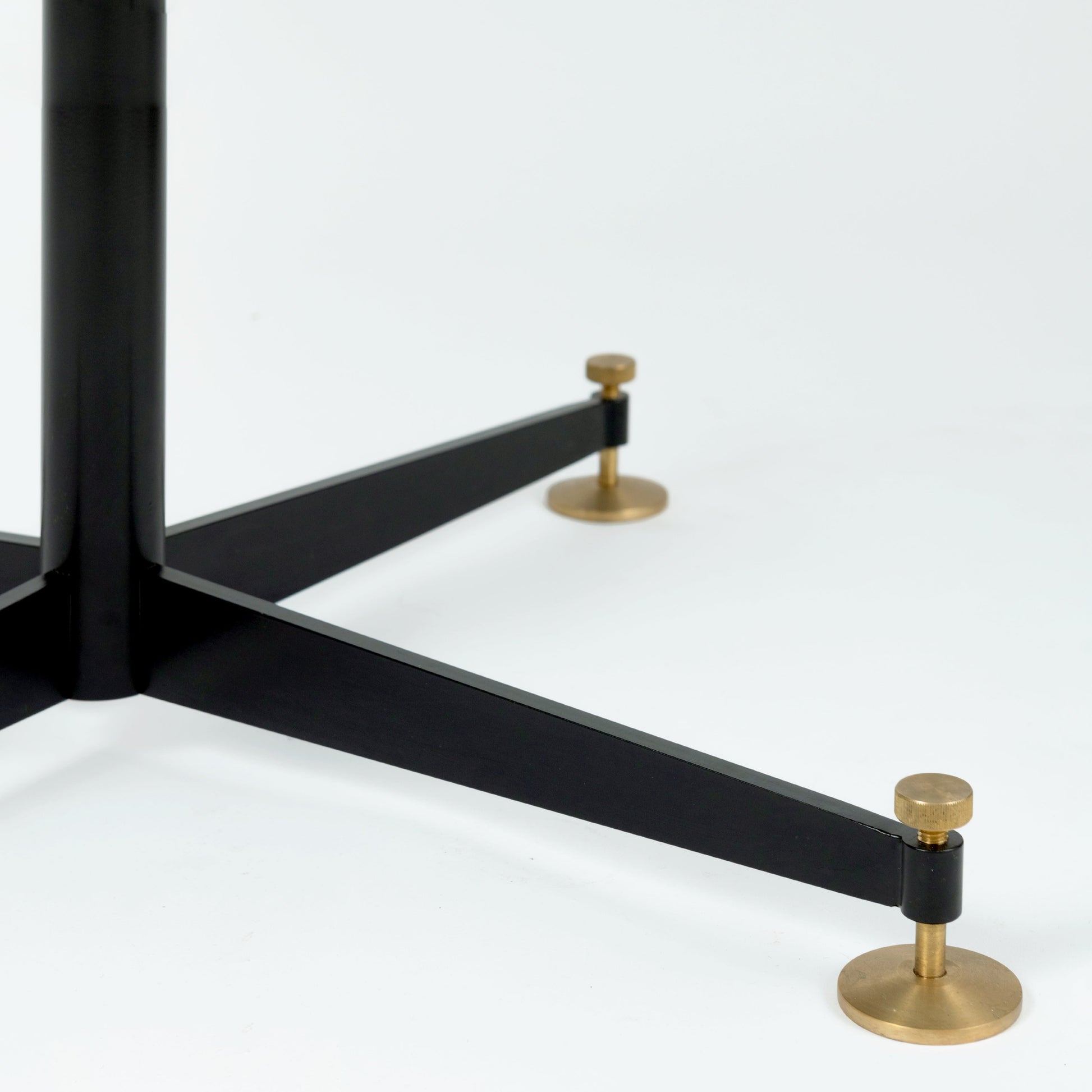 O tampo é em madeira lacada preto mate, pé em ferro termolacado com elegantes detalhes em latão.