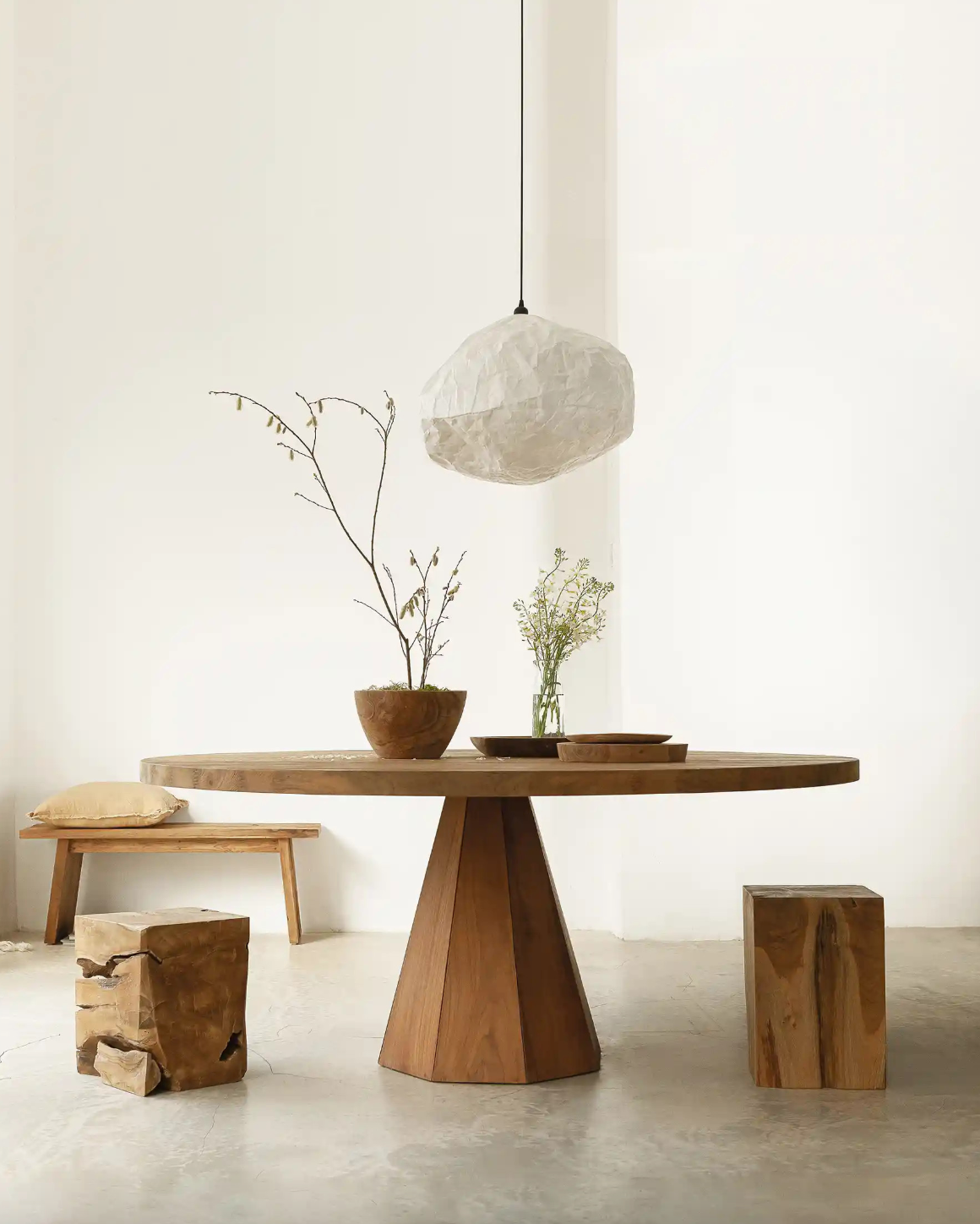 A mesa redonda Jati, é feita inteiramente de teca reciclada, e é provavelmente a versão mais orgânica da família. Seu distinto tampo sólido de espessura imponente acenta sobre uma base central incomum: um poliedro octogonal feito de ripas de madeira que se dobram e giram para criar um efeito origami, num equilíbrio perfeito entre delicadeza e firmeza.