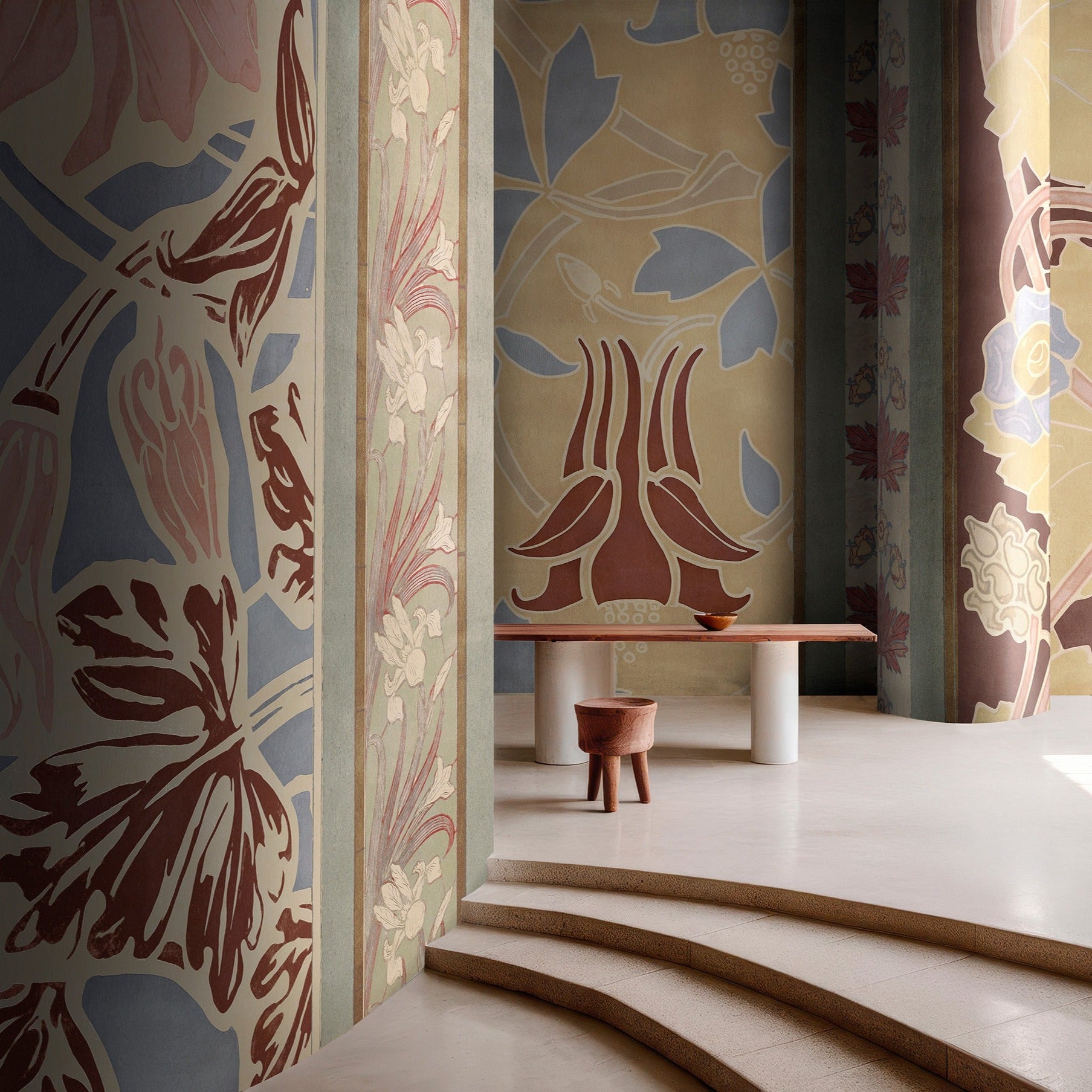 Os elementos que se destacam são os padrões de flora, reinterpretados num tom contemporâneo. Essa reinterpretação cria um efeito visual capaz de transformar qualquer espaço, conferindo-lhe um caráter distinto e artístico, enriquecendo a arquitetura do ambiente.
