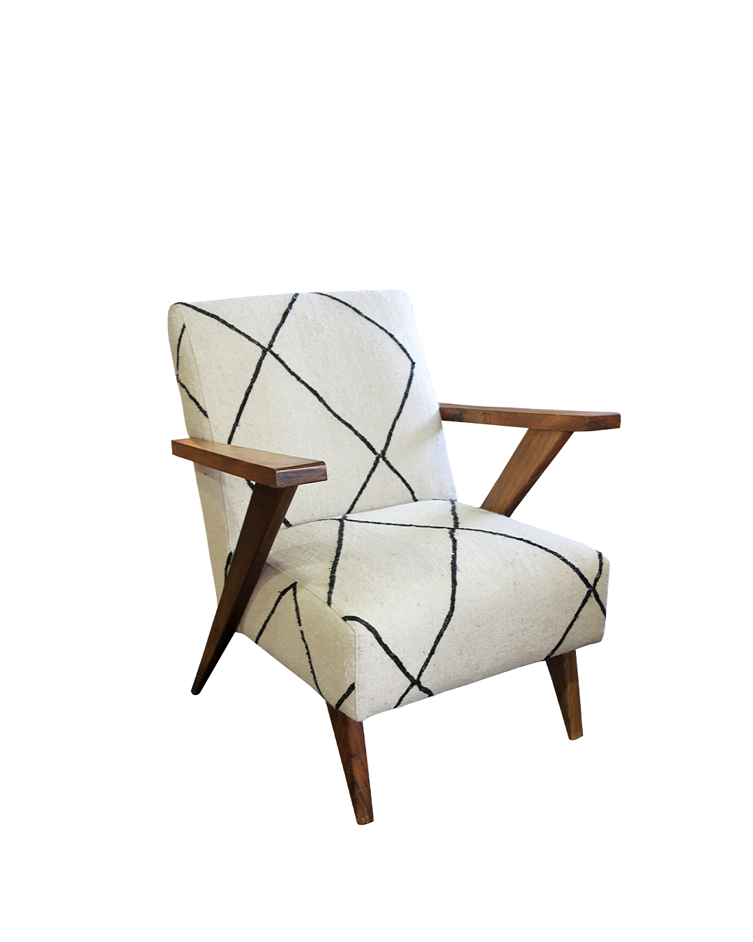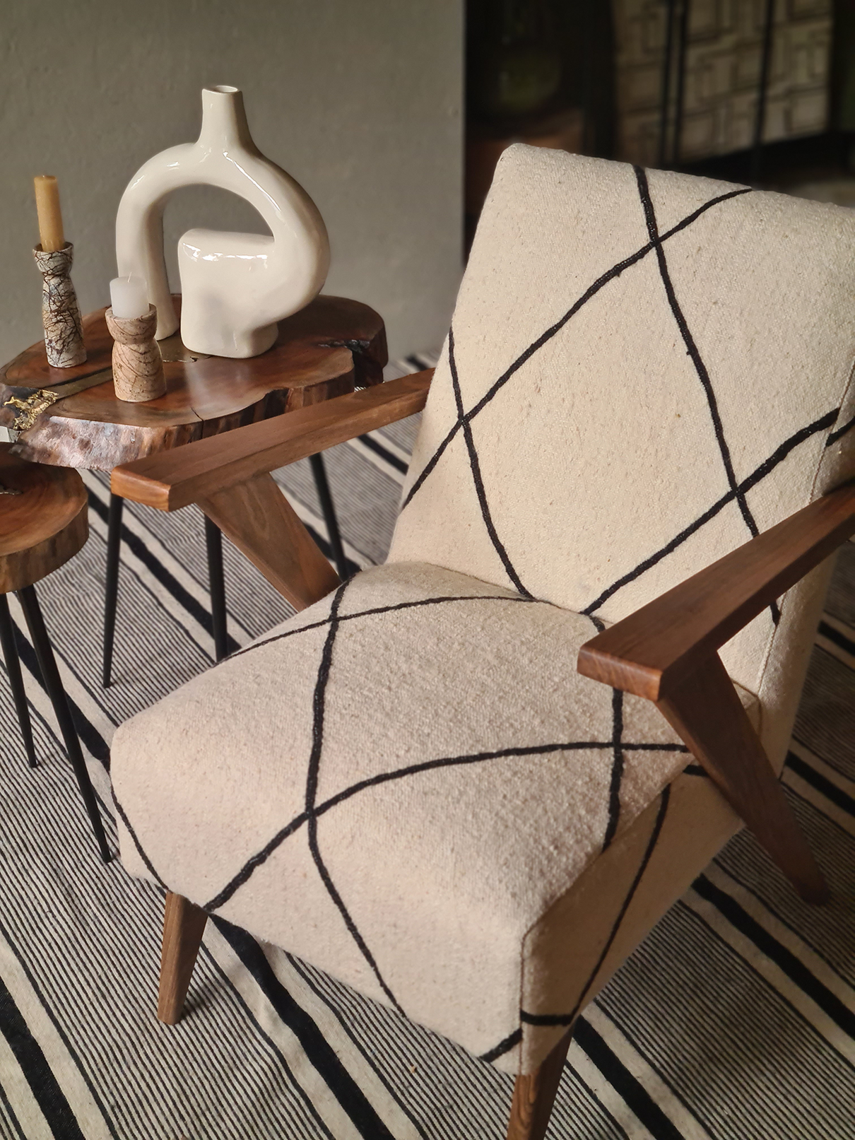 Poltrona com estrutura em madeira de Nogueira, com estofo em manta Berbere. Os materiais e a produção artesanal desta peça, tornam-na tão única que marcará a diferença em qualquer ambiente.