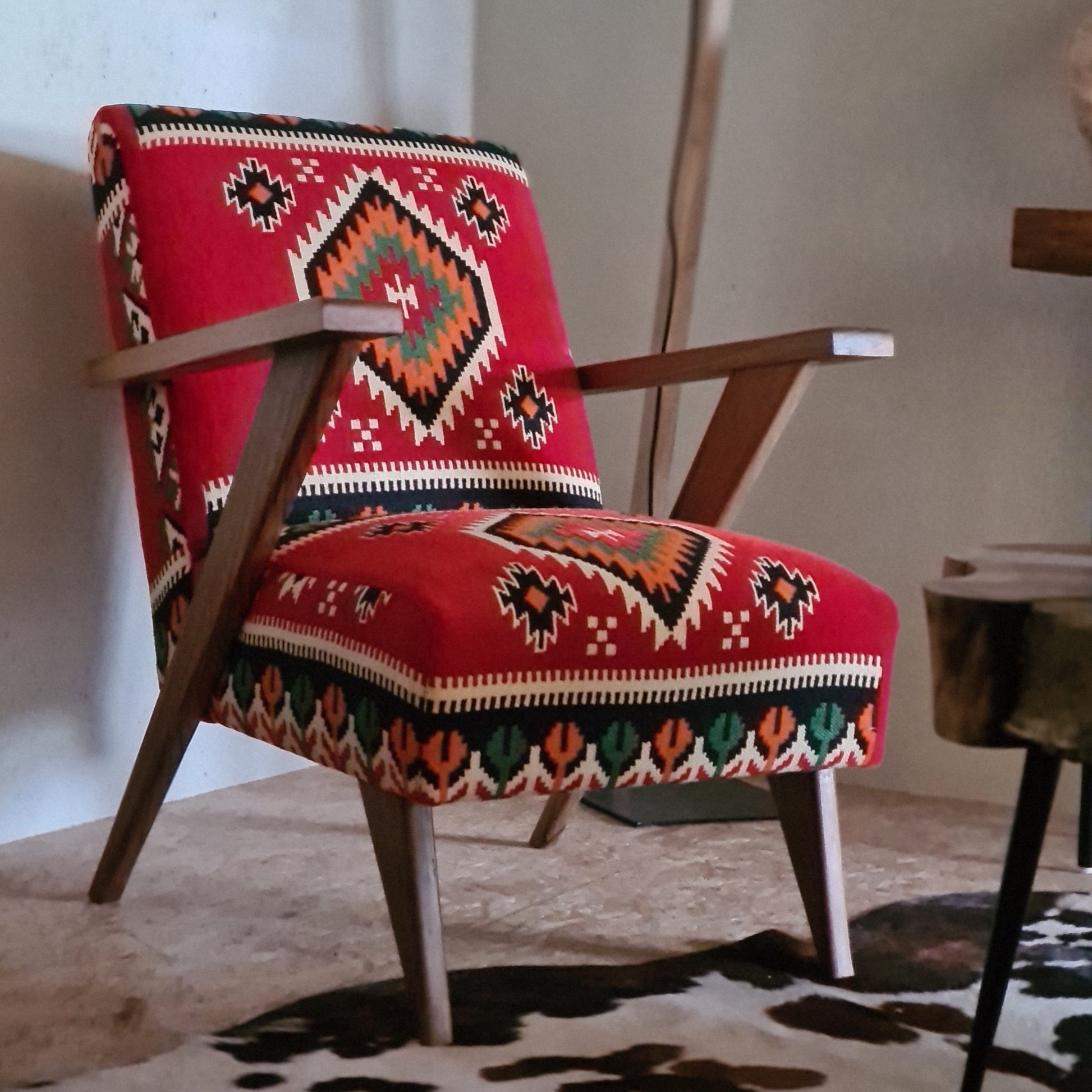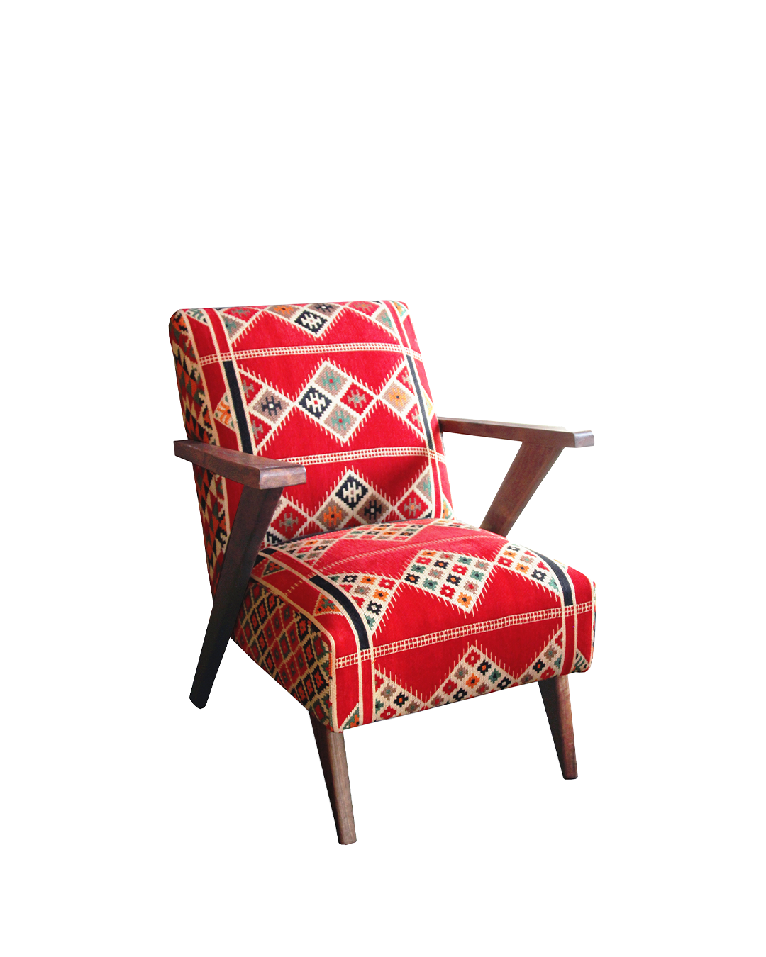 Poltrona com estrutura em madeira de Nogueira, com estofo em manta Berbere.